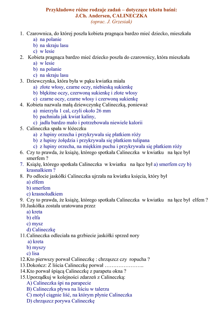 Przykładowe różne rodzaje zadań – dotyczące tekstu baśni: J.Ch. Andersen, CALINECZKA (oprac. J. Grzesiak) 1. Czarownica, do której poszła kobieta pragnąca bardzo mieć dziecko, mieszkała a) na polanie b) na skraju lasu c) w lesie 2. Kobieta pragnąca bardzo mieć dziecko poszła do czarownicy, która mieszkała a) w lesie b) na polanie c) na skraju lasu 3. Dziewczynka, która była w pąku kwiatka miała a) złote włosy, czarne oczy, niebieską sukienkę b) błękitne oczy, czerwoną sukienkę i złote włosy c) czarne oczy, czarne włosy i czerwoną sukienkę 4. Kobieta nazwala małą dziewczynkę Calineczką, ponieważ a) mierzyła 1 cal, czyli około 26 mm b) pachniała jak kwiat kaliny, c) jadła bardzo mało i potrzebowała niewiele kalorii 5. Calineczka spała w łóżeczku a) z łupiny orzecha i przykrywała się płatkiem róży b) z łupiny żołędzia i przykrywała się płatkiem tulipana c) z łupiny orzecha, na miękkim puchu i przykrywała się płatkiem róży 6. Czy to prawda, że książę, którego spotkała Calineczka w kwiatku na łące był smerfem ? 7. Książę, którego spotkała Calineczka w kwiatku na łące był a) smerfem czy b) krasnalkiem ? 8. Po odlocie jaskółki Calineczka ujrzała na kwiatku księcia, który był a) elfem b) smerfem c) krasnoludkiem 9. Czy to prawda, że książę, którego spotkała Calineczka w kwiatku na łące był elfem ? 10.Jaskółka została uratowana przez a) kreta b) elfa c) mysz d) Calineczkę 11.Calineczka odleciała na grzbiecie jaskółki sprzed nory a) kreta b) myszy c) lisa 12.Kto pierwszy porwał Calineczkę : chrząszcz czy ropucha ? 13.Dokończ: Z liścia Calineczkę porwał ………………….. 14.Kto porwał śpiącą Calineczkę z parapetu okna ? 15.Uporządkuj w kolejności zdarzeń z Calineczką: A) Calineczka śpi na parapecie B) Calineczka pływa na liściu w talerzu C) motyl ciągnie liść, na którym płynie Calineczka D) chrząszcz porywa Calineczkę