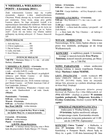 V NIEDZIELA WIELKIEGO POSTU - 6 kwietnia 2014 r. Znak wskrzeszenia Łazarza staje się w pełni zrozumiały dopiero w dniu zmartwychwstania Chrystusa. Wtedy okazuje się, że tryumf nad śmiercią jest ostateczny. Teraz Jezus, stojąc przy grobie Łazarza, płacze, bo Jego przyjaciel wszedł w to najstraszniejsze doświadczenie ludzkości. Miłość każe jednak pójść dalej, dlatego Pan budzi go do życia raz jeszcze. „Udzielę wam ducha mego po to, byście ożyli”. Życie nie ma końca i tej właśnie nadziei próbujemy się dzisiaj uchwycić. O. Tomasz Zamorski OP. PIEŚNI MSZALNE 1. Ach mój Jezu…................90 2. O Krwi najdroższa………104 3. Daj mi Jezusa................…292 4. Ludu, mój ludu…..………100 5. Jezu Chryste........………...95 INTENCJE MSZALNE 7:00 PM + Marianna Matys w 3 r. śm. – od córki Barbary. (Lantana). V NIEDZIELA W. POSTU – 6 kwietnia. 9:00 am + Wiktoria i Franciszek Smagała oraz zm. z rodz. – od córki Zofii H. z rodz. 11:00 am 1/ + Helena i Urban Buryń i za poległych żołnierzy pod Monte Cassino – od Janiny Bandrimer, Stanley Buryń i dzieci. 2/ + Józef Mularczyk (zm. 28.II) weteran walczący pod Monte Cassino – od Polish American Club of Fort Lauderdale „Polonez”. 3:30 PM + Bronisławę, Władysław i Gustaw oraz zm. z rodz. Daniłowskich – od rodz. Gacek. (Miami). Poniedziałek – 7 kwietnia. 8:00 am – wolna intencja. Wtorek – 8 kwietnia. 8:00 am – za Parafian i Dobrodziejów. Key West 7:00 PM – wolna intencja. Ze względu na wyjazd do Key West w środę nie będzie Mszy św. w naszym kościele. Czwartek – 10 kwietnia. 8:00 am – wolna intencja. Piątek – 11 kwietnia. 6:30 PM - Droga Krzyżowa. 7:00 PM – w intencji naszej Ojczyzny oraz o Boże łaski dla pracowników Radia Maryja i TV Trwam. Sobota – 12 kwietnia. 8:00 am + Adam Janz – żona i dzieci. 7:00 PM + Łucja Izdebska – od Ewy Kasprzyk z rodz. (Lantana). NIEDZIELA PALMOWA – 13 kwietnia. 9:00 am + Roy Howson w 17 r. śm. i zm. z rodz. – od Zofii H. 11:00 am + Adam Jabłoński – córka. 3:30 PM 1/. - o Boże łaski dla rodziny i przyjaciół – od Zofii Martin. 2/. - o Boże łaski dla Tiny Chomicz – od Jadwigi i Przyjaciół. (Miami). WITAM SERDECZNIE – ks. Zdzisława Nawrockiego, SChr., który będzie obecny u nas przez trzy niedziele, posługując aż do świąt Wielkanocnych. KONCERT – w najbliższy piątek 11 kwietnia wystąpi w naszym kościele Ewa WartaŚmietana, koncert muzyki poważnej, po Mszy św. o 7:00 PM. NOWI PARAFIANIE – witam serdecznie kolejną rodzinę w naszej wspólnocie Polskiej Misji: Marlena i Adam NEHME. LISTY ŚWIĄTECZNE – zostało wysłanych 692 listów (2008-670; 2009-687; 2010-701; 2011-712, 2012-709; 2013-694). Osoby, które nie otrzymały takiego listu, proszone są o podanie aktualnego adresu do biura Misji. Dziękuję! KAWIARENKA - Zgłoszenia dyżurów proszę kierować do Państwa Ewy i Irka Otfinowskich, tel. (954) 422-5434 – dziękuję za pomoc! W ostatnim tygodniu posługiwały: Małgorzata Kowalska i Ewelina Grabowska. Dochód wyniósł $270. Bóg zapłać! SPRZEDAŻ PRZEDŚWIĄTECZNA – tradycyjnie w Wielką Sobotę, to jest 19 kwietnia, będzie możliwość zakupu świątecznego ciasta. Kawiarenka otwarta będzie podczas święcenia pokarmów od 11:00 am do 2:00 PM. Zapraszamy! KONCERT Chóru "Lutnia" - z Malborka, w dniu 27 kwietnia 2014r. w Polskiej Misji Katolickiej w Pompano Beach, obecni będą na Mszy św. o godz. 11:00 dniu kanonizacji Bł. Jana Pawła II. Chór ma w swoim repertuarze opracowany śpiew liturgiczny oraz utwory sakralne jak również pieśni patriotyczne i ludowe. Po Mszy św. chór da koncert pieśni. * W tym dniu nie będzie Mszy św. niedzielnej w Miami w kościele św. Józefa o godz. 3:30 PM. OGŁOSZENIA POLONIJNE Zespół teatralny “Bez Wizy” zaprasza na znakomitą sztukę B. Hertza pt. “Czupurek”, czyli podwórkowy romans. Komedia w 2 aktach dla dorosłych i dla dzieci. Premiera 27 kwietnia 2014 (niedziela) o godz. 5:30 PM w AmerykańskoPolskim Klubie “Sobieski” (znany również jako klub na Lake Worth Rd), 4725 Lake Worth Rd., Greenacres, FL 33463. Wstęp, dorośli $15.00, dzieci $5.00. Po więcej informacji ZAPRASZAMY na stronę www.bezwizy.com DYŻUR KONSULARNY – odbędzie się na w Pompano Beach w Polskiej Misji w dniach 6,7,8 maja 2014 r. Osoby zainteresowane proszone są o wcześniejszą rejestrację w Konsulacie w Waszyngtonie telefonicznie (202) 499 1930 lub e-mail: [email protected] Oferta: kobieta poszukuje pracy, opieka nad starszą osobą; 7/7 dni w tygodniu, live-in, dobry angielski, Referencje, doświadczenie. Tel: (954) 657-8724 (3x) Oferta: sprzedam Condo (55+), w Century Village, Deerfield Beach: duża sypialnia, living room dwie łazienki cena $45 tyś., lub wynajmę $750 miesięcznie. Tel: (954) 638-6815 (2x) Oferta: wyremontowane, duże mieszkanie wdu pokojowe do wynajęcia od zaraz w Oakland Park. Tel (954) 803-9365 Aga (1x) Oferta: sprzedam lub wynajmę kondominium – własnościowe, dwie sypialnie, dwie pełne łazienki, balkon, duży salon. Osiedle strzeżone. Fort Lauderdale. Tel: (954) 918-2852 Zdzisława (3x) Oferta: poszukuję pracy, opieka z zamieszkaniem lub bez, housekeeper, posiadam Referencje. Tel: (954) 934-5026 Anna (5x) Oferta: pani poszukuje pracy: sprzątanie, gotowanie, opieka nad chorymi ludźmi, posiadam dyplom pielęgniarki Tel: (954) 274-4337 (4x) Oferta: kolekcjoner, poszukuje starych polskich obrazów przez uznanych artystów, zapłaci dobrą cenę. Tel: (954) 328-4015 Stanisław (2x) Oferta: wynajmę pokój z osobną łazienką w dwu sypialniowym mieszkaniu w Boynton Beach przy Federal Hwy., cena do uzgodnienia. Tel: (646) 2622229 (2x) *** Bł. Jan Pawł II – Starajmy się tak postępować i tak żyć, by nikomu w naszej Ojczyźnie nie brakło dachu nad głową i chleba na stole, by nikt nie czuł się samotny, pozostawiony bez opieki. Piękno tej ziemi skłania mnie do wołania o
