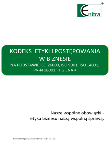 KODEKS ETYKI I POSTĘPOWANIA W BIZNESIE NA PODSTAWIE ISO 26000, ISO 9001, ISO 14001, PN-N 18001, HIGIENA + Nasze wspólne obowiązki etyka biznesu naszą wspólną sprawą. Kodeks etyki i postępowania w biznesie Enitra Sp. z o.o. Spis treści : 1. 2. 3. 4. 5. Wprowadzenie Ład w organizacji Normy i zachowania kadry zarządzającej Klienci Zobowiązania wobec siebie nawzajem BHP Środki odurzające i alkohol Prawa człowieka 6. Środowisko 7. Uczciwe zasady operacyjne Konflikt interesów Korupcja, łapówki, prezenty Konkurencja Uczciwość w transakcjach handlowych z partnerami biznesowymi i dostawcami 8. Zobowiązania pracowników wobec firmy Ochrona majątku firmy Prywatność danych 9. Odpowiedzialność społeczna 10. Zakończenie Kodeks etyki i postępowania w biznesie Enitra Sp. z o.o. 1. Wprowadzenie Kodeks etyki i postępowania w biznesie jest zbiorem zasad, który został utworzony po to, aby wyznaczyć podstawowe standardy etyczne i prawne, którymi będziemy kierować się na co dzień w naszej pracy. Uznajemy ISO 26000 za dokument odniesienia zawierający wytyczne dotyczące postępowania społecznie odpowiedzialnego. We wszystkich obszarach naszej działalności deklarujemy, że będziemy postępować etycznie. Etyczne postępowanie oznacza dla nas, że nie zrobimy czegoś, o czym nie moglibyśmy później bez wstydu opowiedzieć naszej rodzinie lub znajomym. Oznacza to, że jesteśmy uczciwi wobec siebie nawzajem, jak i wobec osób spoza firmy Enitra Sp. z o.o. W Kodeksie etyki i postępowania w biznesie opisano przykładowe sytuacje, w których będzie oczekiwało się od nas właściwego postępowania. Kodeks etyki nie daje odpowiedzi na wszystkie problemy etyczne, które mogą zaistnieć w trakcie wykonywania zadań na rzecz Firmy Enitra Sp. z o.o. – daje natomiast wytyczne, z których należy korzystać w sytuacjach, w których właściwy sposób zachowania nie jest oczywisty. Obowiązek etycznego postępowania dotyczy wszystkich pracowników zatrudnionych zarówno na umowę o pracę, jak i na umowę cywilno-prawną, bez względu na stanowisko, które piastuje w firmie Enitra Sp. z o.o. W równym stopniu dotyczy to także naszych partnerów biznesowych. Każdy pracownik firmy Enitra Sp. z o.o. odpowiada za to, aby jego postepowanie było etyczne, uczciwe i zgodne z prawem. Kodeks etyki i postępowania w biznesie Enitra Sp. z o.o. 2. Normy i zachowania kadry zarządzającej Osoby, które należą do kadry kierowniczej i nadzorują pracę innych pracowników, ponoszą szczególną odpowiedzialność za przestrzeganie Kodeksu. To oni są tą instancją, do której pracownik zwraca się z problemem, to oni są najczęściej oceniani przez swoich podwładnych. Dlatego niezwykle ważne jest przykładne zachowanie kadry kierowniczej oraz czuwanie nad przestrzeganiem Kodeksu przez swoich podwładnych. Jeżeli dostrzeżesz cokolwiek, co wydaje się niewłaściwe lub niezgodne z zasadami etyki, masz obowiązek o tym MÓWIĆ! POWIEDZ O TYM swojemu przełożonemu. 3. Ład organizacyjny Zapewnienie ładu organizacyjnego jest naczelnym zadaniem firmy Enitra Sp. z o.o., dzięki któremu realizowane są wspólne cele z zainteresowanymi stronami oraz rozpoznawane są zagrożenia w celu zapobiegania i łagodzenia ich możliwych negatywnych skutków. Interesariusze wewnętrzni: Wspólnicy i pracownicy, od których bezpośrednio uzależnione jest funkcjonowanie firmy i którzy pozostają w ścisłej relacji z firmą. Interesariusze zewnętrzni: Klienci, dostawcy, konkurencja, media, organizacje pozarządowe itd. ich relacje z firmą nie są kluczowe, jednak mogą mieć wpływ na jej działanie. Firma Enitra Sp. z o.o. zarządza relacjami z Interesariuszami wewnętrznymi w taki sposób, aby uzyskać ich zadowolenie i równocześnie uniknąć zagrożeń spowodowanych ich działaniami. Szczególne znaczenie ma tutaj przywództwo angażujące pracowników do postępowania zgodnie z zasadami społecznej odpowiedzialności i kultury organizacyjnej. Ponadto relacje te mają charakter sformalizowanych zapisów zgodnych z obowiązującym prawem. Powszechną formą angażowania Interesariuszy wewnętrznych i zewnętrznych jest komunikacja w formie zorganizowanych szkoleń, newsletterów , strony internetowej, wystaw i targów , ulotek reklamowych, reklam w prasie i TV, spotkań na forum gospodarczym regionu, działalności filantropijnej ,maili, ankiet badania satysfakcji, rozmów telefonicznych oraz bezpośrednich kontaktów. Szczególną formą angażowania niektórych interesariuszy (np. dostawcy, odbiorcy, jednostki naukowe, itp.) jest partnerstwo w prowadzeniu wspólnych projektów dotyczących np. strategii rynkowych, czy na rzecz ochrony środowiska . Kodeks etyki i postępowania w biznesie Enitra Sp. z o.o. 4. Klienci W trosce o zaufanie klientów firma Enitra Sp. z o .o. deklaruje, że oferty i umowy są sporządzane w jasny, czytelny i zrozumiały sposób. Udostępniane informacje umożliwiają łatwe porównanie produktów, jako podstawę do dokonywania przez klientów świadomych wyborów. Dostarczane produkty i usługi są bezpieczne dla użytkowników i środowiska, zgodnie z Dyrektywami UE . Przykładamy wielką wagę do tego, by wszelkie transakcje i relacje z Klientami przebiegały z zachowaniem zasad uczciwości i rzetelności. Nasze materiały promocyjne są zgodne z obowiązującymi przepisami. To co mówimy o naszych i konkurencyjnych produktach jest oparte na faktach i dokumentach. Zobowiązujemy się do uczciwej konkurencji, nie wprowadzamy naszych klientów w błąd poprzez mylące reklamy. W przypadku problemów, odchyleń jakościowych w realizacji produktów i usług, niezwłocznie i rzetelnie informujemy o tym Klientów. Przyznajemy się do swoich błędów i dokładamy wszelkich starań, aby je naprawić. Uwaga! W tym obszarze obowiązuje w firmie Enitra Sp. z o.o. dokumentacja ZSZ - Procedura postępowania z wyrobem niezgodnym - Instrukcja dotycząca sposobu postępo
