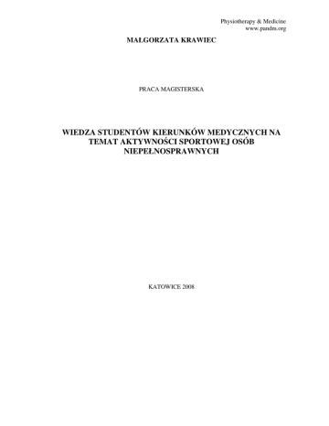 Physiotherapy & Medicine www.pandm.org MAŁGORZATA KRAWIEC PRACA MAGISTERSKA WIEDZA STUDENTÓW KIERUNKÓW MEDYCZNYCH NA TEMAT AKTYWNOŚCI SPORTOWEJ OSÓB NIEPEŁNOSPRAWNYCH KATOWICE 2008 SPIS TREŚCI I. WSTĘP ………………………………………………………………….……………..... 2 1. Wpływ aktywności fizycznej na organizm człowieka ……………………….….... 3 2. Świadomość społeczna ludzi niepełnosprawnych ………………………………... 4 3. Sport niepełnosprawnych ……………………………………………………….... 7 3.1. Rozwój sportu osób niepełnosprawnych w Polsce i na świecie …………….. 10 3.2. Organizacje i zrzeszenia zajmujące się sportem osób niepełnosprawnych …. 12 II. CEL PRACY ………………………………………………………………………….. 16 III. MATERIAŁ I METODYKA BADANIA ………………………………………….... 17 IV. WYNIKI I ICH OMÓWIENIE …………………………………………………….... 18 V. PODSUMOWANIE ………………………………………………………………….. 38 VI. WNIOSKI …………………………………………………………………………… 41 VII. PIŚMIENNICTWO ………………………………………………………………… 42 ANEKS ……………………………………………………………………………... 45 2 I. WSTĘP Karta Praw Osób Niepełnosprawnych uchwalona przez sejm RP w 1997 roku, stanowi, że „osoby niepełnosprawne, to osoby, których sprawność fizyczna, psychiczna lub umysłowa trwale lub okresowo utrudnia, ogranicza lub uniemożliwia życie codzienne, naukę, pracę oraz pełnienie ról społecznych, zgodnie z normami prawnymi i zwyczajowymi [Karta…, 1997].” [14]. Przyjmując jako kryterium rodzaj niepełnosprawności wyróżnia się: − osoby z uszkodzeniami sensorycznymi, do których należą osoby niewidome i słabo widzące oraz głuche i słabo słyszące, − osoby z niesprawnością motoryczną, czyli osoby z uszkodzeniem narządu ruchu oraz osoby z przewlekłymi chorobami narządów, − osoby z niepełnosprawnością psychiczną, w tej grupie znajdują się osoby umysłowo upośledzone z niepełnosprawnością intelektualną, osoby psychicznie chore z zaburzeniami osobowości i zachowania oraz osoby cierpiące na epilepsję [20]. Na świecie z roku na rok zwiększa się liczba osób niepełnosprawnych, którzy obecnie stanowią 10% populacji całego społeczeństwa. W Polsce wyniki badań GUS z 1997 roku wykazały, że liczba osób niepełnosprawnych wyniosła w tym roku około 500 mln 200 tys. osób, tj. ogółem 14% wszystkich Polaków. Oznacza to, że w blisko co drugim gospodarstwie polskim pomiędzy prawnymi lub biologicznymi członkami rodziny znalazła się osoba niepełnosprawna [3]. Liczba osób niepełnosprawnych wzrasta, a mimo to osoby te nadal spychane są na margines życia całego społeczeństwa. Pomoc w akceptacji i integracji niepełnosprawnych z ludźmi pełnosprawnymi jest ważnym elementem polityki wszystkich państw świata. Władze wraz ze społeczeństwem powinny znosić wszelkie bariery ideowe, kulturowe, jak również architektoniczne, aby niepełnosprawni poczuli się pełnoprawnymi uczestnikami życia społecznego. Od tego zależy też poziom i rodzaj niepełnosprawności oraz podejścia samych poszkodowanych do własnych ograniczeń. Niepełnosprawność nie powinna być formą dyskryminacji ani odizolowania się od reszty społeczeństwa. Sport, rekreacja i turystyka są jednym z wielu czynników życia, które mogą posłużyć poprawie życia osobom niepełnosprawnym. Ruch kształtuje świadomość osób upośledzonych 3 zarówno fizycznie jak i psychicznie oraz ma pozytywny wpływ na organizm człowieka. Poprzez sport łatwiej otworzyć się na świat, skomunikować się z innymi, zarówno pełno jak i niepełnosprawnymi. Wspólne spotkania podczas zawodów czy treningów pomagają doskonalić się, dorównać innym, sprawdzić swoją osobowość i odporność psychiczną. 1. Wpływ aktywności fizycznej na organizm człowieka Aktywność fizyczna jest ważnym czynnikiem kształtującym i rozwijającym nasze narządy. Ruch i praca wpływa na otaczający nas świat i stanowi podstawowy element zdrowego trybu życia. Systematyczne ćwiczenia i trening fizyczny wzmacniają wszystkie narządy człowieka, a w szczególności układ mięśniowo – kostny. Aktywność ruchowa zwiększa siłę, masę i wytrzymałość mięśni. Struktura kostna wzmacniana jest przez zwiększenie uwapnienia beleczek kostnych. Głównym czynnikiem działającym na tkankę kostną jest właściwe obciążenie mechaniczne, które wpływa na budowę kości. Ćwiczenia chronią aparat torebkowo-więzadłowy przed uszkodzeniem, poprawią stabilność stawów poprzez zachowanie elastyczności i odpowiedniej długości elementów okołostawowych. Poza aparatem ruchu, wysiłek fizyczny usprawnia układ krążeniowo- oddechowy. Korzystnie wpływa na sprawność zapotrzebowania tlenowego, przez zwiększony przepływ krwi. Pod wpływem zwiększonej aktywności fizycznej dochodzi do przerostu mięśnia sercowego, rośnie siła skurczu i objętość wyrzutowa serca. Powiększa się też przepływ wieńcowy i rezerwa wieńcowa, co poprawia zdolność do wykonywania wysiłków fizycznych i pokonywania obciążeń zewnętrznych. Aktywność fizyczna korzystnie wpływa na czynność mięśni oddechowych, tym sposobem poprawie ulega mechanika oddychania i podstawowe parametry wentylacyjne. Kształtuje również budowę klatki piersiowej, wpływając na postawę ciała. Duże znaczenie ma też wpływ aktywności ruchowej na przemianę materii. Połączenie ruchu z właściwą dietą pomaga utrzymać właściwy ciężar ciała. U ludzi aktywnych fizycznie zmienia się skład ciała, niezależnie od wieku. Cechuje ich mała ilość tłuszczu