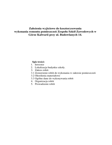 Założenia wyjściowe do kosztorysowania wykonania remontu pomieszczeń Zespołu Szkół Zawodowych w Górze Kalwarii przy ul. Budowlanych 14. Spis treści: 1. Inwestor 2. Lokalizacja budynku szkoły. 3. Zakres robót 3.1 Zestawienie robót do wykonania w zakresie pomieszczeń 3.2 Określenia materiałowe 3.3 Ogólne dane do wykonywania robót 4. Organizacja robót 5. Prowadzenie robót 1. Inwestor Starostwo Powiatowe w Piasecznie 05-500 Piaseczno ul. Chyliczkowska 14. 2. Lokalizacja budynku szkoły. Roboty remontowe prowadzone będą w budynku Zespołu Szkół Zawodowych w Górze Kalwarii ul. Budowlanych 14. 3. Zakres robót Zakres robót obejmuje wymianę posadzek i remont części pomieszczeń parteru. Wymiana posadzek: Wymiana posadzek zgodnie z opracowanym projektem „Wymiany podłóg, remontem klatki schodowej wraz z wymianą balustrad”. Zakres wykonania obejmuje wymianę podłóg na poziomie całego II piętra oraz w części pomieszczeń I piętra. Zestawienie pomieszczeń do wymiany podłóg w poziomie I piętra: pom. nr 23 – archiwum 1 pom. nr 32 – pracownia chemiczna pom. nr 33 – zaplecze pracowni chemicznej pom. nr 37 – gabinet z-cy Dyrektora pom. nr 38 – pracownia pom. nr 39 – zaplecze Sali 38 Szczegółowy zakres, sposób wykonania oraz dobór materiałów określa projekt techniczny i Specyfikacja Techniczna Wykonania i Odbioru Robót. Remont części pomieszczeń parteru Zakres remontu części parteru obejmuje pomieszczenia: pom. nr 16 – magazynek do przechowywania środków czystości (zaplecze nr 1 sali gimnastycznej) pom. nr 17 – magazynek sportowy (zaplecze nr 2 sali gimnastycznej) pom. nr 20c – przebieralnia damska z pomieszczeniem z prysznicami i łazienką (wc). pom. nr 20d – przebieralnia męska z pomieszczeniem z prysznicami i łazienką (wc). pom. nr 19 - korytarz przy sali gimnastycznej. 3.1 Zestawienie robót do wykonania w zakresie remontu pomieszczeń: Pomieszczenie nr 16: - osłonięcie podłóg folią i płytą pilśniową twardą. - osłonięcie okien folią - wykucie drzwi między pomieszczeniami nr 16 i 17 - zabudowa otworu drzwiowego płytami GK na stelażu metalowym z płytą obustronnie. - demontaż sufitu podwieszonego rastrowego - zerwanie tapet - przetarcie tynków ścian i sufitów - malowanie ścian do wysokości 1,5 m lamperii farbą olejną - malowanie ścian powyżej wysokości 1,5m farbą emulsyjną - malowanie sufitów farbami emulsyjnymi. - oczyszczenie i pomalowanie farbami olejnymi kraty metalowej wewnętrznej i krat zewnętrznych okiennych - przeszlifowanie i obłożenie glazurą parapetów okiennych od strony wewnętrznej. - założenie kratki wentylacyjnej – 1 szt Pomieszczenia nr 17: - osłonięcie podłóg folią i płytą pilśniową twardą. - osłonięcie okien folią - przetarcie tynków ścian i sufitów - malowanie ścian do wysokości 1,5 m lamperii farbą olejną - malowanie ścian powyżej wysokości 1,5m farbą emulsyjną - przeszlifowanie i obłożenie glazurą parapetów okiennych od strony wewnętrznej. - oczyszczenie i pomalowanie farbami olejnymi krat zewnętrznych okiennych - oczyszczenie i pomalowanie farbami olejnymi drzwi stalowych do sali gimnastycznej - malowanie sufitów farbami emulsyjnymi. Pomieszczenie 20c - przebieralnia: - osłonięcie podłóg folią i płytą pilśniową twardą. - osłonięcie okien folią - przetarcie tynków ścian i sufitów - malowanie ścian do wysokości 1,5 m lamperii farbą olejną - malowanie ścian powyżej wysokości 1,5m farbą emulsyjną - przeszlifowanie i obłożenie glazurą parapetów okiennych od strony wewnętrznej. - szpachlowanie i malowanie farbą olejną wszystkich drzwi ( 3 szt) - oczyszczenie i pomalowanie farbami olejnymi krat zewnętrznych okiennych - malowanie sufitów farbami emulsyjnymi. - przeszlifowanie i obłożenie glazurą parapetów okiennych od strony wewnętrznej - wymiana klamek z szyldami w drzwiach malowanych Pomieszczenie 20c –wc - osłonięcie podłóg folią i płytą pilśniową twardą. - przetarcie tynków ścian powyżej glazur i sufitów - malowanie ścian powyżej glazury 2,14 m farbą emulsyjną - skucie istniejących glazur wysokości 2.14m - ułożenie glazur na ścianach do wysokości 2,14m z wykończeniem narożników wypukłych listwami - ćwierćwałkami pcv - założenie kratek wentylacyjnych – 1 szt - malowanie sufitów farbami emulsyjnymi. Pomieszczenie 20c – prysznice - osłonięcie podłóg folią i płytą pilśniową twardą. - przetarcie tynków ścian powyżej glazur i sufitów - malowanie ścian powyżej glazury 2,14 m farbą emulsyjną - skucie istniejących glazur wysokości 2.14m - ułożenie glazur na ścianach do wysokości 2,14m z wykończeniem narożników wypukłych listwami - ćwierćwałkami pcv - założenie kratek wentylacyjnych – 2 szt - malowanie sufitów farbami emulsyjnymi. Pomieszczenie 20d - przebieralnia: - osłonięcie podłóg folią i płytą pilśniową twardą. - osłonięcie okien folią - przetarcie tynków ścian i sufitów - malowanie ścian do wysokości 1,5 m lamperii farbą olejną - malowanie ścian powyżej wysokości 1,5m farbą emulsyjną - przeszlifowanie i obłożenie glazurą parapetów okiennych od strony wewnętrznej. - szpachlowanie i malowanie farbą olejną drzwi do wc - oczyszczenie i pomalowanie farbami olejnymi krat zewnętrznych okiennych - malowanie sufitów farbami emulsyjnymi. - przeszlifowanie i obłożenie glazurą parapetów okiennych od strony wewnętrznej - wymiana klamek z szyldami w drzwiach malowanych - wymiana drzwi prowadzących na korytarz oraz do pomieszczenia z prysznicami Pomieszczenie 20d –wc - osłonięcie podłóg folią i płytą pilśniową twardą. - przetarcie tynków ścian powyżej glazur i sufitów - malowanie ścian powyżej glazury 2,14 m farbą emulsyjną - skucie istniejących glazur wysokości 2.14m - ułożenie glazur na ścianach do wysokości 2,14m z wykończeniem narożników wypukłych listwami - ćwie