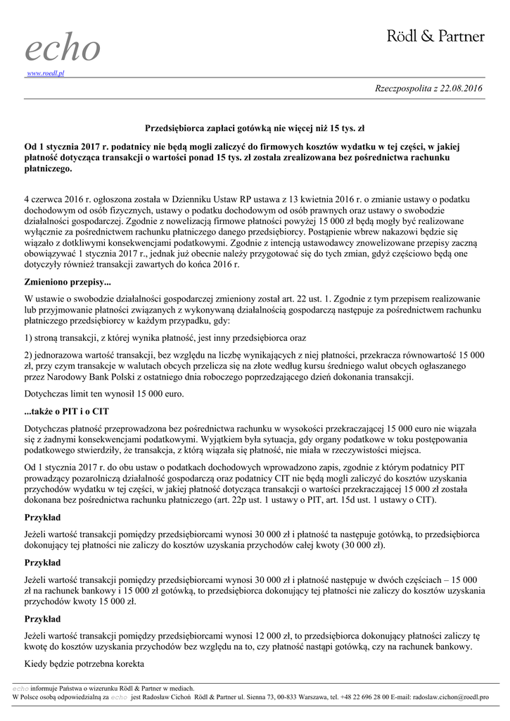echo www.roedl.pl Rzeczpospolita z 22.08.2016 Przedsiębiorca zapłaci gotówką nie więcej niż 15 tys. zł Od 1 stycznia 2017 r. podatnicy nie będą mogli zaliczyć do firmowych kosztów wydatku w tej części, w jakiej płatność dotycząca transakcji o wartości ponad 15 tys. zł została zrealizowana bez pośrednictwa rachunku płatniczego. 4 czerwca 2016 r. ogłoszona została w Dzienniku Ustaw RP ustawa z 13 kwietnia 2016 r. o zmianie ustawy o podatku dochodowym od osób fizycznych, ustawy o podatku dochodowym od osób prawnych oraz ustawy o swobodzie działalności gospodarczej. Zgodnie z nowelizacją firmowe płatności powyżej 15 000 zł będą mogły być realizowane wyłącznie za pośrednictwem rachunku płatniczego danego przedsiębiorcy. Postąpienie wbrew nakazowi będzie się wiązało z dotkliwymi konsekwencjami podatkowymi. Zgodnie z intencją ustawodawcy znowelizowane przepisy zaczną obowiązywać 1 stycznia 2017 r., jednak już obecnie należy przygotować się do tych zmian, gdyż częściowo będą one dotyczyły również transakcji zawartych do końca 2016 r. Zmieniono przepisy... W ustawie o swobodzie działalności gospodarczej zmieniony został art. 22 ust. 1. Zgodnie z tym przepisem realizowanie lub przyjmowanie płatności związanych z wykonywaną działalnością gospodarczą następuje za pośrednictwem rachunku płatniczego przedsiębiorcy w każdym przypadku, gdy: 1) stroną transakcji, z której wynika płatność, jest inny przedsiębiorca oraz 2) jednorazowa wartość transakcji, bez względu na liczbę wynikających z niej płatności, przekracza równowartość 15 000 zł, przy czym transakcje w walutach obcych przelicza się na złote według kursu średniego walut obcych ogłaszanego przez Narodowy Bank Polski z ostatniego dnia roboczego poprzedzającego dzień dokonania transakcji. Dotychczas limit ten wynosił 15 000 euro. ...także o PIT i o CIT Dotychczas płatność przeprowadzona bez pośrednictwa rachunku w wysokości przekraczającej 15 000 euro nie wiązała się z żadnymi konsekwencjami podatkowymi. Wyjątkiem była sytuacja, gdy organy podatkowe w toku postępowania podatkowego stwierdziły, że transakcja, z którą wiązała się płatność, nie miała w rzeczywistości miejsca. Od 1 stycznia 2017 r. do obu ustaw o podatkach dochodowych wprowadzono zapis, zgodnie z którym podatnicy PIT prowadzący pozarolniczą działalność gospodarczą oraz podatnicy CIT nie będą mogli zaliczyć do kosztów uzyskania przychodów wydatku w tej części, w jakiej płatność dotycząca transakcji o wartości przekraczającej 15 000 zł została dokonana bez pośrednictwa rachunku płatniczego (art. 22p ust. 1 ustawy o PIT, art. 15d ust. 1 ustawy o CIT). Przykład Jeżeli wartość transakcji pomiędzy przedsiębiorcami wynosi 30 000 zł i płatność ta następuje gotówką, to przedsiębiorca dokonujący tej płatności nie zaliczy do kosztów uzyskania przychodów całej kwoty (30 000 zł). Przykład Jeżeli wartość transakcji pomiędzy przedsiębiorcami wynosi 30 000 zł i płatność następuje w dwóch częściach – 15 000 zł na rachunek bankowy i 15 000 zł gotówką, to przedsiębiorca dokonujący tej płatności nie zaliczy do kosztów uzyskania przychodów kwoty 15 000 zł. Przykład Jeżeli wartość transakcji pomiędzy przedsiębiorcami wynosi 12 000 zł, to przedsiębiorca dokonujący płatności zaliczy tę kwotę do kosztów uzyskania przychodów bez względu na to, czy płatność nastąpi gotówką, czy na rachunek bankowy. Kiedy będzie potrzebna korekta echo informuje Państwa o wizerunku Rödl & Partner w mediach. W Polsce osobą odpowiedzialną za echo jest Radosław Cichoń Rödl & Partner ul. Sienna 73, 00-833 Warszawa, tel. +48 22 696 28 00 E-mail: [email protected] Ustawodawca uwzględnił również sytuację, w której wydatek związany z daną transakcją zrealizowaną wbrew nakazowi został zaliczony do kosztów uzyskania przychodów przed dniem rozliczenia się przedsiębiorców. W takim przypadku podatnicy będą obowiązani zmniejszyć koszty uzyskania przychodów albo – w przypadku braku możliwości ich zmniejszenia – zwiększyć przychody w miesiącu, w którym miała miejsce płatność bez pośrednictwa rachunku płatniczego. Jest to tzw. mechanizm wyłączenia (korygowania) z kosztów podatkowych przy rozliczeniu (art. 22p ust. 2 ustawy o PIT, art. 15d ust. 2 ustawy o CIT). Przepisy te będzie trzeba stosować odpowiednio: - w przypadku nabycia lub wytworzenia środków trwałych albo nabycia wartości niematerialnych i prawnych, - w przypadku dokonania płatności po zmianie formy opodatkowania na zryczałtowaną, - po likwidacji pozarolniczej działalności gospodarczej opodatkowanej podatkiem dochodowym od osób fizycznych. Przykład Przedsiębiorca nabył środek trwały za cenę 60 000 zł. Pierwszy odpis amortyzacyjny miał miejsce w marcu 2017 r. Okres amortyzacji wynosi pięć lat. Transakcja została rozliczona bez użycia rachunku bankowego w maju 2017 r. W maju przedsiębiorca nie zaliczy do kosztów uzyskania przychodów wartości odpisu za maj w wysokości 1000 zł, a ponadto koszty uzyskania przychodów aktywowane w maju pomniejszy o wartość odpisów amortyzacyjnych za marzec i kwiecień. Regulacje przejściowe Nowe regulacje podatkowe mają zastosowanie do płatności przeprowadzanych w roku podatkowym rozpoczynającym się po 31 grudnia 2016 r. W przypadku „przesuniętych" lat podatkowych przepisy przejściowe stosuje się odpowiednio. Znajdujący się w takiej sytuacji podatnicy mają zatem więcej czasu na przygotowanie się do zmian. Jeżeli przed 1 stycznia 2017 r. zostanie przeprowadzona transakcja o wartości przekraczającej równowartość 15 000 euro (obecny limit), to nowe regulacje podatkowe znajdą zastosowanie do płatności wynikających z tej transakcji dokonywanych w roku podatkowym rozpoczynającym się po 31 grudnia 2016 r., jeżeli kwota płatności do 31 