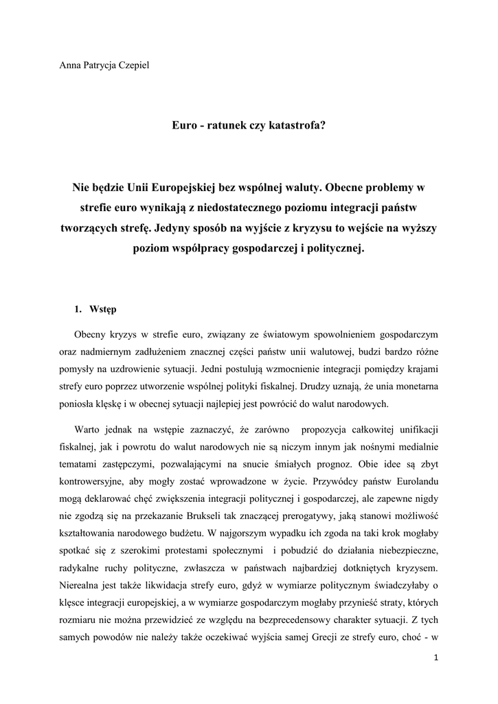 Anna Patrycja Czepiel Euro - ratunek czy katastrofa? Nie będzie Unii Europejskiej bez wspólnej waluty. Obecne problemy w strefie euro wynikają z niedostatecznego poziomu integracji państw tworzących strefę. Jedyny sposób na wyjście z kryzysu to wejście na wyższy poziom współpracy gospodarczej i politycznej. 1. Wstęp Obecny kryzys w strefie euro, związany ze światowym spowolnieniem gospodarczym oraz nadmiernym zadłużeniem znacznej części państw unii walutowej, budzi bardzo różne pomysły na uzdrowienie sytuacji. Jedni postulują wzmocnienie integracji pomiędzy krajami strefy euro poprzez utworzenie wspólnej polityki fiskalnej. Drudzy uznają, że unia monetarna poniosła klęskę i w obecnej sytuacji najlepiej jest powrócić do walut narodowych. Warto jednak na wstępie zaznaczyć, że zarówno propozycja całkowitej unifikacji fiskalnej, jak i powrotu do walut narodowych nie są niczym innym jak nośnymi medialnie tematami zastępczymi, pozwalającymi na snucie śmiałych prognoz. Obie idee są zbyt kontrowersyjne, aby mogły zostać wprowadzone w życie. Przywódcy państw Eurolandu mogą deklarować chęć zwiększenia integracji politycznej i gospodarczej, ale zapewne nigdy nie zgodzą się na przekazanie Brukseli tak znaczącej prerogatywy, jaką stanowi możliwość kształtowania narodowego budżetu. W najgorszym wypadku ich zgoda na taki krok mogłaby spotkać się z szerokimi protestami społecznymi i pobudzić do działania niebezpieczne, radykalne ruchy polityczne, zwłaszcza w państwach najbardziej dotkniętych kryzysem. Nierealna jest także likwidacja strefy euro, gdyż w wymiarze politycznym świadczyłaby o klęsce integracji europejskiej, a w wymiarze gospodarczym mogłaby przynieść straty, których rozmiaru nie można przewidzieć ze względu na bezprecedensowy charakter sytuacji. Z tych samych powodów nie należy także oczekiwać wyjścia samej Grecji ze strefy euro, choć - w 1 przeciwieństwie do rozpadu strefy euro rozumianego jako powrót każdego z jej członków do waluty narodowej – secesja Grecji z unii monetarnej ma w sobie nutę realizmu. Osłabia go jednak fakt, że Unia Europejska i Międzynarodowy Fundusz Walutowy poświęciły ratowaniu Grecji tyle zabiegów o charakterze finansowym i politycznym, że trudno byłoby wyobrazić sobie zmarnowanie tych wysiłków poprzez zgodę na rozpoczęcie procedury opuszczenia unii walutowej przez Grecję. Podsumowując, można stwierdzić, że za istnieniem unii monetarnej przemawia waga przedsięwzięcia, jakim było utworzenie strefy euro. Jej rozpad cofnąłby w rozwoju integrację europejską. Sprawiłby, że gospodarki dzisiejszego Eurolandu musiałyby zmierzyć się z problemami dużo większymi niż obecnie. Ponadto, mimo obecnej niełatwej sytuacji, strefa euro może pochwalić się wymiernymi sukcesami: euro stało się drugą walutą międzynarodową, a dzięki istnieniu unii monetarnej znacznie zwiększyły się bezpośrednie inwestycje zagraniczne wewnątrz strefy euro1. Nie można zapominać także o pojawieniu się "podręcznikowych" korzyści takich, jak łatwość w podróżowaniu i zanik ryzyka kursowego destabilizującego decyzje gospodarstw domowych i przedsiębiorstw. Dlatego zamiast poprzez likwidację Eurolandu zaprzepaszczać tak wielkie osiągnięcie, jakim było utworzenie europejskiej unii walutowej, najrozsądniejsze wydaje się być "leczenie" unii monetarnej polegające na kształtowaniu cech, którymi powinna charakteryzować się unia walutowa, a które w praktyce nie istniały w ogóle bądź nie funkcjonowały w wystarczającym stopniu. Mowa tutaj o potrzebie realizacji zasady, według której warunkiem sukcesu unii monetarnej jest wzajemne podobieństwo tworzących ją gospodarek zarówno pod względem poziomu rozwoju, jak w wymiarze decyzji politycznych. Warto zastanowić się, jak tego skutecznie dokonać. 2. Strefa euro jak przedwojenna Liga Narodów? Na szczęście dyskusja o receptach na kryzys w strefie euro nie kończy się na starciu między sobą dwóch przeciwstawnych koncepcji - idei całkowitej unifikacji fiskalnej państw eurostrefy oraz koncepcji powrotu do walut narodowych. Niosącą duże wyzwania alternatywą jest przede wszystkim konstruowanie nowych oraz przestrzeganie zarówno istniejących 1 Staniłko J. F., Czy strefa euro przetrwa swój pierwszy kryzys? [w:] Platon na Wall Street, Ośrodek Mysli Politycznej & Centre for European Renewal, Kraków 2011, s. 223-272 2 wcześniej, jak i wprowadzanych obecnie przepisów mających sprzyjać wchodzeniu przez kraje strefy euro na wyższy poziom integracji. Wedle teorii podstawą stabilności unii monetarnej jest skoordynowana polityka fiskalna. Od strony formalnej o zbudowanie tego fundamentu zadbano w procesie kształtowania ram instytucjonalnych strefy euro. W ramach wprowadzonego w 1997 r. Paktu Stabilności i Wzrostu stworzono odpowiednie narzędzia mające zagwarantować dyscyplinę budżetową wewnątrz unii monetarnej. Kryteria te nie były idealne – warto wspomnieć chociażby o tym, że sankcje groziły państwu za przekroczenie dopuszczalnego progu deficytu budżetowego, ale nie brały już pod uwagę długu publicznego czy oczyszczonego z wpływów koniunktury deficytu strukturalnego. Mimo tego jednak stosowanie się do nich przez państwa strefy euro zapobiegłoby obecnemu kryzysowi zadłużenia w unii monetarnej, bądź przynajmniej miałby on łagodniejszy przebieg. Niestety, okazało się, że zarówno członkowie strefy euro, jak i unijne instytucje nie traktowały postanowień Paktu poważnie. Zawinił brak poczucia odpowiedzialności poszczególnych państw członkowskich za całą unię monetarną w swych decyzjach krajowych i na forum strefy euro. Szkodliwe było zwłaszcza upolitycznienie unijnej kontroli nad budżetami krajów Eurolandu, a także brak zdrowego rozsądku rządzących, polegający na lekkodusznym rozluźnieniu polityki fiskalnej po okresie swoistej "die