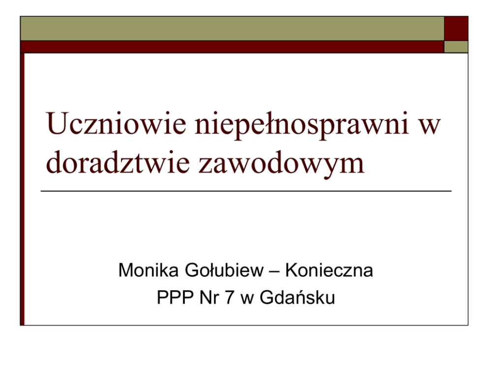 Uczniowie niepełnosprawni w doradztwie zawodowym Monika Gołubiew – Konieczna PPP Nr 7 w Gdańsku Uczniowie posiadający orzeczenie o potrzebie kształcenia specjalnego (oświatowe, wydawane przez publiczne PPP) i/lub orzeczenie o niepełnosprawności/o stopniu niepełnosprawności (poza oświatowe, wydawane przez powiatowe komisje ds. orzekania o niepełnosprawności) Orzeczenie o potrzebie kształcenia specjalnego z uwagi na: niepełnosprawność ruchową (w tym afazję) upośledzenie umysłowe w stopniu lekkim, umiarkowanym i znacznym niedowidzenie, niewidzenie niedosłyszenie, niesłyszenie Autyzm (w tym zespół Aspergera) sprzężenie ww. niepełnosprawności Orzeczenie o niepełnosprawności/ o stopniu niepełnosprawności z uwagi na: 01-U – upośledzenie umysłowe 02-P – choroby psychiczne 03-L – zaburzenia głosu, mowy i choroby słuchu 04-L – choroby narządu wzroku 05-R -upośledzenie narządu ruchu 06-E – epilepsja 07-S – choroby układu oddechowego i krążenia 08-T – choroby układu pokarmowego 09-M – choroby układu moczowo – płciowego 10-N – choroby neurologiczne 11-I – inne, w tym schorzenia endokrynologiczne, metaboliczne, zaburzenia enzymatyczne, choroby zakaźne i odzwierzęce, zeszpecenia, choroby układu krwiotwórczego Uwaga! uczniowie z orzeczeniami to uczniowie wymagający specjalnej uwagi w zakresie doradztwa zawodowego! należy pamiętać o ich ograniczenia zdrowotnych, ale też o ich zainteresowaniach, predyspozycjach, planach życiowych Krok pierwszy doradcy zawodowego (1) już w klasie I –szej gimnazjum doradca zawodowy/pedagog powinien zorientować się, którzy uczniowie posiadają jedno/lub oba orzeczenia już w I- szej klasie gimnazjum uczniowie ci powinni skorzystać z porady lekarza medycyny pracy skierowanie do lekarza medycyny pracy wystawia lekarz rejonowy (rodzinny) Krok drugi doradcy zawodowego (2) uczniowie biorą udział w zajęciach warsztatowych prowadzonych dla całej klasy gimnazjalnej korzystają z porad szkolnych doradców zawodowych dla nich obowiązkowe powinno być indywidualne spotkanie z doradcą zawodowym w PPP i profesjonalna diagnoza zawodoznawcza oraz diagnoza poziomu rozwoju intelektualnego, a także spotkanie z psychologiem (w klasie III gimnazjum, ale przynajmniej w połowie roku szkolnego) Uwaga! dla uczniów, którzy nie ukończyli 18 lat szkoła ponadgimnazjalna musi się znaleźć (wskazuje starosta właściwy ze względu na miejsce zamieszkania dziecka) dla uczniów, którzy są pełnoletni (uwaga na uczniów szkół ogólnodostępnych i integracyjnych, którzy korzystali z wydłużonych etapów edukacyjnych!) Krok trzeci doradcy zawodowego (3) posiadanie dostępu do pełnej, aktualnej bazy szkół ponadgimnazjalnych w Gdańsku i okolicy, a w przypadku ukierunkowania na szkolnictwo specjalne także w całej Polsce znajomość/wiedza o zakresach dostosowania oferowanych przez te szkoły, także oferta placówki (bieżąca) Co mamy do zaoferowania dla absolwentów gimnazjum z orzeczeniem/orzeczeniami? - - Liceum ogólnokształcące ogólnodostępne/integracyjne: dla uczniów o dobrych możliwościach intelektualnych, zmotywowanych do dalszej nauki, dla których możliwe jest dostosowanie programów nauczania do ich indywidualnych potrzeb i możliwości, którzy potem mogą kontynuować naukę na studiach wyższych lub w szkołach policealnych lub na kursach kwalifikacyjnych dla uczniów o mniejszych możliwościach intelektualnych, dla których lekarz medycyny pracy wydaje zaświadczenie, że dany uczeń nie kwalifikuje się do wykonywania danego zawodu/żadnego zawodu i nie może realizować praktyk zawodowych, w przyszłości kontynuowanie nauki na kursach kwalifikacyjnych – bardzo duży problem Ważne dla liceum ogólnokształcącego/integracyjnego opinia o pierwszeństwie przyjęcia z PPP dostosowanie budynku szkoły/bariery architektoniczne profil klasy (predyspozycje i zainteresowania ucznia) dużo uczniów niepełnosprawnych kontynuuje edukację w liceum ogólnokształcącym/duże zainteresowanie szczególnie rodziców Co mamy do zaoferowania dla absolwentów gimnazjum z orzeczeniem/orzeczeniami? Licea ogólnokształcące specjalne: dla uczniów z danym rodzajem niepełnosprawności proponujemy w PPP dla uczniów o dużym stopniu niepełnosprawności i jednocześnie dobrych możliwościach intelektualnych - w Gdańsku nie ma żadnego (w Gdyni i Wejherowie dla uczniów z inwalidztwem słuchu, w Bydgoszczy – dla uczniów z inwalidztwem wzroku, w Konstancinie k/Warszawy – dla uczniów z dysfunkcjami ruchu…) nie ma „tradycji” wyjeżdżania do internatów/burs…. Co mamy do zaoferowania dla absolwentów gimnazjum z orzeczeniem/orzeczeniami? - - Technikum ogólnodostępne/specjalne dla uczniów o dobrych możliwościach intelektualnych, którym lekarz medycyny pracy wyda zgodę na wykonywanie danego zawodu, szczególnie zainteresowanych i zmotywowanych do nauki w danym zawodzie bardzo mało uczniów z orzeczeniami wybiera szkoły technikalne – chyba najtrudniejszy rodzaj szkoły ponadgimnazjalnej Co mamy do zaoferowania dla absolwentów gimnazjum z orzeczeniem/orzeczeniami? - szkoły zawodowe (ogólnodostępne i specjalne) dla uczniów z różnego rodzaju niepełnosprawnościami, którzy chcą lub/i maja określone możliwości intelektualne po uzyskaniu zgody lekarza medycyny pracy dobrane do zainteresowań i predyspozycji Ważne dla szkoły zawodowej - - - - w Gdańsku szkoły zawodowe specjalne są tylko dla młodzieży z niepełnosprawnością intelektualną uczniowie z niepełnosprawnością intelektualną uczący się w gimnazjach specjalnych „nie sprawdzają się” w szkołach zawodowych ogólnodostępnych (kontynuują naukę w szkołach zawodowych specjalnych) uczniowie z niepełnosprawnością intelektualna uczący się w gimnazjach ogólnodostępnych lub integracyjnych także „nie sprawdzają się” w szkołach zawodowych ogólnodostępnych (kontynuują naukę w szk