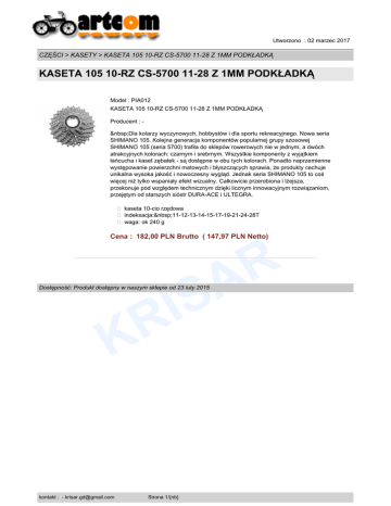 Utworzono : 02 marzec 2017 CZĘŚCI > KASETY > KASETA 105 10-RZ CS-5700 11-28 Z 1MM PODKŁADKĄ KASETA 105 10-RZ CS-5700 11-28 Z 1MM PODKŁADKĄ Model : PIA012 KASETA 105 10-RZ CS-5700 11-28 Z 1MM PODKŁADKĄ Producent : Dla kolarzy wyczynowych, hobbystów i dla sportu rekreacyjnego. Nowa seria SHIMANO 105. Kolejna generacja komponentów popularnej grupy szosowej SHIMANO 105 (seria 5700) trafiła do sklepów rowerowych nie w jednym, a dwóch atrakcyjnych kolorach: czarnym i srebrnym. Wszystkie komponenty z wyjątkiem łańcucha i kaset zębatek - są dostępne w obu tych kolorach. Ponadto naprzemienne występowanie powierzchni matowych i błyszczących sprawia, że produkty cechuje unikalna wysoka jakość i nowoczesny wygląd. Jednak seria SHIMANO 105 to coś więcej niż tylko wspaniały efekt wizualny. Całkowicie przerobiona i lżejsza, przekonuje pod względem technicznym dzięki licznym innowacyjnym rozwiązaniom, przejętym od starszych sióstr DURA-ACE i ULTEGRA. � kaseta 10-cio rzędowa � indeksacja: 11-12-13-14-15-17-19-21-24-28T � waga: ok 240 g Cena : 182,00 PLN Brutto ( 147,97 PLN Netto) K kontakt : - [email protected] R A S I R Dostępność: Produkt dostępny w naszym sklepie od 23 luty 2015 Strona 1/{nb}