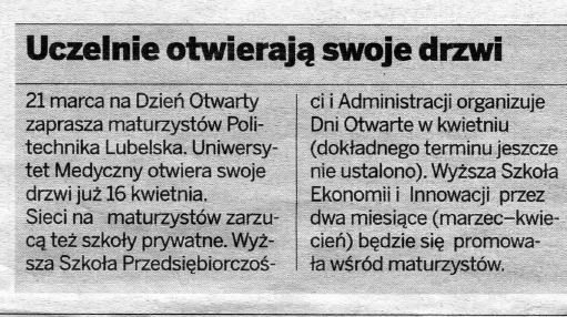 Uczelnie otwieraj^ swoJe drzwi 21 marca na Dzten Otwarty zaprasza maturzystow Politechnika Lubelska. Uniwersytet Medyczny otwiera swoje drzwi juz 16 kwietnia. Sieci na maturzystow zarzucq tez szkoty prywatne. Wyzsza Szkola Przedsi^biorczos- ci i Administracji organizuie Dni Otwarte w kwietniu (dokladnego terminu jeszcze nie ustalono). Wyzsza Szkola Ekonomii i Innowacji przez dwa miesi^ce (marzec-kwiecieh) b^dzie si^ promowa la wsrod maturzystow.