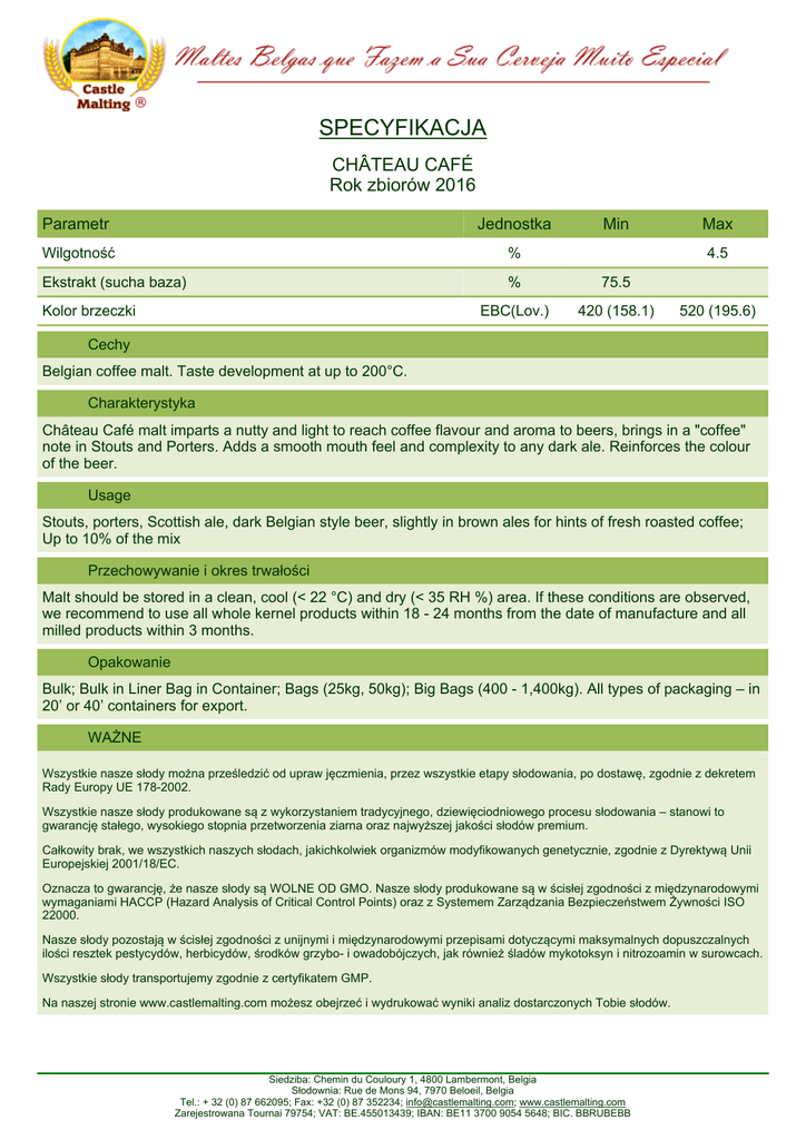 SPECYFIKACJA CHÂTEAU CAFÉ Rok zbiorów 2016 Parametr Jednostka Min Max Wilgotność % 4.5 Ekstrakt (sucha baza) % 75.5 EBC(Lov.) 420 (158.1) 520 (195.6) Kolor brzeczki Cechy Belgian coffee malt. Taste development at up to 200°C. Charakterystyka Château Café malt imparts a nutty and light to reach coffee flavour and aroma to beers, brings in a "coffee" note in Stouts and Porters. Adds a smooth mouth feel and complexity to any dark ale. Reinforces the colour of the beer. Usage Stouts, porters, Scottish ale, dark Belgian style beer, slightly in brown ales for hints of fresh roasted coffee; Up to 10% of the mix Przechowywanie i okres trwałości Malt should be stored in a clean, cool (< 22 °C) and dry (< 35 RH %) area. If these conditions are observed, we recommend to use all whole kernel products within 18 - 24 months from the date of manufacture and all milled products within 3 months. Opakowanie Bulk; Bulk in Liner Bag in Container; Bags (25kg, 50kg); Big Bags (400 - 1,400kg). All types of packaging – in 20’ or 40’ containers for export. WAŻNE Wszystkie nasze słody można prześledzić od upraw jęczmienia, przez wszystkie etapy słodowania, po dostawę, zgodnie z dekretem Rady Europy UE 178-2002. Wszystkie nasze słody produkowane są z wykorzystaniem tradycyjnego, dziewięciodniowego procesu słodowania – stanowi to gwarancję stałego, wysokiego stopnia przetworzenia ziarna oraz najwyższej jakości słodów premium. Całkowity brak, we wszystkich naszych słodach, jakichkolwiek organizmów modyfikowanych genetycznie, zgodnie z Dyrektywą Unii Europejskiej 2001/18/EC. Oznacza to gwarancję, że nasze słody są WOLNE OD GMO. Nasze słody produkowane są w ścisłej zgodności z międzynarodowymi wymaganiami HACCP (Hazard Analysis of Critical Control Points) oraz z Systemem Zarządzania Bezpieczeństwem Żywności ISO 22000. Nasze słody pozostają w ścisłej zgodności z unijnymi i międzynarodowymi przepisami dotyczącymi maksymalnych dopuszczalnych ilości resztek pestycydów, herbicydów, środków grzybo- i owadobójczych, jak również śladów mykotoksyn i nitrozoamin w surowcach. Wszystkie słody transportujemy zgodnie z certyfikatem GMP. Na naszej stronie www.castlemalting.com możesz obejrzeć i wydrukować wyniki analiz dostarczonych Tobie słodów. Siedziba: Chemin du Couloury 1, 4800 Lambermont, Belgia Słodownia: Rue de Mons 94, 7970 Beloeil, Belgia Tel.: + 32 (0) 87 662095; Fax: +32 (0) 87 352234; [email protected]; www.castlemalting.com Zarejestrowana Tournai 79754; VAT: BE.455013439; IBAN: BE11 3700 9054 5648; BIC. BBRUBEBB