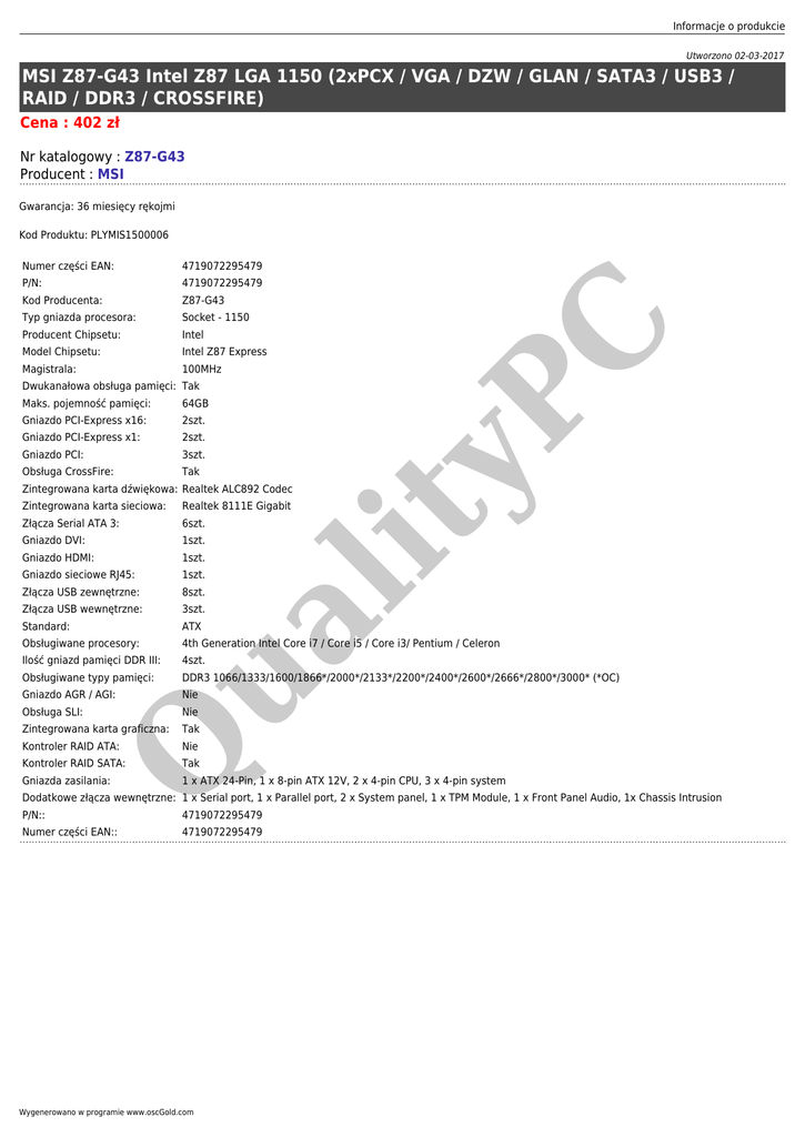 Informacje o produkcie Utworzono 02-03-2017 MSI Z87-G43 Intel Z87 LGA 1150 (2xPCX / VGA / DZW / GLAN / SATA3 / USB3 / RAID / DDR3 / CROSSFIRE) Cena : 402 zł Nr katalogowy : Z87-G43 Producent : MSI Gwarancja: 36 miesięcy rękojmi 4719072295479 P/N: 4719072295479 Kod Producenta: Z87-G43 Typ gniazda procesora: Socket - 1150 Producent Chipsetu: Intel Model Chipsetu: Intel Z87 Express Magistrala: 100MHz Dwukanałowa obsługa pamięci: Tak Maks. pojemność pamięci: 64GB Gniazdo PCI-Express x16: 2szt. Gniazdo PCI-Express x1: 2szt. Gniazdo PCI: 3szt. Obsługa CrossFire: Tak Zintegrowana karta dźwiękowa: Realtek ALC892 Codec Realtek 8111E Gigabit Złącza Serial ATA 3: 6szt. Gniazdo DVI: Gniazdo HDMI: ua lit Zintegrowana karta sieciowa: yP Numer części EAN: C Kod Produktu: PLYMIS1500006 1szt. 1szt. Gniazdo sieciowe RJ45: 1szt. Złącza USB zewnętrzne: 8szt. Złącza USB wewnętrzne: 3szt. Standard: ATX Obsługiwane procesory: 4th Generation Intel Core i7 / Core i5 / Core i3/ Pentium / Celeron Ilość gniazd pamięci DDR III: 4szt. Obsługiwane typy pamięci: DDR3 1066/1333/1600/1866*/2000*/2133*/2200*/2400*/2600*/2666*/2800*/3000* (*OC) Gniazdo AGR / AGI: Nie Obsługa SLI: Nie Tak Q Zintegrowana karta graficzna: Kontroler RAID ATA: Nie Kontroler RAID SATA: Tak Gniazda zasilania: 1 x ATX 24-Pin, 1 x 8-pin ATX 12V, 2 x 4-pin CPU, 3 x 4-pin system Dodatkowe złącza wewnętrzne: 1 x Serial port, 1 x Parallel port, 2 x System panel, 1 x TPM Module, 1 x Front Panel Audio, 1x Chassis Intrusion P/N:: Numer części EAN:: 4719072295479 4719072295479 Wygenerowano w programie www.oscGold.com