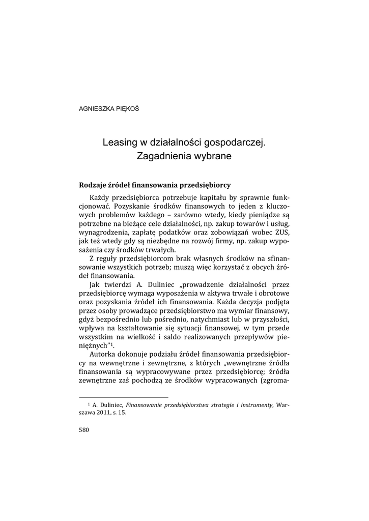 AGNIESZKA PIĘKOŚ Leasing w działalności gospodarczej. Zagadnienia wybrane Rodzaje źródeł finansowania przedsiębiorcy Każdy przedsiębiorca potrzebuje kapitału by sprawnie funkcjonować. Pozyskanie środków finansowych to jeden z kluczowych problemów każdego – zarówno wtedy, kiedy pieniądze są potrzebne na bieżące cele działalności, np. zakup towarów i usług, wynagrodzenia, zapłatę podatków oraz zobowiązań wobec ZUS, jak też wtedy gdy są niezbędne na rozwój firmy, np. zakup wyposażenia czy środków trwałych. Z reguły przedsiębiorcom brak własnych środków na sfinansowanie wszystkich potrzeb; muszą więc korzystać z obcych źródeł finansowania. Jak twierdzi A. Duliniec „prowadzenie działalności przez przedsiębiorcę wymaga wyposażenia w aktywa trwałe i obrotowe oraz pozyskania źródeł ich finansowania. Każda decyzja podjęta przez osoby prowadzące przedsiębiorstwo ma wymiar finansowy, gdyż bezpośrednio lub pośrednio, natychmiast lub w przyszłości, wpływa na kształtowanie się sytuacji finansowej, w tym przede wszystkim na wielkość i saldo realizowanych przepływów pieniężnych”1. Autorka dokonuje podziału źródeł finansowania przedsiębiorcy na wewnętrzne i zewnętrzne, z których „wewnętrzne źródła finansowania są wypracowywane przez przedsiębiorcę; źródła zewnętrzne zaś pochodzą ze środków wypracowanych (zgromaA. Duliniec, Finansowanie przedsiębiorstwa strategie i instrumenty, Warszawa 2011, s. 15. 1 580 Leasing w działalności gospodarczej. Zagadnienia wybrane dzonych) przez inne podmioty (np. banki, inwestorów na rynku kapitałowym czy dostawców przedsiębiorcy). Do źródeł wewnętrznych zalicza się przede wszystkim zysk zatrzymany (zysk netto minus wypłacone dywidendy) i amortyzację oraz wszelkie zmniejszenia stanu aktywów przedsiębiorcy (zapasów, środków trwałych, aktywów finansowych, środków pieniężnych). Źródła zewnętrzne to wszelkie formy zwiększenia pasywów przedsiębiorcy, poza wzrostem kapitału własnego w rezultacie zatrzymywania wypracowanego zysku”2. Do tych źródeł zalicza się m. in. kredyt, factoring, gwarancje bankowe, fundusze pomocowe, venture capital, leasing. Leasing jako zewnętrzne źródło finansowania W aspekcie ekonomicznym leasing stanowi szczególną formę finansowania inwestycji, niezbędnych przedsiębiorcy do realizacji procesów gospodarczych. Jego istota polega na oddaniu przez leasingodawcę rzeczy ruchomej, nieruchomości albo innego prawa majątkowego (określanego w prawie podatkowym mianem „wartości niematerialnych i prawnych”) przedsiębiorcy – leasingobiorcy, jako wyposażenia jego przedsiębiorstwa, do korzystania na określony czas, w zamian za opłaty leasingowe. W czasie trwania umowy leasingu, przedmiot pozostaje własnością leasingodawcy3. Pojawienie się i szybki rozwój leasingu w wielu państwach świata, w tym Europy, nie mógł pozostać niezauważony w Polsce. Początek ekspansji i rozkwitu leasingu przyniosła ustawa z dnia 23 grudnia 1988 roku o działalności gospodarczej oraz ustawa z dnia 23 grudnia 1988 roku o działalności gospodarczej z udziałem podmiotów zagranicznych. Wolnorynkowe zasady, przewidziane w pierwszej z wymienionych ustaw, miały dodatni wpływ na rozwój przedsiębiorczości prywatnej, która potrzebowała taniego sposobu na zaspokojenie swych potrzeb i uzupełnienie niedostatków kapitału inwestycyjnego. W latach 90., z powodu braku 2 3 Ibidem, s. 31. J. Brol, Umowa leasingu, Warszawa 2010, s. 15–16. 581 Agnieszka Piękoś ustawowej regulacji umowy leasingu, zarówno w prawie podatkowym jak i cywilnym, był on określany jako „umowa szczególna”, bądź „umowa o podobnych charakterze do umowy najmu lub dzierżawy”. W tym okresie dochodziło do powstawania konstrukcji umownych nawiązujących do leasingu, głównie jednak na potrzeby prawa podatkowego. Pierwszym aktem prawnym, który odrębnie regulował podatkowe aspekty umowy leasingu w prawie polskim, było Rozporządzenie Rady Ministrów z dnia 19 grudnia 1989 roku w sprawie uznawania składników majątkowych za środki trwałe oraz wartości niematerialne i prawne, zasad i stawek ich amortyzacji oraz zasad aktualizacji wyceny środków trwałych4. Rozporządzenie to wprowadziło do krajowego systemu prawnego pojęcie umowy leasingu, nie określając jednak jej zakresu. Zakończenie prac nad regulacją leasingu w prawie polskim nastąpiło wraz z: nowelizacją Kodeksu cywilnego z dnia 26 lipca 2000 roku5 – statuującą zobowiązaniowy stosunek wynikający z umowy leasingu; wejściem w życie, w dniu 1 października 2001 roku, nowelizacji ustawy o podatku dochodowym od osób prawnych oraz ustawy o podatku dochodowym od osób fizycznych, która dodała przepisy dotyczące tej instytucji do wskazanych aktów normatywnych6. Zdaniem M. Okręglickiej, leasing stanowi źródło finansowania inwestycji, gdyż dzięki niemu przedsiębiorca ma możliwość pozyskania niezbędnego majątku do modernizacji bądź rozwoju „firmy”. Alternatywą leasingu są wszystkie formy prawne, dające możliwość pozyskania sprzętu, wykorzystywanego w działalności Dz. U. z 1989 r., nr 72, poz. 422. Dz. U. z 2000 r., nr 74, poz. 857. 6 M. Koralewski, Umowy leasingu Aspekty podatkowo-prawne, Gdańsk 2008, s. 19–22. 4 5 582 Leasing w działalności gospodarczej. Zagadnienia wybrane gospodarczej, przy czym fakt czy przedmioty wchodzą do majątku trwałego inwestora czy nie, nie ma pierwszorzędnego znaczenia7. Rodzaje leasingu Leasing dóbr i usług stał się szansą na pozyskiwanie nowych technologii, których zdobywanie w dotychczasowy sposób sprawiało wiele trudności dla przedsiębiorcy. Usługę tę należy umiejscowić na rynku kapitałowym, gdzie finansowane są inwestycje. Do dnia wejścia w życie ustawy z dnia 26 lipca 2000 r. o zmianie ustawy – Kodeks cywilny tj. do dnia 9 grudnia 2000 r. pojęcie leasingu nie było z
