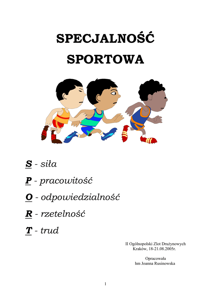 SPECJALNOŚĆ SPORTOWA S - siła P - pracowitość O - odpowiedzialność R - rzetelność T - trud II Ogólnopolski Zlot Drużynowych Kraków, 18-21.08.2005r. Opracowała hm Joanna Rusinowska 1 Działalność sportowa to jedna z najstarszych dziedzin pracy harcerskiej. Od zawsze celem tych działań było popularyzowanie takich wzorców zachowań, takich form spędzania wolnego czasu, które kształtowałyby nawyki ruchowe oraz higieniczno – zdrowotne przyzwyczajenia i postawy. Wychowanie sportowe w ZHP obejmuje te formy aktywności ruchowej, które mogą być uprawiane przez całe życie, np. biegi, pływanie, jazda na nartach, gry i zabawy ruchowe, terenowe, gry zespołowe, kolarstwo itp. W pracy harcerskiej największą popularnością cieszą się zawody, turnieje, olimpiady w zakresie różnych dyscyplin sportowych. Porównanie zadań wychowania fizycznego i sportu w odniesieniu do jednego z celów ZHP jakim jest wszechstronny rozwój intelektualny, społeczny, duchowy, emocjonalny i fizyczny człowieka. Zadania wf i sportu Cel w ZHP/sfera rozwoju człowieka Harmonijny rozwój fizyczny Rozwój fizyczny Kształtowanie psychomotoryki Rozwój fizyczny Rozwój psychiki Rozwój emocjonalny Wyposażenie w niezbędny zasób wiedzy o kulturze fizycznej i sporcie Rozwój intelektualny Kształtowanie charakteru i pożądanych Rozwój społeczny postaw w działaniu indywidualnym i zespołowym Kształtowanie estetyki ruchu wogóle Rozwój duchowy 2 Etapy zaangażowania w specjalność na poziomie poszczególnych pionów wiekowych: zuchy zaciekawienie harcerze zamiłowanie harcerze starsi zainteresowanie wędrownicy specjalizacja ZUCHY – dzięki cyklom sprawnościowym mają już okazję do swoistej preorientacji specjalnościowej i może u nich wystąpić pierwszy etap w rozwoju zainteresowania – zaciekawienie. Jak jednak wynika ze specyfiki tej grupy wiekowej zuchy mogą się jedynie bawić w specjalności nie koncentrując się na określonej specjalności zbyt długo. 3 HARCERZE – tutaj specjalność to przede wszystkim uczenie w działaniu (choć głównie na poziomie technik harcerskich). Wskazane są na tym etapie specjalności stawiające na gry, współzawodnictwo i opanowanie technik harcerskich (turystyczna, pożarnicza, wodna, proobronna, sportowa), które wykorzystujemy w grach fabularnych. Wśród harcerzy prócz zaciekawienia może wystąpić etap zamiłowania czyli wykonywanie pewnych czynności z zabarwieniem emocjonalnym, lecz jeszcze bez dążenia do rozszerzenia wiedzy w danym kierunku. HARCERZE STARSI – u których pojawia się trzeci etap w pracy ze specjalnościami czyli zainteresowanie, gdyż w naturalny sposób poszukują oni wiedzy na temat wybranej dziedziny, do której mają stosunek emocjonalny. Kłopot w tym, że tych dziedzin może być kilka, dlatego też specjalności na tym poziomie powinny umożliwić odkrywanie różnych pól działania, jak też wszechstronne zastosowanie konkretnych umiejętności (turystyka, obronność, żeglarstwo). WĘDROWNICY –to czwarty, finalny etap rozwoju zainteresowań czyli specjalizacja, która polega na uprawianiu określonej dziedziny ze szczególnym zamiłowaniem w oparciu o solidna wiedzę i doświadczenie. Wędrownik dąży do osiągnięcia mistrzostwa, ale już nie w wielu kierunkach (choć nadal mogą być przedmiotem zainteresowań) lecz jednym określonym. Mistrzostwo osiąga się w jednym określonym celu – pełnienia służby. Specjalności jak żaden inny element programu dają możliwość konkretnego działania noszącego znamiona wyczynu wędrowniczego – na pograniczu możliwości, choć w granicach bezpieczeństwa !!! Sport a cechy metody harcerskiej Pozytywność i sport – wychowanie poprzez budowanie dobra, rozbudzanie w człowieku jego zdolności, odkrywanie zalet i talentów, łatwiejsze akceptowanie świata, innych ludzi, siebie samego, nie poddawanie się złu i beznadziejności. Indywidualność i sport – wychowanie ukierunkowane na jednostkę, jej rozwój osobisty, dostosowując stawiane oczekiwania do możliwości i umiejętności człowieka, budując jego indywidualne cechy. Wzajemność oddziaływań i sport – czyli partnerstwo wszystkich członków ZHP, gdzie wszyscy są wychowawcami, jak i wychowankami, instruktor pełni rolę „przewodnika” będącego dla harcerza wzorem do naśladowania, a jego autorytet opiera się przede wszystkim na postawie zgodnej z Prawem Harcerskim. Dobrowolność i świadomość celów i sport – każdy członek ZHP samodzielnie wyraża chęć kierowania się w życiu harcerskimi zasadami i przynależność do naszej organizacji i konkretnej drużyny, gdzie skuteczność wychowania zależy od chęci dobrowolnego poddania się temu działaniu. 4 Pośredniość i sport – wszystkie podejmowane przez ZHP działania służą realizacji celów wychowawczych, atrakcyjne i społecznie pożyteczne zadania pobudzają do rozwoju wewnętrznego człowieka. Naturalność i sport – przystosowanie wszystkich podejmowanych działań do potrzeb i możliwości całego zespołu i poszczególnych jego członków oraz różnorodnych warunków działania: na wsi , w mieście, w nowej drużynie, bądź z tradycjami, wśród dziewcząt lub chłopców itd. Elementy metody harcerskiej Program stale doskonalony i pobudzający do rozwoju 5 Praca w małych grupach Uczenie w działaniu Przyrzeczenie i Prawo Harcerskie Uczenie w działaniu oraz program jako dwa znaczące elementy metody harcerskiej w realizacji specjalności sportowej harcerze zuchy Uczenie w działaniu PROGRAM Instrumenty metodyczne Formy pracy zabawa w kogoś lub coś, która w naturalny sposób kształtuje charakter i rozwija umiejętności Program odpowiada na specyficzną dla tego wieku ciekawość świata, jest tworzony przez drużynowego i przybocznych. Zabawa tematyczna, zabawy, gry i Gwiazdki zuchowe, ćwiczenia Sprawności indywidualne (gimnastyk, lekkoatleta, łyżwiarz, mistrz deskorolki, mistrz gie