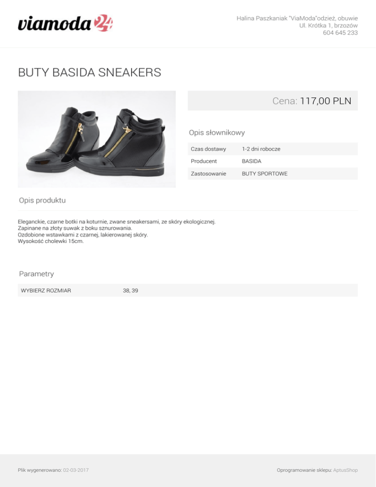 Halina Paszkaniak "ViaModa"odzież, obuwie Ul. Krótka 1, brzozów 604 645 233 BUTY BASIDA SNEAKERS Cena: 117,00 PLN Opis słownikowy Czas dostawy 1-2 dni robocze Producent BASIDA Zastosowanie BUTY SPORTOWE Opis produktu Eleganckie, czarne botki na koturnie, zwane sneakersami, ze skóry ekologicznej. Zapinane na złoty suwak z boku sznurowania. Ozdobione wstawkami z czarnej, lakierowanej skóry. Wysokość cholewki 15cm. Parametry WYBIERZ ROZMIAR Plik wygenerowano: 02-03-2017 38, 39 Oprogramowanie sklepu: AptusShop Halina Paszkaniak "ViaModa"odzież, obuwie Ul. Krótka 1, brzozów 604 645 233 Galeria Plik wygenerowano: 02-03-2017 Powered by TCPDF (www.tcpdf.org) Oprogramowanie sklepu: AptusShop