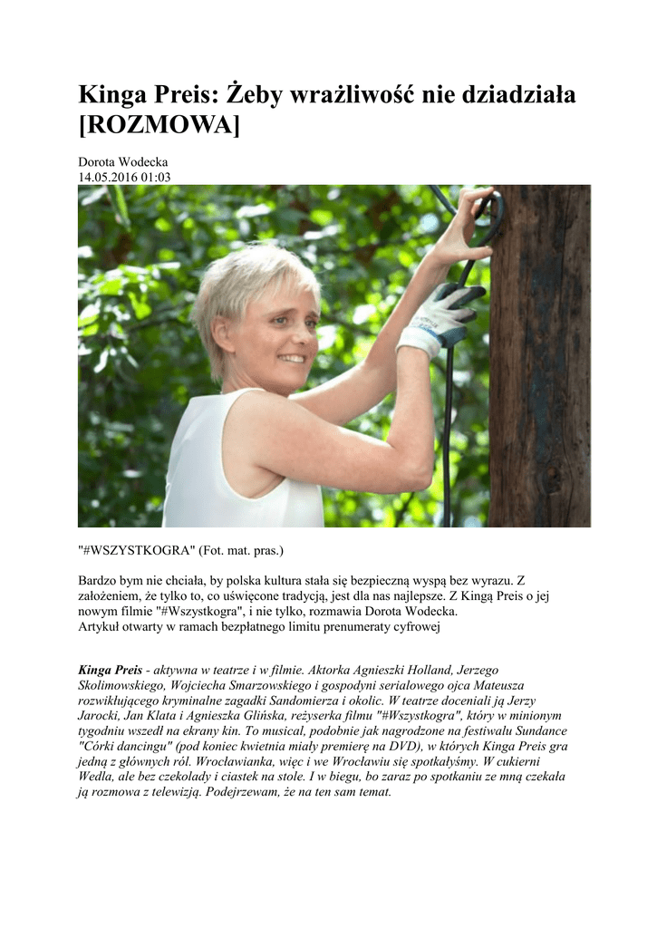 Kinga Preis: Żeby wrażliwość nie dziadziała [ROZMOWA] Dorota Wodecka 14.05.2016 01:03 "#WSZYSTKOGRA" (Fot. mat. pras.) Bardzo bym nie chciała, by polska kultura stała się bezpieczną wyspą bez wyrazu. Z założeniem, że tylko to, co uświęcone tradycją, jest dla nas najlepsze. Z Kingą Preis o jej nowym filmie "#Wszystkogra", i nie tylko, rozmawia Dorota Wodecka. Artykuł otwarty w ramach bezpłatnego limitu prenumeraty cyfrowej Kinga Preis - aktywna w teatrze i w filmie. Aktorka Agnieszki Holland, Jerzego Skolimowskiego, Wojciecha Smarzowskiego i gospodyni serialowego ojca Mateusza rozwikłującego kryminalne zagadki Sandomierza i okolic. W teatrze doceniali ją Jerzy Jarocki, Jan Klata i Agnieszka Glińska, reżyserka filmu "#Wszystkogra", który w minionym tygodniu wszedł na ekrany kin. To musical, podobnie jak nagrodzone na festiwalu Sundance "Córki dancingu" (pod koniec kwietnia miały premierę na DVD), w których Kinga Preis gra jedną z głównych ról. Wrocławianka, więc i we Wrocławiu się spotkałyśmy. W cukierni Wedla, ale bez czekolady i ciastek na stole. I w biegu, bo zaraz po spotkaniu ze mną czekała ją rozmowa z telewizją. Podejrzewam, że na ten sam temat. Kinga Preis: Proszę mnie nie pytać o politykę. Nie chcę o niej rozmawiać. Dorota Wodecka: Dlaczego? - Daję sobie prawo, żeby się na niej nie znać. Wiem, co się dzieje, choć rzadko oglądam telewizję, ale to najmniej atrakcyjny temat naszej rozmowy. Są jakieś atrakcyjniejsze tematy? - Myślę, że trzeba tonować nienawiść, a nie ją rozpalać. Po obu stronach jest tyle samo nietaktu, buty i agresji, i bez względu na to, co bym teraz powiedziała, czytelnicy będą moją wypowiedź komentować jednoznacznie: albo jestem za jednymi, albo za drugimi. Nie chcę wpisywać się w tak czarno-białą rzeczywistość. Swoją drogą, czuję się podobnie jak w restauracji, kiedy mówię, że jestem wegetarianką, a kelner daje mi do wyboru drób lub wieprzowinę. Więc nie, nie będę rozmawiała o polityce. A o wolności sztuki i o upolitycznieniu kultury? - Kultura i doraźna polityka to sfery wzajemnie się wykluczające. Ta pierwsza potrzebuje wolności, bo aby mówić o rzeczach trudnych i niewygodnych, nie można się bać swojego głosu. Bezpieczne pokazywanie i przedstawianie historii jest może poprawne politycznie, ale z kreacją nie ma wiele wspólnego. Z wolnością poszukiwań również. Nie boi się pani, dokąd panią te poszukiwania zaprowadzą? Że dowie się o sobie czegoś, czego nie chciałaby wiedzieć? - Bez względu na to, czego się o sobie dowiem, daję sobie prawo do podjęcia ryzyka. Inaczej moja praca nie miałaby sensu. Ryzyko jest wpisane w mój zawód, błądzenie również. Jeśli będę się obarczać myślą, że za swoje ryzyko artystyczne poniosę konsekwencje odrzucenia, potępienia i kary, to nie zrobię kroku naprzód. Jeżeli dam sobie wolność, to mimo trzepotu serca będę gotowa na podjęcie ryzyka. I jak wyglądają pani prywatne statystyki? Opłaca się ryzykować? - Wydaje mi się, że tu nie o statystyki sukcesu chodzi, ale o gotowość do spróbowania. Absolutny sukces artystyczny zdarza się raz na wiele, wiele spotkań. 17 lat spędziłam w Teatrze Polskim we Wrocławiu i na palcach jednej ręki mogę policzyć te, które były dla mnie wyjątkowo wartościowe artystycznie. A przecież za każdym razem ciężko pracowałam. Nie ma patentu na wybitny spektakl czy film, tak jak nie ma patentu na sukces. Ale trzeba próbować. Pamięta pani takie hasło: nasza siła w tradycji? - Pamiętam też, że "trzeba z żywymi naprzód iść", i pewnie dlatego, debiutując na Przeglądzie Piosenki Aktorskiej we Wrocławiu, nie zaśpiewałam jednej z piosenek Ewy Demarczyk albo Kabaretu Starszych Panów, tylko Nicka Cave'a. Mimo że te pierwsze tkwią w naszej tradycji, są piękne, inteligentne i zmysłowe, to jednak ja chcę mówić swoim językiem o tym, co mnie teraz dotyka. Tradycja nie jest hasłem przewodnim moich poszukiwań. Umiem z niej korzystać, interpretować ją, ale nie mogę na niej wozić swojego życia. Świat to różnorodność. Jest Tarantino i Sorrentino i nie sposób powiedzieć, że jeden jest gorszy lub lepszy. Bardzo bym nie chciała, by polska kultura stała się bezpieczną wyspą bez wyrazu, w treściach zastanych i oczywistych. Z założeniem, że tylko to, co uświęcone tradycją, jest dla nas najlepsze. Przepraszam, że jak ów kelner wracam do drobiu, ale politycy taką sztukę doceniają. - Nie potrafimy docenić tego, co mamy. Dopóki twórcy nie odniosą sukcesu za granicą, nie wierzymy w nich. Dopiero kiedy zachwycą świat, zaczynamy się do tych zachwytów odnosić. Mamy kompleks i nie ufamy, że polscy artyści mogą być wybitni, wychodzą ponad przeciętność. Warlikowski, Lupa, Klata odkrywają inne spojrzenia na rzeczywistość, które nie muszą być widzom bliskie. U nas jest tak, że jeśli twórca nie myśli tak samo jak widz lub krytyk i nie daj Bóg ma zmysłowość, która wykracza poza nam znaną, to nie mamy na jego sztukę zgody. Cały świat ma zgodę i otwartość. My jesteśmy w negacji. Trudno na niej budować tożsamość. Można ją budować na Mickiewiczu. - Mój syn jest teraz w liceum. Rozumiem, że powinien znać Słowackiego, Mickiewicza i jego "Dziady", ale nie oszukujmy się, że go to dotknie. Rozpulchnienie wrażliwości i wiedzy ogólnej o świecie jest bardzo ważne i to nie dlatego, żeby w sposób atrakcyjny uczestniczyć w rozmowie, tylko dlatego, że suma tego, co czytamy, oglądamy, naszej historii, składa się na to, co możemy dać innym. Myślę, że istotą budowania tożsamości jest wrażliwość. Coś, co nas nie obchodzi, nie może stanowić o nas samych. Bohaterki pani nowego filmu "#Wszystkogra" walczą o tożsamość swojego miejsca? - Film opowiada o trzech pokoleniach kobiet - mieszkają w odziedziczonym po prababci domu w Warszawie, który staje się przedmiote