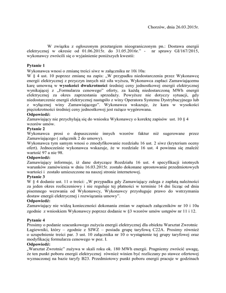 Chorzów, dnia 26.03.2015r. W związku z ogłoszonym przetargiem nieograniczonym pn.: Dostawa energii elektrycznej w okresie od 01.06.2015r. do 31.05.2016r.” - nr sprawy GI/167/2015, wykonawcy zwrócili się o wyjaśnienie poniższych kwestii: Pytanie 1 Wykonawca wnosi o zmianę treści siwz w załączniku nr 10i 10a: W § 4 ust. 10 poprzez zmianę na zapis: „W przypadku niedostarczenia przez Wykonawcę energii elektrycznej z przyczyn innych niż siła wyższa, Wykonawca zapłaci Zamawiającemu karę umowną w wysokości dwukrotności średniej ceny jednostkowej energii elektrycznej wynikającej z „Formularza cenowego” oferty, za każdą niedostarczoną MWh energii elektrycznej za okres zaprzestania sprzedaży. Powyższe nie dotyczy sytuacji, gdy niedostarczenie energii elektrycznej nastąpiło z winy Operatora Systemu Dystrybucyjnego lub z wyłącznej winy Zamawiającego”. Wykonawca wskazuje, że kara w wysokości pięciokrotności średniej ceny jednostkowej jest rażąco wygórowana. Odpowiedź: Zamawiający nie przychylają się do wniosku Wykonawcy o korektę zapisów ust. 10 § 4 wzorów umów. Pytanie 2 Wykonawca prosi o dopuszczenie innych wzorów faktur niż sugerowane przez Zamawiającego ( załącznik 2 do umowy). Wykonawca tym samym wnosi o zmodyfikowanie rozdziału 16 ust. 2 siwz (kryterium oceny ofert). Jednocześnie wykonawca wskazuje, że w rozdziale 16 ust. 4 powinna się znaleźć wartość 97 a nie 98. Odpowiedź: Zamawiający informuje, iż dane dotyczące Rozdziału 16 ust. 4 specyfikacji istotnych warunków zamówienia w dniu 16.03.2015r. zostało dokonane sprostowanie przedmiotowych wartości i zostało umieszczone na naszej stronie internetowej. Pytanie 3 W § 4 dodanie ust. 11 o treści: „W przypadku gdy Zamawiający zalega z zapłatą należności za jeden okres rozliczeniowy i nie reguluje tej płatności w terminie 14 dni licząc od dnia pisemnego wezwania od Wykonawcy, Wykonawcy przysługuje prawo do wstrzymania dostaw energii elektrycznej i rozwiązania umowy”. Odpowiedź: Zamawiający nie widzą konieczności dokonania zmian w zapisach załączników nr 10 i 10a zgodnie z wnioskiem Wykonawcy poprzez dodanie w §3 wzorów umów ustępów nr 11 i 12. Pytanie 4 Prosimy o podanie szacunkowego zużycia energii elektrycznej dla obiektu Warsztat Zwrotnic Łagiewniki, który – zgodnie z SIWZ – posiada grupę taryfową C22A. Prosimy również o uzupełnienie treści par. 3 ust. 10 załącznika nr 10 o wystąpienie tej grupy taryfowej oraz modyfikację formularza cenowego w poz. I. Odpowiedź: „Warsztat Zwrotnic” zużywa w skali roku ok. 180 MWh energii. Pragniemy zwrócić uwagę, że ten punkt poboru energii elektrycznej również winien być rozliczany po stawce ofertowej wyznaczonej na bazie taryfy B23. Przedmiotowy punkt poboru energii pracuje w godzinach 6:00 - 14:00. W związku powyższym nie widzimy konieczności modyfikacji załącznika nr 10 SIWZ. Pytanie 5 Prosimy o informację, skąd rozbieżność w ilości obiektów zaliczanych do V-Vi grupy przyłączeniowej. W pkt 1 b. OPZ podane są 33 obiekty (co potwierdza załącznik nr 2 do OPZ), jednak przy podaniu informacji o sprzedawcy, Zamawiający wskazuje 32 obiekty objęte obowiązującą umową sprzedaży. Odpowiedź: Aktualnie prowadzonym przez Spółkę postępowaniem publicznym nr GI/167/2015 zostanie objęty również nowy punkt poboru energii elektrycznej, a mianowicie nowo wybudowana sygnalizacja świetlno-dźwiękowa zlokalizowana w Chorzowie w ciągu ul. Katowickiej, na wysokości przystanku „Chopina”. Obiekt ten nie jest objęty aktualna umową sprzedażową Pytanie 6 Prosimy o zmianę odwołania w „dodatkowych informacjach dla Wykonawców” z par. 4 ust. 9 na par. 4 ust. 10 (załącznik nr 10) oraz par. 4 ust. 8 (załącznik nr 10a). Ponadto prosimy o wyjaśnienie, czy Wykonawca będzie musiał przy okazji wystąpienia przerwy w dostawie energii elektrycznej udowodnić, iż nie jest to jego wyłączną winą? Jednocześnie prosimy o modyfikację wysokości kary umownej, gdyż „pięciokrotność średniej ceny jednostkowej energii elektrycznej wynikającej z formularza cenowego”, znacznie przewyższa cenę energii elektrycznej u sprzedawcy rezerwowego. Proponujemy zapis: „W przypadku, gdy Wykonawca, z przyczyn leżących po stronie Wykonawcy, zaprzestanie na stałe, bądź tymczasowo, sprzedaży energii elektrycznej na rzecz Zamawiającego, skutkiem czego sprzedaż ta będzie realizowana przez tzw. sprzedawcę rezerwowego, Wykonawca będzie zobowiązany do naprawienia powstałej stąd szkody. Za powstałą w takiej sytuacji szkodę uważa się w szczególności różnicę w kosztach zakupu energii elektrycznej od tzw. sprzedawcy rezerwowego, w stosunku do kosztów, jakie powinny były zostać poniesione na podstawie niniejszej Umowy”. Odpowiedź: Zmiana odwołania w „dodatkowej informacji dla Wykonawców”, zawartej w Opisie Przedmiotu Zamówienia zostanie dokonana. Zamawiający pragnie przypomnieć, że zgodnie z treścią Opisu Przedmiotu Zamówienia Wykonawca będzie zobowiązany do zapłaty kary pieniężnej, w sytuacji, w której odpowiedzialność za jej nie dostarczenie leży wyłącznie po stronie Wykonawcy. Dotyczy to sytuacji, w której Wykonawca nie dokonał na czas i w sposób skuteczny zmiany sprzedawcy w OSD, pomimo wyprzedzającego podpisania umowy sprzedażowej i otrzymania od Zamawiającego wszystkich kompletnych i wymaganych przez OSD niezbędnych danych i dokumentów. Co do wysokości kary Zamawiający nie widzą konieczności jej zmiany, a co za tym idzie korekty zapisów umownych. Pytanie 7 Do par. 3 ust. 5 prosimy dopisać awarie w systemie lub sieci przesyłowej lub dystrybucyjnej oraz wyłączenia dokonywane przez OSD. Odpowiedź: Wniosek jest dla Zamawiającego niezrozumiały. Nie dostarczenie energii elektrycznej wynikającej z przyczyn leżących po stronie Operatora systemu Dystrybucyjnego (OSD) nie będą obciążać Wykonawcy.