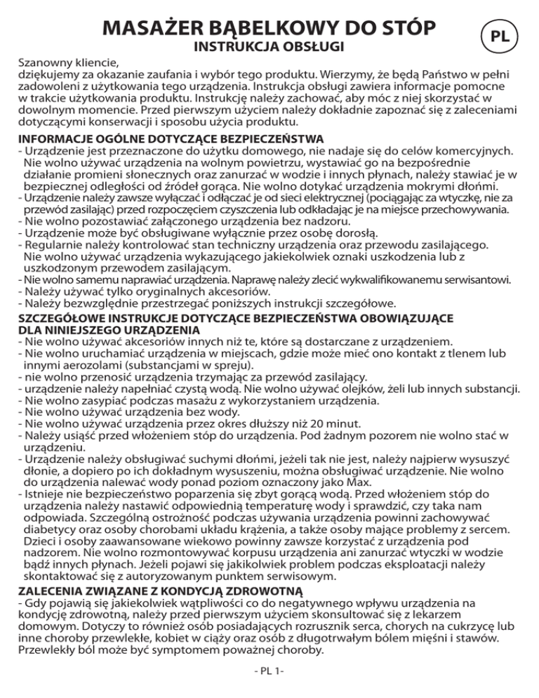 MASAŻER BĄBELKOWY DO STÓP INSTRUKCJA OBSŁUGI PL Szanowny kliencie, dziękujemy za okazanie zaufania i wybór tego produktu. Wierzymy, że będą Państwo w pełni zadowoleni z użytkowania tego urządzenia. Instrukcja obsługi zawiera informacje pomocne w trakcie użytkowania produktu. Instrukcję należy zachować, aby móc z niej skorzystać w dowolnym momencie. Przed pierwszym użyciem należy dokładnie zapoznać się z zaleceniami dotyczącymi konserwacji i sposobu użycia produktu. INFORMACJE OGÓLNE DOTYCZĄCE BEZPIECZEŃSTWA - Urządzenie jest przeznaczone do użytku domowego, nie nadaje się do celów komercyjnych. Nie wolno używać urządzenia na wolnym powietrzu, wystawiać go na bezpośrednie działanie promieni słonecznych oraz zanurzać w wodzie i innych płynach, należy stawiać je w bezpiecznej odległości od źródeł gorąca. Nie wolno dotykać urządzenia mokrymi dłońmi. - Urządzenie należy zawsze wyłączać i odłączać je od sieci elektrycznej (pociągając za wtyczkę, nie za przewód zasilając) przed rozpoczęciem czyszczenia lub odkładając je na miejsce przechowywania. - Nie wolno pozostawiać załączonego urządzenia bez nadzoru. - Urządzenie może być obsługiwane wyłącznie przez osobę dorosłą. - Regularnie należy kontrolować stan techniczny urządzenia oraz przewodu zasilającego. Nie wolno używać urządzenia wykazującego jakiekolwiek oznaki uszkodzenia lub z uszkodzonym przewodem zasilającym. - Nie wolno samemu naprawiać urządzenia. Naprawę należy zlecić wykwalifikowanemu serwisantowi. - Należy używać tylko oryginalnych akcesoriów. - Należy bezwzględnie przestrzegać poniższych instrukcji szczegółowe. SZCZEGÓŁOWE INSTRUKCJE DOTYCZĄCE BEZPIECZEŃSTWA OBOWIĄZUJĄCE DLA NINIEJSZEGO URZĄDZENIA - Nie wolno używać akcesoriów innych niż te, które są dostarczane z urządzeniem. - Nie wolno uruchamiać urządzenia w miejscach, gdzie może mieć ono kontakt z tlenem lub innymi aerozolami (substancjami w spreju). - nie wolno przenosić urządzenia trzymając za przewód zasilający. - urządzenie należy napełniać czystą wodą. Nie wolno używać olejków, żeli lub innych substancji. - Nie wolno zasypiać podczas masażu z wykorzystaniem urządzenia. - Nie wolno używać urządzenia bez wody. - Nie wolno używać urządzenia przez okres dłuższy niż 20 minut. - Należy usiąść przed włożeniem stóp do urządzenia. Pod żadnym pozorem nie wolno stać w urządzeniu. - Urządzenie należy obsługiwać suchymi dłońmi, jeżeli tak nie jest, należy najpierw wysuszyć dłonie, a dopiero po ich dokładnym wysuszeniu, można obsługiwać urządzenie. Nie wolno do urządzenia nalewać wody ponad poziom oznaczony jako Max. - Istnieje nie bezpieczeństwo poparzenia się zbyt gorącą wodą. Przed włożeniem stóp do urządzenia należy nastawić odpowiednią temperaturę wody i sprawdzić, czy taka nam odpowiada. Szczególną ostrożność podczas używania urządzenia powinni zachowywać diabetycy oraz osoby chorobami układu krążenia, a także osoby mające problemy z sercem. Dzieci i osoby zaawansowane wiekowo powinny zawsze korzystać z urządzenia pod nadzorem. Nie wolno rozmontowywać korpusu urządzenia ani zanurzać wtyczki w wodzie bądź innych płynach. Jeżeli pojawi się jakikolwiek problem podczas eksploatacji należy skontaktować się z autoryzowanym punktem serwisowym. ZALECENIA ZWIĄZANE Z KONDYCJĄ ZDROWOTNĄ - Gdy pojawią się jakiekolwiek wątpliwości co do negatywnego wpływu urządzenia na kondycję zdrowotną, należy przed pierwszym użyciem skonsultować się z lekarzem domowym. Dotyczy to również osób posiadających rozrusznik serca, chorych na cukrzycę lub inne choroby przewlekłe, kobiet w ciąży oraz osób z długotrwałym bólem mięśni i stawów. Przewlekły ból może być symptomem poważnej choroby. - PL 1- - Masaż powinien być źródłem przyjemnych i relaksacyjnych odczuć. Jeżeli po masażu odczuwasz dyskomfort lub coś cię boli, skonsultuj się z lekarzem domowym. - Nie wolno używać urządzenia, gdy na stopach są otwarte rany, obrzęki, poparzenia, stany - zapalne, Nikdy nepoužívejte přístroj, pokud máte otevřené rány, cirkulace krve, otoky, popáwystępują problemy z krążeniem krwi oraz, gdyporuchy pojawiają się podrażnienia skóry. 2 Wykaz elementów 1. Pokrętła sterujące 1 3 2. Osłona 3. Korpus 4. Kulki masujące 5. Wskaźnik podłączenia 4 do sieci elektrycznej 6. Wałek masujący 7. Nóżki antypoślizgowe SPOSÓB UŻYCIA Moczenie stóp - Postaw urządzenia na podłodze tak, aby można było przy nim usiąść. - Napełnij urządzenia ciepła lub zimną wodą maksymalnie do poziomu 5 oznaczonego jako MAX. - Podłącz urządzenie to gniazdka 230V/50Hz z uziemieniem, zabezpieczonego wyłącznikiem 6 różnicowoprądowym. - usiądź i włóż stopy do urządzenia. 7 - Wybierz odpowiednie ustawienia zgodnie z poniższymi instrukcjami: Pokrętło ustawiania temperatury: Niska/Wysoka: można wybrać temperaturę z przedziału 25°C do 50°C. Pokrętło wyboru funkcji Możesz poddać swoje stopy następującym zabiegom: - Ogrzewanie / Masaż, - Bąbelki / Ogrzewanie, - Masaż / Bąbelki / Ogrzewanie. Można wykonać masaż głęboko przenikający poruszając stopami w strefach operowania przez wałki masujące. Nakładki z wałkami można wyjąć w prosty sposób. Można je zastąpić nakładkami bez wałków rezygnując z tego typu masażu. Akcesoria: Sześć kulek masujących: nakładka masująca główne punkty masowania. Pumeks: Usuwa zrogowaciały i tłusty naskórek z pięty i stopy. Szczotka do czyszczenia: Usuwa martwy naskórek oraz brud, pomaga w utrzymywaniu stóp w czystości i zdrowiu. Po zakończeniu masażu: Wyłącz urządzenie i odłącz je od sieci elektrycznej. Wylej wodę przez boczne ścianki. Uważaj, żeby nie zalać wodą pokręteł. Zdemontuj akcesoria. - PL 2- CZYSZCZENIE - Przed rozpoczęciem czyszczenia wyjmij wtyc