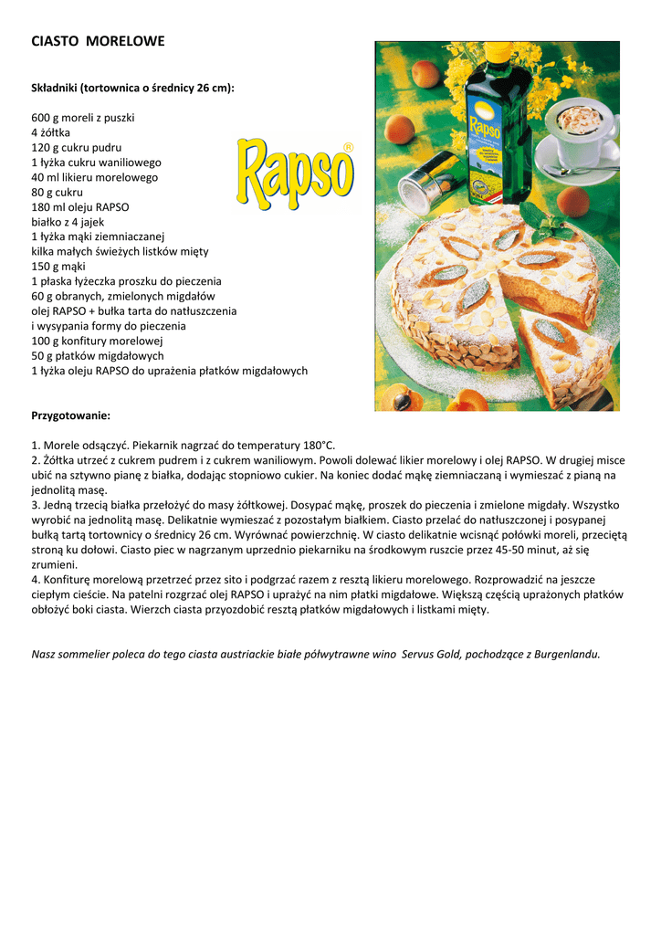 CIASTO MORELOWE Składniki (tortownica o średnicy 26 cm): 600 g moreli z puszki 4 żółtka 120 g cukru pudru 1 łyżka cukru waniliowego 40 ml likieru morelowego 80 g cukru 180 ml oleju RAPSO białko z 4 jajek 1 łyżka mąki ziemniaczanej kilka małych świeżych listków mięty 150 g mąki 1 płaska łyżeczka proszku do pieczenia 60 g obranych, zmielonych migdałów olej RAPSO + bułka tarta do natłuszczenia i wysypania formy do pieczenia 100 g konfitury morelowej 50 g płatków migdałowych 1 łyżka oleju RAPSO do uprażenia płatków migdałowych Przygotowanie: 1. Morele odsączyć. Piekarnik nagrzać do temperatury 180°C. 2. Żółtka utrzeć z cukrem pudrem i z cukrem waniliowym. Powoli dolewać likier morelowy i olej RAPSO. W drugiej misce ubić na sztywno pianę z białka, dodając stopniowo cukier. Na koniec dodać mąkę ziemniaczaną i wymieszać z pianą na jednolitą masę. 3. Jedną trzecią białka przełożyć do masy żółtkowej. Dosypać mąkę, proszek do pieczenia i zmielone migdały. Wszystko wyrobić na jednolitą masę. Delikatnie wymieszać z pozostałym białkiem. Ciasto przelać do natłuszczonej i posypanej bułką tartą tortownicy o średnicy 26 cm. Wyrównać powierzchnię. W ciasto delikatnie wcisnąć połówki moreli, przeciętą stroną ku dołowi. Ciasto piec w nagrzanym uprzednio piekarniku na środkowym ruszcie przez 45-50 minut, aż się zrumieni. 4. Konfiturę morelową przetrzeć przez sito i podgrzać razem z resztą likieru morelowego. Rozprowadzić na jeszcze ciepłym cieście. Na patelni rozgrzać olej RAPSO i uprażyć na nim płatki migdałowe. Większą częścią uprażonych płatków obłożyć boki ciasta. Wierzch ciasta przyozdobić resztą płatków migdałowych i listkami mięty. Nasz sommelier poleca do tego ciasta austriackie białe półwytrawne wino Servus Gold, pochodzące z Burgenlandu.