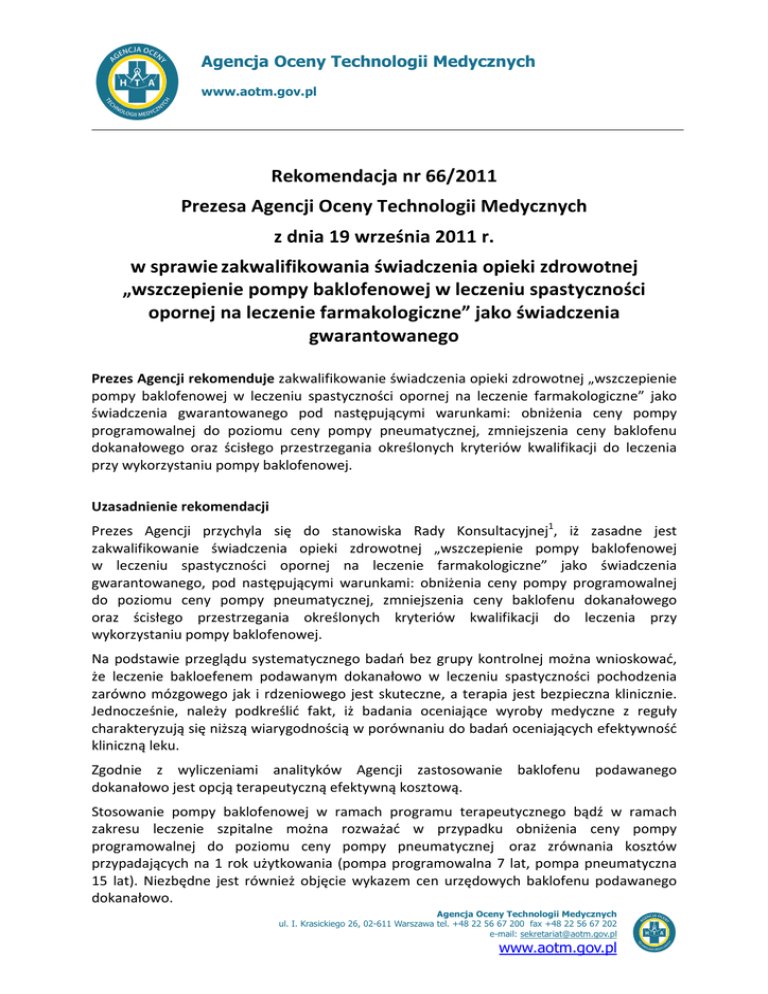 Rekomendacja nr 66/2011 Prezesa Agencji Oceny Technologii