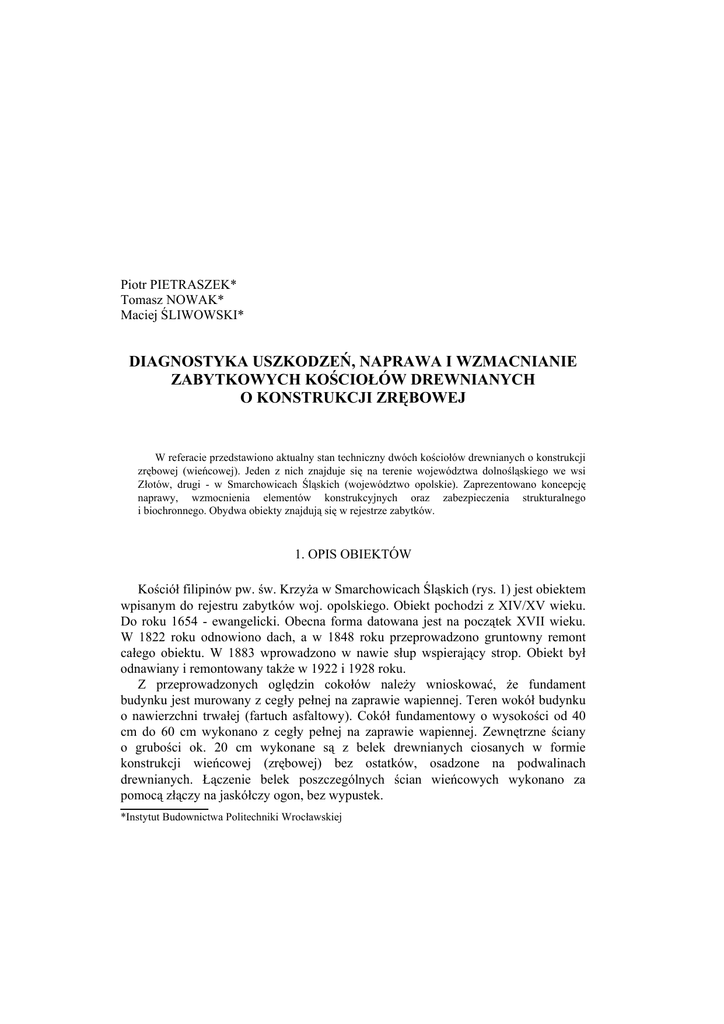 Piotr PIETRASZEK* Tomasz NOWAK* Maciej ŚLIWOWSKI* DIAGNOSTYKA USZKODZEŃ, NAPRAWA I WZMACNIANIE ZABYTKOWYCH KOŚCIOŁÓW DREWNIANYCH O KONSTRUKCJI ZRĘBOWEJ W referacie przedstawiono aktualny stan techniczny dwóch kościołów drewnianych o konstrukcji zrębowej (wieńcowej). Jeden z nich znajduje się na terenie województwa dolnośląskiego we wsi Złotów, drugi - w Smarchowicach Śląskich (województwo opolskie). Zaprezentowano koncepcję naprawy, wzmocnienia elementów konstrukcyjnych oraz zabezpieczenia strukturalnego i biochronnego. Obydwa obiekty znajdują się w rejestrze zabytków. 1. OPIS OBIEKTÓW Kościół filipinów pw. św. Krzyża w Smarchowicach Śląskich (rys. 1) jest obiektem wpisanym do rejestru zabytków woj. opolskiego. Obiekt pochodzi z XIV/XV wieku. Do roku 1654 - ewangelicki. Obecna forma datowana jest na początek XVII wieku. W 1822 roku odnowiono dach, a w 1848 roku przeprowadzono gruntowny remont całego obiektu. W 1883 wprowadzono w nawie słup wspierający strop. Obiekt był odnawiany i remontowany także w 1922 i 1928 roku. Z przeprowadzonych oględzin cokołów należy wnioskować, że fundament budynku jest murowany z cegły pełnej na zaprawie wapiennej. Teren wokół budynku o nawierzchni trwałej (fartuch asfaltowy). Cokół fundamentowy o wysokości od 40 cm do 60 cm wykonano z cegły pełnej na zaprawie wapiennej. Zewnętrzne ściany o grubości ok. 20 cm wykonane są z belek drewnianych ciosanych w formie konstrukcji wieńcowej (zrębowej) bez ostatków, osadzone na podwalinach drewnianych. Łączenie belek poszczególnych ścian wieńcowych wykonano za pomocą złączy na jaskółczy ogon, bez wypustek. *Instytut Budownictwa Politechniki Wrocławskiej 280 Rys. 1. Kościół w Smarchowicach Śląskich Fig. 1. Church in Smarchowice Śląskie Rys. 2. Kościół w Złotowie Fig. 2. Church in Złotów Ściany wieży wykonano jako słupowo-ryglowe, drewniane oszalowane od zewnątrz deskami gr. 25 mm. Konstrukcję dachu obiektu stanowi więźba drewniana. Konstrukcję można opisać jako jętkową z dolnymi tramami w postaci belek stropu pod poddaszem – rys. 5. 281 Połączenia poszczególnych elementów w węzłach realizowane są na wręby z kołkami drewnianymi. Usztywnienie wiązarów w ich płaszczyźnie wykonano za pomocą zastrzałów. Usztywnienie podłużne zapewnia jedna ścianka stolcowa z zastrzałami i mieczami. Pokrycie kościoła i wieży - gontem drewnianym. Brak odwodnień i opierzeń – woda odprowadzana bezpośrednio z okapów. Nie stwierdzono w budynku izolacji pionowych fundamentów lub poziomych pomiędzy cokołem a belkami podwalinowymi. Kościół w Złotowie (rys. 2) jest obiektem opisanym w Katalogu Zabytków Sztuki w Polsce. Budowę Kościoła ukończono w 1754 r. Z przeprowadzonych badań cokołów należy wnioskować, że fundament budynku stanowią fundamenty kamienne na zaprawie gliniano-piaskowej. Zewnętrzne ściany budynku o grubości 17 cm wykonane są z bali drewnianych struganych w formie konstrukcji wieńcowej. Ściany zewnętrzne osadzono na podwalinach drewnianych. Ściany wieży wykonano jako ryglowe, drewniane oszalowane od zewnątrz deskami. Konstrukcję dachu obiektu stanowi więźba drewniana, płatwiowo-jętkowa ze ściągami. Pokrycie z blachy stalowej ocynkowanej. 2. OCENA STANU TECHNICZNEGO W obu kościołach na podstawie stanu murów (cokołów) oraz deformacji konstrukcji drewnianej można sądzić, że nie występują nadmierne osiadania gruntu. Nie stwierdzono nigdzie pęknięć cokołów, świadczących o tym, że stan fundamentów jest zły. Miejscowo cokoły były już wzmacniane - na całym obwodzie budynków zaprawa z zewnętrznych spoin nie jest wymyta, spoiny pełne, zwarte. Stan ogólny fundamentów i cokołów można uznać za średni, ale nie wymagający napraw. Ściany zewnętrzne omawianych budynków o konstrukcji wieńcowej, zwłaszcza w swojej dolnej części są znacznie uszkodzone przez korozję biologiczną. Dotyczy to głównie belek podwalinowych oraz dwóch belek powyżej podwaliny. Stwierdzono III stopień korozji biologicznej. Uszkodzone przez korozję biologiczną są również krawędzie belek wieńcowych ułożonych powyżej podwalin. Stwierdzono obecność owadów – szkodników drewna. Górna część ścian wieńcowych (belki, oczepy) są w dużo lepszym stanie – porażenie jest dużo mniejsze, miejscowe. Po ociosaniu i po impregnacji drewno może być dalej konstrukcyjnie użytkowane. Stan części końcówek połączeń belek, czyli tzw. jaskółczych ogonów i ostatków jest zły, zwłaszcza tych krzyżujących się pod kątem prostym – występuje znaczna destrukcja wywołana działaniem szkodników biologicznych. W budynku kościoła w Smarchowicach Śląskich ściany wieńcowe na całym obwodzie budynku są znacznie wychylone z pionu i z płaszczyzny (rys .1). Największa deformacja występuje na styku ściany szczytowej nawy głównej ze 282 ścianami prezbiterium – odchylenia od pionu dochodzą do 15 cm. Z przeprowadzonych pomiarów wynika również, że ściany na wysokości są lokalnie wyboczone. Deformacja ścian powoduje znaczną deformację połączeń na jaskółczy ogon – pomiędzy poszczególnymi belkami powstają szerokie szczeliny, do których wnika woda opadowa i powoduje korozję biologiczną końcówek belek. Deformacja ścian powoduje również deformacje obramowań okien i drzwi. Konstrukcja szkieletowa wież jest w stanie technicznym średnim, miejscowo występują porażenia przez owady, I – II stopnia. Elementy konstrukcji wież, w tym elementy wsporcze dzwonu, wymagają miejscowego usunięcia ognisk korozyjnych i impregnacji. Słupy konstrukcji w obu obiektach są w stanie dobrym. Stan konstrukcji dachów ogólnie można ocenić jako niezadowalający w przypadku Kościoła w Smarchowicach Śląskich oraz średni w Kościele w Złotowie. Elementy więźby dachowej (łaty, krokwie, płatwie, słupy, miecze, belki stropowe - ściągi