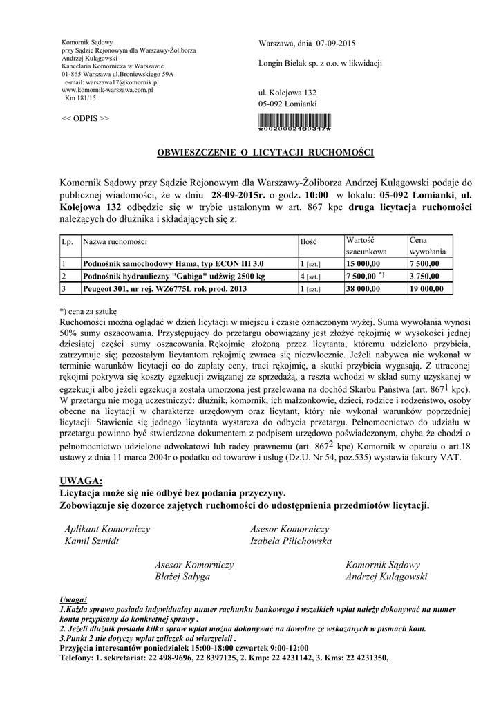 Komornik Sądowy przy Sądzie Rejonowym dla Warszawy-Żoliborza Andrzej Kulągowski Kancelaria Komornicza w Warszawie 01-865 Warszawa ul.Broniewskiego 59A e-mail: [email protected] www.komornik-warszawa.com.pl Km 181/15 Warszawa, dnia 07-09-2015 << ODPIS >> *0020002190317* Longin Bielak sp. z o.o. w likwidacji ul. Kolejowa 132 05-092 Łomianki OBWIESZCZENIE O LICYTACJI RUCHOMOŚCI Komornik Sądowy przy Sądzie Rejonowym dla Warszawy-Żoliborza Andrzej Kulągowski podaje do publicznej wiadomości, że w dniu 28-09-2015r. o godz. 10:00 w lokalu: 05-092 Łomianki, ul. Kolejowa 132 odbędzie się w trybie ustalonym w art. 867 kpc druga licytacja ruchomości należących do dłużnika i składających się z: Lp. Nazwa ruchomości Ilość 1 2 3 Podnośnik samochodowy Hama, typ ECON III 3.0 Podnośnik hydrauliczny "Gabiga" udźwig 2500 kg Peugeot 301, nr rej. WZ6775L rok prod. 2013 1 [szt.] 4 [szt.] 1 [szt.] Wartość szacunkowa 15 000,00 7 500,00 *) 38 000,00 Cena wywołania 7 500,00 3 750,00 19 000,00 *) cena za sztukę Ruchomości można oglądać w dzień licytacji w miejscu i czasie oznaczonym wyżej. Suma wywołania wynosi 50% sumy oszacowania. Przystępujący do przetargu obowiązany jest złożyć rękojmię w wysokości jednej dziesiątej części sumy oszacowania. Rękojmię złożoną przez licytanta, któremu udzielono przybicia, zatrzymuje się; pozostałym licytantom rękojmię zwraca się niezwłocznie. Jeżeli nabywca nie wykonał w terminie warunków licytacji co do zapłaty ceny, traci rękojmię, a skutki przybicia wygasają. Z utraconej rękojmi pokrywa się koszty egzekucji związanej ze sprzedażą, a reszta wchodzi w skład sumy uzyskanej w egzekucji albo jeżeli egzekucja została umorzona jest przelewana na dochód Skarbu Państwa (art. 8671 kpc). W przetargu nie mogą uczestniczyć: dłużnik, komornik, ich małżonkowie, dzieci, rodzice i rodzeństwo, osoby obecne na licytacji w charakterze urzędowym oraz licytant, który nie wykonał warunków poprzedniej licytacji. Stawienie się jednego licytanta wystarcza do odbycia przetargu. Pełnomocnictwo do udziału w przetargu powinno być stwierdzone dokumentem z podpisem urzędowo poświadczonym, chyba że chodzi o pełnomocnictwo udzielone adwokatowi lub radcy prawnemu (art. 8672 kpc) Komornik w oparciu o art.18 ustawy z dnia 11 marca 2004r o podatku od towarów i usług (Dz.U. Nr 54, poz.535) wystawia faktury VAT. UWAGA: Licytacja może się nie odbyć bez podania przyczyny. Zobowiązuje się dozorce zajętych ruchomości do udostępnienia przedmiotów licytacji. Aplikant Komorniczy Kamil Szmidt Asesor Komorniczy Izabela Pilichowska Asesor Komorniczy Błażej Sałyga Komornik Sądowy Andrzej Kulągowski Uwaga! 1.Każda sprawa posiada indywidualny numer rachunku bankowego i wszelkich wplat należy dokonywać na numer konta przypisany do konkretnej sprawy . 2. Jeżeli dłużnik posiada kilka spraw wpłat można dokonywać na dowolne ze wskazanych w pismach kont. 3.Punkt 2 nie dotyczy wpłat zaliczek od wierzycieli . Przyjęcia interesantów poniedziałek 15:00-18:00 czwartek 9:00-12:00 Telefony: 1. sekretariat: 22 498-9696, 22 8397125, 2. Kmp: 22 4231142, 3. Kms: 22 4231350, 4. Km: 22 4231143, 22 4231349, 5. nieruchomości: 22 3945149 Fax 22 8694792 w/w telefony czynne są codziennie w godz. 12:00 - 14:00. 5. Kontakt drogą elektroniczną dla spraw alimentacyjnych : [email protected], dla spraw KMS : [email protected] Adresat oryginału: Sąd Rejonowy dla Warszawy Żoliborza w Warszawie Oddział Administracyjny Do wiadomości: 1. Longin Bielak sp. z o.o. w likwidacji, 05-092 Łomianki 2. Andrzej Kraczkiewicz, 02-536 Warszawa 3. Maciej Wesołowski, 05-092 Łomianki 4. Auto Łomianki Zdzisław Kuflewski, 05-092 Łomianki 5. a/a