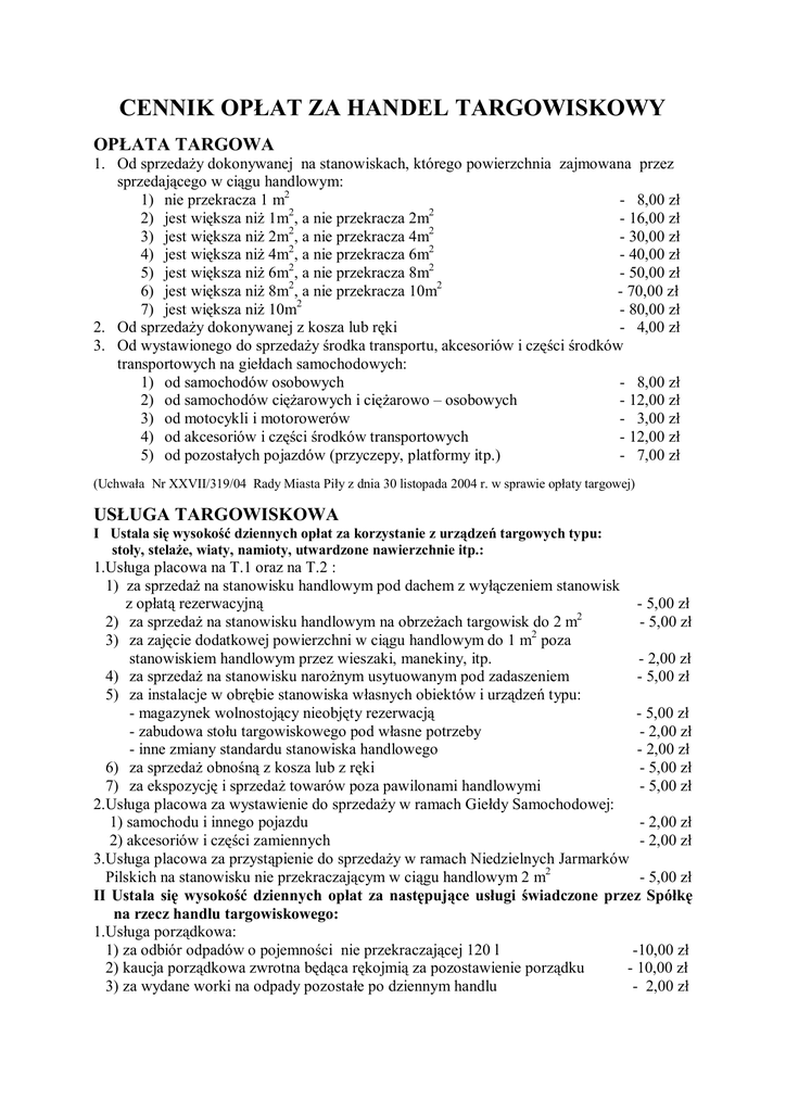cennik opłat za handel targowiskowy