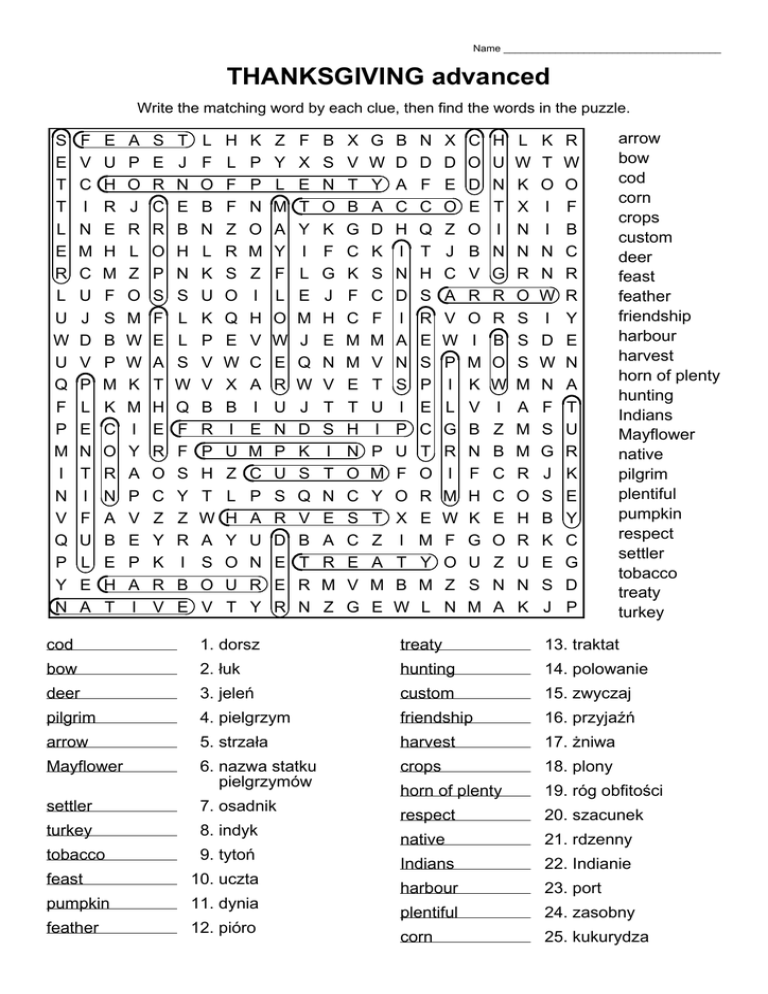Name ______________________________________ THANKSGIVING advanced Write the matching word by each clue, then find the words in the puzzle. S E T T L E R L U W U Q F P M I N V Q P Y N F V C I N M C U J D V P L E N T I F U L E A E U H R E H M F S B P M K C O R N A B E H T A P O J R L Z O M W W K M I Y A P V E P A I S E R C R O P S F E A T H E R O C Z Y K R V T J N E B H N S L L S W Q F F S Y Z R I B E L F O B N L K U K P V V B R P H T W A S O V H L F F Z R S O Q E W X B I U Z L H Y O U T K P P N O M Z I H V C A I E M C P A U N R Y Z Y L M A Y F L O W E R U N P U S R D E E R F X E T Y I L E M J Q W J D K S Q V B T R N B S N O K F G J H E N V T S I T N E A R M Z X V T B G C K F C M M E T H N O C S C E V G G W Y A D K S C F M V T U I P M Y T Z A M E B D A C H I N D I A N S I P U F O X I T B W N D F C Q T H S R E S P E C T O R E M Y M L X D E O Z J C A V W P I L G R I M W F O Z N C O D E O B V R O I M K V B N F H K G U S M H U N T I N G R R B O W I Z B C C E O Z N A L W K X N N R O S S S M A M M R O H R U N K K T O I I N N W I D W N F S G J S B K E S J R W O F B C R R Y E N A T U R K E Y C G D P arrow bow cod corn crops custom deer feast feather friendship harbour harvest horn of plenty hunting Indians Mayflower native pilgrim plentiful pumpkin respect settler tobacco treaty turkey cod 1. dorsz treaty 13. traktat bow 2. łuk hunting 14. polowanie deer 3. jeleń custom 15. zwyczaj pilgrim 4. pielgrzym friendship 16. przyjaźń arrow 5. strzała harvest 17. żniwa Mayflower 6. nazwa statku pielgrzymów crops 18. plony horn of plenty 19. róg obfitości settler 7. osadnik respect 20. szacunek turkey 8. indyk native 21. rdzenny tobacco 9. tytoń Indians 22. Indianie harbour 23. port plentiful 24. zasobny corn 25. kukurydza feast 10. uczta pumpkin 11. dynia feather 12. pióro