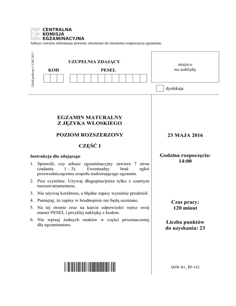 Układ graficzny © CKE 2013 Arkusz zawiera informacje prawnie chronione do momentu rozpoczęcia egzaminu. UZUPEŁNIA ZDAJĄCY KOD PESEL miejsce na naklejkę dysleksja EGZAMIN MATURALNY Z JĘZYKA WŁOSKIEGO POZIOM ROZSZERZONY 23 MAJA 2016 CZĘŚĆ I Instrukcja dla zdającego 1. Sprawdź, czy arkusz egzaminacyjny zawiera 7 stron (zadania 1 – 3). Ewentualny brak zgłoś przewodniczącemu zespołu nadzorującego egzamin. Godzina rozpoczęcia: 14:00 2. Pisz czytelnie. Używaj długopisu/pióra tylko z czarnym tuszem/atramentem. 3. Nie używaj korektora, a błędne zapisy wyraźnie przekreśl. 4. Pamiętaj, że zapisy w brudnopisie nie będą oceniane. 5. Na tej stronie oraz na karcie odpowiedzi wpisz swój numer PESEL i przyklej naklejkę z kodem. 6. Nie wpisuj żadnych znaków w części przeznaczonej dla egzaminatora. Czas pracy: 120 minut Liczba punktów do uzyskania: 23 MJW-R1_1P-162 Egzamin maturalny z języka włoskiego Poziom rozszerzony – część I STOSOWANIE STRUKTUR LEKSYKALNO-GRAMATYCZNYCH Zadanie 1. (3 pkt) Uzupełnij każdą lukę (1.1.–1.6.) jednym wyrazem, przekształcając wyraz podany w nawiasie, tak aby otrzymać logiczny i gramatycznie poprawny tekst. Wymagana jest pełna poprawność ortograficzna wpisywanych wyrazów. Za każde poprawne rozwiązanie otrzymasz 0,5 punktu. A VOLTE POCO È TANTO È lungo appena 4 metri ed è la casa vacanza più piccola d’Italia. Si tratta di un appartamento in miniatura 1.1. (dotare)____________ però di ogni comfort: il divano diventa letto, c’è l’accesso a Internet e l’impianto hi-fi per la TV. Situato nel centro 1.2. (storia)____________ di Milano, l’appartamentino è stato ristrutturato da poco, con elementi di 1.3. (arredare)____________ all’avanguardia: mattoni trasparenti, soffitti in legno e zona notte separata dalla zona giorno. Anche la 1.4. (bello)____________ della zona è indubbia. L’appartamento si trova in una casa del XVIII secolo che è abitata dagli anni Trenta del Novecento. Abbandonata per molti 1.5. (dieci)____________, alla fine è stata venduta ad un cittadino romano. Ora è possibile affittare il mini monolocale. È perfetto per un soggiorno in due: il proprietario ci ha vissuto insieme alla moglie fino alla 1.6. (nascere)____________ delle due figlie! adattato da: www.huffingtonpost.it Strona 2 z 7 MJW-1R Egzamin maturalny z języka włoskiego Poziom rozszerzony – część I Zadanie 2. (2 pkt) Wykorzystując wyrazy podane drukowanymi literami, uzupełnij każde zdanie z luką, tak aby zachować sens zdania wyjściowego (2.1.–2.4.). W każdą lukę można wpisać maksymalnie trzy wyrazy, wliczając w to wyraz już podany. Wymagana jest pełna poprawność ortograficzna i gramatyczna wpisywanych fragmentów zdań. Uwaga: nie zmieniaj formy podanych wyrazów. Za każde poprawne rozwiązanie otrzymasz 0,5 punktu. 2.1. La mamma dice ai figli: “Non uscite fuori!” DI La mamma dice ai figli ______________________________ fuori. 2.2. Marco sta facendo i compiti anche se sta male. BENCHÉ Marco sta facendo i compiti ______________________________ male. 2.3. Alice è intelligente. Clara è ugualmente intelligente. COSÌ Clara è________________________________________ Alice. 2.4. Sai quante persone vengono alla festa? GENTE Sai ___________________________________ alla festa? MJW-1R Strona 3 z 7 Egzamin maturalny z języka włoskiego Poziom rozszerzony – część I WYPOWIEDŹ PISEMNA Zadanie 3. (18 pkt) Wypowiedz się na jeden z trzech poniższych tematów. Wypowiedź powinna zawierać od 200 do 250 słów i spełniać wszystkie wymogi typowe dla formy wskazanej w poleceniu. Zaznacz wybrany temat, zakreślając jego numer. 1. W ostatnich czasach coraz częściej można znaleźć ogłoszenia w Internecie, w których oferuje się wolne miejsca podczas wspólnych podróży samochodem. Napisz rozprawkę, w której przedstawisz wady i zalety takiego sposobu podróżowania. 2. Napisz recenzję książki podróżniczej, która zwróciła Twoją uwagę ze względu na atrakcyjną szatę graficzną oraz załączone do niej materiały dodatkowe. 3. Napisz opowiadanie o wydarzeniu mającym miejsce podczas festiwalu filmowego, które spowodowało, że poznałeś(-aś) ciekawą osobę i dostałeś(-aś) atrakcyjną ofertę pracy. Uwaga: jeśli praca będzie zawierać więcej niż 300 słów, otrzymasz za jej kompozycję 0 punktów. CZYSTOPIS ..................................................................................................................................... ..................................................................................................................................... ..................................................................................................................................... ..................................................................................................................................... ..................................................................................................................................... ..................................................................................................................................... ..................................................................................................................................... ..................................................................................................................................... ..................................................................................................................................... ..................................................................................................................................... ..................................................................................................................................... ............................................................................................................................