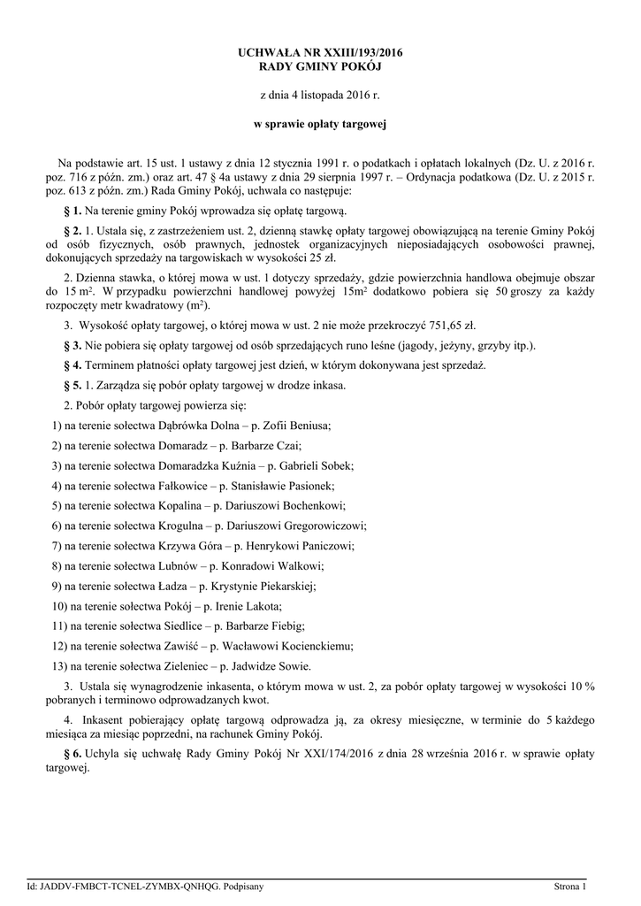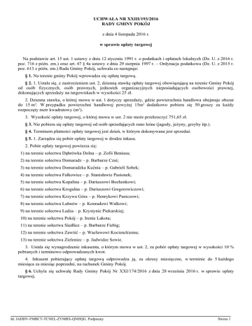 UCHWAŁA NR XXIII/193/2016 RADY GMINY POKÓJ z dnia 4 listopada 2016 r. w sprawie opłaty targowej Na podstawie art. 15 ust. 1 ustawy z dnia 12 stycznia 1991 r. o podatkach i opłatach lokalnych (Dz. U. z 2016 r. poz. 716 z późn. zm.) oraz art. 47 § 4a ustawy z dnia 29 sierpnia 1997 r. – Ordynacja podatkowa (Dz. U. z 2015 r. poz. 613 z późn. zm.) Rada Gminy Pokój, uchwala co następuje: § 1. Na terenie gminy Pokój wprowadza się opłatę targową. § 2. 1. Ustala się, z zastrzeżeniem ust. 2, dzienną stawkę opłaty targowej obowiązującą na terenie Gminy Pokój od osób fizycznych, osób prawnych, jednostek organizacyjnych nieposiadających osobowości prawnej, dokonujących sprzedaży na targowiskach w wysokości 25 zł. 2. Dzienna stawka, o której mowa w ust. 1 dotyczy sprzedaży, gdzie powierzchnia handlowa obejmuje obszar do 15 m2. W przypadku powierzchni handlowej powyżej 15m2 dodatkowo pobiera się 50 groszy za każdy rozpoczęty metr kwadratowy (m2). 3. Wysokość opłaty targowej, o której mowa w ust. 2 nie może przekroczyć 751,65 zł. § 3. Nie pobiera się opłaty targowej od osób sprzedających runo leśne (jagody, jeżyny, grzyby itp.). § 4. Terminem płatności opłaty targowej jest dzień, w którym dokonywana jest sprzedaż. § 5. 1. Zarządza się pobór opłaty targowej w drodze inkasa. 2. Pobór opłaty targowej powierza się: 1) na terenie sołectwa Dąbrówka Dolna – p. Zofii Beniusa; 2) na terenie sołectwa Domaradz – p. Barbarze Czai; 3) na terenie sołectwa Domaradzka Kuźnia – p. Gabrieli Sobek; 4) na terenie sołectwa Fałkowice – p. Stanisławie Pasionek; 5) na terenie sołectwa Kopalina – p. Dariuszowi Bochenkowi; 6) na terenie sołectwa Krogulna – p. Dariuszowi Gregorowiczowi; 7) na terenie sołectwa Krzywa Góra – p. Henrykowi Paniczowi; 8) na terenie sołectwa Lubnów – p. Konradowi Walkowi; 9) na terenie sołectwa Ładza – p. Krystynie Piekarskiej; 10) na terenie sołectwa Pokój – p. Irenie Lakota; 11) na terenie sołectwa Siedlice – p. Barbarze Fiebig; 12) na terenie sołectwa Zawiść – p. Wacławowi Kocienckiemu; 13) na terenie sołectwa Zieleniec – p. Jadwidze Sowie. 3. Ustala się wynagrodzenie inkasenta, o którym mowa w ust. 2, za pobór opłaty targowej w wysokości 10 % pobranych i terminowo odprowadzanych kwot. 4. Inkasent pobierający opłatę targową odprowadza ją, za okresy miesięczne, w terminie do 5 każdego miesiąca za miesiąc poprzedni, na rachunek Gminy Pokój. § 6. Uchyla się uchwałę Rady Gminy Pokój Nr XXI/174/2016 z dnia 28 września 2016 r. w sprawie opłaty targowej. Id: JADDV-FMBCT-TCNEL-ZYMBX-QNHQG. Podpisany Strona 1 § 7. Uchwała podlega publikacji w Dzienniku Urzędowym Województwa Opolskiego i wchodzi w życie z dniem 1 stycznia 2017 r. Przewodniczący Rady Gminy Jacek Gosławski Id: JADDV-FMBCT-TCNEL-ZYMBX-QNHQG. Podpisany Strona 2