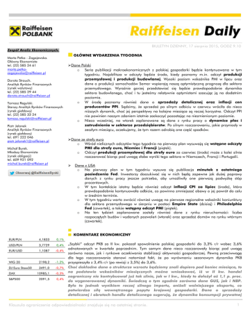 BIULETYN DZIENNY, 17 sierpnia 2015, GODZ 9.10 Zespół Analiz Ekonomicznych: GŁÓWNE WYDARZENIA TYGODNIA Marta Petka - Zagajewska. Główny Ekonomista tel. (22) 585 24 61 [email protected] Dorota Strauch. Analityk Rynków Finansowych (rynek walutowy) tel. (22) 585 29 44 [email protected] Tomasz Regulski. Starszy Analityk Rynków Finansowych (rynek giełdowy) tel. (22) 585 33 24 [email protected] Piotr Jelonek Analityk Rynków Finansowych (rynek giełdowy) tel. 691 222 046 [email protected] Dane Polski o Seria publikacji makroekonomicznych z polskiej gospodarki będzie kontynuowana w tym tygodniu. Najobfitsza w odczyty będzie środa, kiedy poznamy m.in. odczyt produkcji przemysłowej i produkcji budowlanej. Wysoki poziom wskaźnika PMI w lipcu oraz dane o produkcji samochodów Samar wspierają naszą optymistyczną prognozę dla sektora przemysłowego. Wyraźnie gorzej przedstawiać się będzie prawdopodobnie dynamika sektora budowlanego, choć i tu jesteśmy relatywnie optymistami szacując ją na dodatnim poziomie. o W środę poznamy również dane o sprzedaży detalicznej oraz inflacji cen producentów PPI. Sądzimy, że sprzedaż po silnym odbiciu w czerwcu wróciła do nieco niższych dynamik, choć jej perspektywy na kolejne miesiące są raczej korzystne. Odczyt PPI nie powinien naszym zdaniem istotnie zaskoczyć pozostając na niezmienionym poziomie. o Nieco wcześniej, na wtorek zaplanowane są dane z rynku pracy o dynamice płac i zatrudnienia w sektorze przedsiębiorstw. Po silnym rozczarowaniu, jakie przyniosły w zeszłym miesiącu, oczekujemy, że tym razem odrobią one część spadków. Dane ze strefy euro o Wśród nielicznych odczytów tego tygodnia na pierwszy plan wysuwają się wstępne odczyty PMI dla strefy euro, Niemiec i Francji (piątek). o Odczyt produkcji przemysłowej dla strefy euro za czerwiec (środa) może z kolei silnie rozczarować biorąc pod uwagę słabe wyniki tego sektora w Niemczech, Francji i Portugalii. Michał Burek. Młodszy Ekonomista (rynek obligacji) tel. 609 921 092 [email protected] Dane z USA o Na pierwszy plan w tym tygodniu wysuwa się publikacja minutek z ostatniego posiedzenia Fed. Inwestorzy doszukiwać się w nich będą zapewne jak dużej poprawy danych z rynku pracy jeszcze potrzeba, aby umożliwiły one pierwszą podwyżkę stóp procentowych. o W tym kontekście istotny będzie również odczyt inflacji CPI za lipiec (środa), która prawdopodobnie kontynuowała odbicie, co powinno zmniejszać obawy o jej powrót do celu w średnim terminie. o W tym tygodniu warto zwrócić również uwagę na pierwsze regionalne wskaźniki koniunktury dla sektora przemysłowego w sierpniu w postaci Empire State (dzisiaj) i Philadelphia Fed (czwartek), a także wstępny odczyt PMI (piątek). o Na ten tydzień zaplanowane zostały również dane z rynku nieruchomości: liczba rozpoczętych budów i wydanych pozwoleń (wtorek) oraz sprzedaż domów na rynku wtórnym (czwartek). KOMENTARZ EKONOMICZNY EUR/PLN 4,1833 0,1% USD/PLN 3,7729 0,4% EUR/USD 1,1087 -0,4% WIG 20 2198,2 -1,2% DJ Euro Stoxx50 DAX S&P500 3491,0 -0,7% 10985,1 -0,3% 2091,5 0,4% „Szybki” odczyt PKB za II kw. pokazał spowolnienie polskiej gospodarki do 3,3% r/r wobec 3,6% odnotowanych w kwartale poprzednim. Tym samym dane nieco rozczarowały biorąc pod uwagę zarówno nasze, jak i rynkowe oczekiwania stabilizacji aktywności gospodarczej. Pewną przeciwwagę dla tego rozczarowania stanowi natomiast fakt, że po wyrównaniu sezonowym dynamika PKB przyspieszyła z 3,4% r/r (po rewizji z 3,5%) do 3,6%. Choć dokładne dane o strukturze wzrostu będziemy znali dopiero pod koniec miesiąca, to na podstawie wskaźników miesięcznych można wnioskować, iż w II kw. handel zagraniczny nie kontrybuował już tak silnie, jak w I kw., kiedy to dołożył aż 1,1 p. proc. do wygenerowanej dynamiki. Świadczą o tym zgodnie zarówno dane GUS, jak i NBP. Było to jednak wynikiem raczej silnego importu, aniżeli wolniejszego eksportu, co potwierdza siłę wewnętrznego popytu krajowej gospodarki. Dane o sprzedaży detalicznej i obrotach handlu detalicznego sugerują, że dynamika konsumpcji prywatnej Klauzula ograniczenia odpowiedzialności znajduje się na ostatniej stronie. 1 BIULETYN DZIENNY, 17 sierpnia 2015, GODZ 9.10 pozostała relatywnie stabilna w okolicy 3% r/r. Dynamika inwestycji z kolei najprawdopodobniej utrzymała się w pobliżu 10% r/r. Pewną niewiadomą stanowią zapasy, które w I kw. uszczupliły wzrost aż o 1,5 p. proc. oraz wydatki rządowe. Te z jednej strony w roku wyborczym raczej nie powinny zwalniać, jednak wykonanie budżetu państwa sugeruje, że rząd wydawał mniej niż planował. Piątkowe dane wpisują się w serię nieco rozczarowujących odczytów o dynamice aktywności ekonomicznej w II kw. z pozostałych krajów europejskich (z Francji, Włoch i Niemiec), które są również istotnymi partnerami handlowymi Polski. Wskaźniki koniunktury (w tym odbicie PMI) sugerują jednak, że było to chwilowe spowolnienie, a wzrost w II połowie roku w Polsce powinien zmierzać w stronę 4%. Inflacja bazowa przyspieszyła w lipcu do 0,4% r/r wobec 0,2% r/r miesiąc wcześniej. Konsensus rynkowy zakładał, że wskaźnik utrzyma się na poziomie z minionego miesiąca, ale bazował on na – jak się okazało – zbyt niskich prognozach ogólnego indeksu inflacji. Przypominamy, że ten zaskoczył w czwartek wzrostem z -0,8% r/r do -0,7% r/r głównie za sprawą wyższych cen leków czy usług telekomunikacyjnych, a więc kategorii ujmowanych także w ramach inflacji bazowej. KOMENTARZ WALUTOWY Próby zejścia EURPLN pod 4,18 zostały w piątek zahamowane przez rozczarowanie wynikami PKB w Europie za I kwartał. Nieoczekiwany spadek dynamiki PKB w Polsce przełożył się na wybicie EURPLN nad 4,19. W nowym tygodniu publikacje makro nie powinny już szkodzić złotemu, jednak czynnik ryzyka w postaci oczekiwań na podwyżkę stóp w USA i wyborów parlamentarnych 