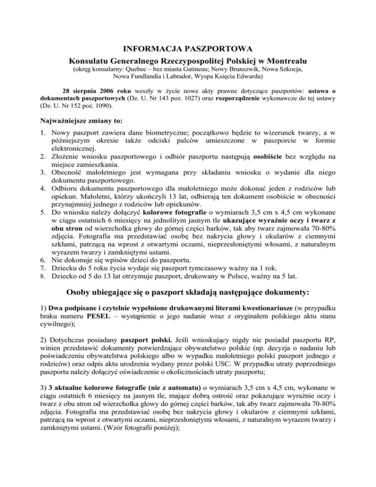 INFORMACJA PASZPORTOWA Konsulatu Generalnego Rzeczypospolitej Polskiej w Montrealu (okręg konsularny: Quebec – bez miasta Gatineau; Nowy Brunszwik, Nowa Szkocja, Nowa Fundlandia i Labrador, Wyspa Księcia Edwarda) 28 sierpnia 2006 roku weszły w życie nowe akty prawne dotyczące paszportów: ustawa o dokumentach paszportowych (Dz. U. Nr 143 poz. 1027) oraz rozporządzenie wykonawcze do tej ustawy (Dz. U. Nr 152 poz. 1090). Najważniejsze zmiany to: 1. Nowy paszport zawiera dane biometryczne; początkowo będzie to wizerunek twarzy, a w późniejszym okresie także odciski palców umieszczone w paszporcie w formie elektronicznej. 2. Złożenie wniosku paszportowego i odbiór paszportu następują osobiście bez względu na miejsce zamieszkania. 3. Obecność małoletniego jest wymagana przy składaniu wniosku o wydanie dla niego dokumentu paszportowego. 4. Odbioru dokumentu paszportowego dla małoletniego może dokonać jeden z rodziców lub opiekun. Małoletni, którzy ukończyli 13 lat, odbierają ten dokument osobiście w obecności przynajmniej jednego z rodziców lub opiekunów. 5. Do wniosku należy dołączyć kolorowe fotografie o wymiarach 3,5 cm x 4,5 cm wykonane w ciągu ostatnich 6 miesięcy na jednolitym jasnym tle ukazujące wyraźnie oczy i twarz z obu stron od wierzchołka głowy do górnej części barków, tak aby twarz zajmowała 70-80% zdjęcia. Fotografia ma przedstawiać osobę bez nakrycia głowy i okularów z ciemnymi szkłami, patrzącą na wprost z otwartymi oczami, nieprzesłoniętymi włosami, z naturalnym wyrazem twarzy i zamkniętymi ustami. 6. Nie dokonuje się wpisów dzieci do paszportu. 7. Dziecku do 5 roku życia wydaje się paszport tymczasowy ważny na 1 rok. 8. Dziecko od 5 do 13 lat otrzymuje paszport, drukowany w Polsce, ważny na 5 lat. Osoby ubiegające się o paszport składają następujące dokumenty: 1) Dwa podpisane i czytelnie wypełnione drukowanymi literami kwestionariusze (w przypadku braku numeru PESEL – wystąpienie o jego nadanie wraz z oryginałem polskiego aktu stanu cywilnego); 2) Dotychczas posiadany paszport polski. Jeśli wnioskujący nigdy nie posiadał paszportu RP, winien przedstawić dokumenty potwierdzające obywatelstwo polskie (np. decyzja o nadaniu lub poświadczeniu obywatelstwa polskiego albo w wypadku małoletniego polski paszport jednego z rodziców) oraz odpis aktu urodzenia wydany przez polski USC. W przypadku utraty poprzedniego paszportu należy dołączyć oświadczenie o okolicznościach utraty paszportu; 3) 3 aktualne kolorowe fotografie (nie z automatu) o wymiarach 3,5 cm x 4,5 cm, wykonane w ciągu ostatnich 6 miesięcy na jasnym tle, mające dobrą ostrość oraz pokazujące wyraźnie oczy i twarz z obu stron od wierzchołka głowy do górnej części barków, tak aby twarz zajmowała 70-80% zdjęcia. Fotografia ma przedstawiać osobę bez nakrycia głowy i okularów z ciemnymi szkłami, patrzącą na wprost z otwartymi oczami, nieprzesłoniętymi włosami, z naturalnym wyrazem twarzy i zamkniętymi ustami. (Wzór fotografii poniżej); 4) dokument potwierdzający pobyt w naszym okręgu konsularnym (karta pobytu, paszport kanadyjski, zaświadczenie obywatelstwa kanadyjskiego, miejscowe prawo jazdy, dla dzieci urodzonych w Kanadzie wymóg ten spełnia kanadyjski akt urodzenia); 5) odpowiednie polskie dokumenty stanu cywilnego (np. akt małżeństwa lub decyzja o zmianie nazwiska drogą administracyjną), jeżeli następuje zmiana nazwiska. Opłata za paszport wynosi 139 CAD. Opłaty zniżkowe: 70 CAD - dzieci od 5 do 16 lat 70 CAD - studenci do lat 26, emeryci, kombatanci (należy przedstawić legitymację). Osoby, które ukończyły 70 lat, otrzymują paszport bezpłatnie. Okres oczekiwania na paszport 10-letni drukowany w Polsce wynosi około 6 miesięcy. Osoby ubiegające się o paszport tymczasowy na czas oczekiwania na paszport 10-letni składają dodatkowo: 1) Dwa podpisane i czytelnie wypełnione drukowanymi literami kwestionariusze (w przypadku braku numeru PESEL – wystąpienie o jego nadanie wraz z oryginałem polskiego aktu stanu cywilnego); 2) 3 aktualne kolorowe fotografie (nie z automatu) o wymiarach 3,5 cm x 4,5 cm, wykonane w ciągu ostatnich 6 miesięcy na jasnym tle, mające dobra ostrość oraz pokazujące wyraźnie oczy i twarz z obu stron od wierzchołka głowy do górnej części barków, tak aby twarz zajmowała 70-80% zdjęcia. Fotografia ma przedstawiać osobę bez nakrycia głowy i okularów z ciemnymi szkłami, patrzącą na wprost z otwartymi oczami, nieprzesłoniętymi włosami, z naturalnym wyrazem twarzy i zamkniętymi ustami. Opłata za obydwa paszporty wynosi 157 CAD. Opłaty zniżkowe: 88 CAD - dzieci od 5 do 16 lat 88 CAD - studenci do lat 26, emeryci, kombatanci (należy przedstawić legitymację). Osoby, które ukończyły 70 lat, otrzymują oba paszporty bezpłatnie. Opłata za paszport tymczasowy dla dzieci do lat 5 : 53 CAD Opłata za paszport tymczasowy na powrót do kraju: 53 CAD Okres oczekiwania na paszport tymczasowy: 3 tygodnie UWAGI: 1. Obecność małoletniego jest wymagana przy składaniu wniosku o wydanie dla niego dokumentu paszportowego. Konieczna jest pisemna zgoda obojga rodziców złożona w obecności konsula lub potwierdzona notarialnie, polski akt urodzenia dziecka oraz okazanie polskiego paszportu przynajmniej przez jednego z rodziców (na kwestionariuszu w polu "podpis wnoszącego podanie" podpisuje się jeden z rodziców, natomiast w ramce pod zdjęciem podpis składa osoba niepełnoletnia, jeśli ma ukończone 12 /dwanaście/ lat; w wypadku dzieci do lat 12 ramka pozostaje pusta). 2. Nie dokonuje się wpisów dzieci do paszportu ani 10-letniego, ani tymczasowego. 3. Osoba, która utraciła paszport, składa oświadczenie o okolicznościach, dacie i miejscu jego utraty. 3. Wnioski niekompletne nie będą przyjmowane. Ostateczną decyzję, jakie dokumenty należy załączyć do wniosku paszportowego, podejmuje konsul. 4. Opłaty przyjmujemy w g