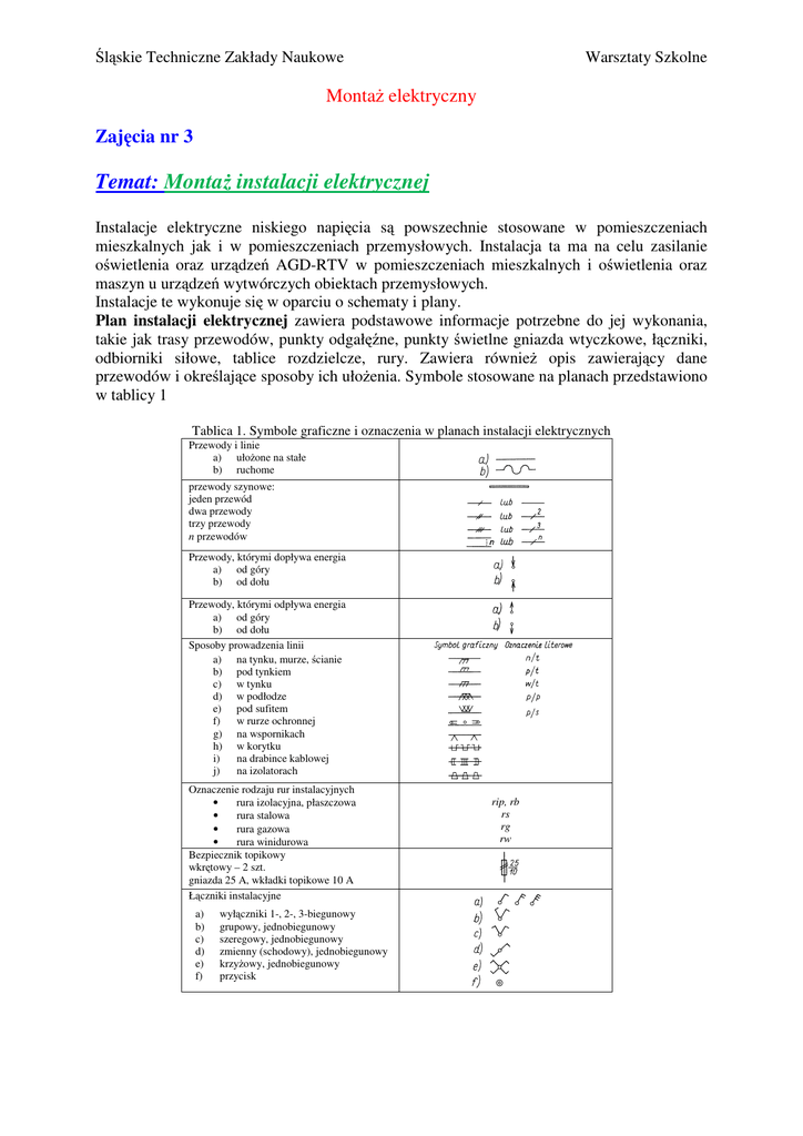 Śląskie Techniczne Zakłady Naukowe Warsztaty Szkolne MontaŜ elektryczny Zajęcia nr 3 Temat: MontaŜ instalacji elektrycznej Instalacje elektryczne niskiego napięcia są powszechnie stosowane w pomieszczeniach mieszkalnych jak i w pomieszczeniach przemysłowych. Instalacja ta ma na celu zasilanie oświetlenia oraz urządzeń AGD-RTV w pomieszczeniach mieszkalnych i oświetlenia oraz maszyn u urządzeń wytwórczych obiektach przemysłowych. Instalacje te wykonuje się w oparciu o schematy i plany. Plan instalacji elektrycznej zawiera podstawowe informacje potrzebne do jej wykonania, takie jak trasy przewodów, punkty odgałęźne, punkty świetlne gniazda wtyczkowe, łączniki, odbiorniki siłowe, tablice rozdzielcze, rury. Zawiera równieŜ opis zawierający dane przewodów i określające sposoby ich ułoŜenia. Symbole stosowane na planach przedstawiono w tablicy 1 Tablica 1. Symbole graficzne i oznaczenia w planach instalacji elektrycznych Przewody i linie a) ułoŜone na stałe b) ruchome przewody szynowe: jeden przewód dwa przewody trzy przewody n przewodów Przewody, którymi dopływa energia a) od góry b) od dołu Przewody, którymi odpływa energia a) od góry b) od dołu Sposoby prowadzenia linii a) na tynku, murze, ścianie b) pod tynkiem c) w tynku d) w podłodze e) pod sufitem f) w rurze ochronnej g) na wspornikach h) w korytku i) na drabince kablowej j) na izolatorach Oznaczenie rodzaju rur instalacyjnych • rura izolacyjna, płaszczowa • rura stalowa • rura gazowa • rura winidurowa Bezpiecznik topikowy wkrętowy – 2 szt. gniazda 25 A, wkładki topikowe 10 A Łączniki instalacyjne a) b) c) d) e) f) wyłączniki 1-, 2-, 3-biegunowy grupowy, jednobiegunowy szeregowy, jednobiegunowy zmienny (schodowy), jednobiegunowy krzyŜowy, jednobiegunowy przycisk rip, rb rs rg rw Śląskie Techniczne Zakłady Naukowe Warsztaty Szkolne MontaŜ elektryczny Gniazdo wtyczkowe a) dwubiegunowe b) trójbiegunowe c) ze stykiem ochronnym d) dwubiegunowe podwójne Wtyczka a) dwubiegunowa b) dwubiegunowa ze stykiem ochronnym c) n-biegunowa Punkt świetlny z Ŝarówką: a) symbol ogólny – Ŝarówka 60W b) w obwodzie światła specjalnego, np. zapasowego c) w obwodzie światła bezpieczeństwa d) w obwodzie światła ewakuacyjnego e) z reflektorem Punkt świetlny z lampą fluorescencyjną (świetlówką) Punkt świetlny z lampą wyładowczą rtęciową Zaciski, puszka odgałęźna Skrzynka przyłączowa Grzejnik elektryczny Tablica rozdzielcza we wnęce o wymiarach axbxc Rozdzielnica skrzynkowa, szafa rozdzielcza Wyłącznik samoczynny niskiego napięcia Licznik kW·h Schemat instalacji elektrycznej podaje sposób połączeń i zabezpieczenia poszczególnych obwodów występujących w instalacji najczęściej stosuje się schematy jednoliniowe. Instalacja elektryczna w pomieszczeniach nie powinna kolidować z innymi rodzajami instalacji, jak np. centralnego ogrzewania, wodną, gazową, kanalizacyjną, kominową. Instalacja elektryczna powinna być oddalona o min. 0,6m od tego typu instalacji. Ze względu na moŜliwość przegrzania nie powinna być prowadzona w pobliŜu pieców, kominów i centralnego ogrzewania. Co najmniej jeden wyłącznik oświetlenia powinien znajdować się przy drzwiach. Przewody prowadzi się po liniach prostych, równolegle do krawędzi ścian i stropów. Rys. A.1. Wskazówki do rozmieszczenia instalacji elektrycznej Śląskie Techniczne Zakłady Naukowe Warsztaty Szkolne MontaŜ elektryczny Rys. A.2. Plan instalacji elektrycznej na parterze domu jednorodzinnego Rys. A.3. Schemat instalacji w budynku mieszkalnym Instalacja moŜe być prowadzona na wiele sposobów. W pomieszczeniach mieszkalnych, handlowych i biurowych ze względów estetycznych staramy się ją ukryć. W pomieszczeniach przemysłowych jest prowadzona tak, Ŝeby zapewnić maksymalną funkcjonalność i być dostępną do naprawy lub modernizacji. RozróŜniamy następujące sposoby prowadzenia instalacji: • pod tynkiem, • na wspornikach, • w tynku, • na drabinkach kablowych, • na tynku, • na izolatorach, • w rurze ochronnej, • w korytkach. Śląskie Techniczne Zakłady Naukowe MontaŜ elektryczny Rys. A.4. Mocowanie rur stalowych Rys. A.5. Sprzęt do mocowania przewodów kabelkowych Rys. A.6. Mocowanie rur winidurowych w uchwytach spręŜystych Warsztaty Szkolne Śląskie Techniczne Zakłady Naukowe MontaŜ elektryczny Warsztaty Szkolne Śląskie Techniczne Zakłady Naukowe Warsztaty Szkolne MontaŜ elektryczny Rys. A.7. Sposoby mocowania rur pod tynkiem Rys. A.8. Zakończenie rury płaszczowej Rys. A.9. Mocowanie przewodów wtynkowych gwoździami Rys. A.10. Instalacje elektryczne w korytkach (listwach) Rys. A.11. Rozmieszczenie uchwytów do mocowania przewodów kabelkowych: a=8÷10 cm, b=30 cm c=60 cm Śląskie Techniczne Zakłady Naukowe Warsztaty Szkolne MontaŜ elektryczny Materiały dydaktyczne wyłącznie do uŜytku uczniów klas elektrycznych i elektronicznych Śląskich Technicznych Zakładów Naukowych w Katowicach. Niniejsze materiały stanowią ilustrację do wprowadzeń teoretycznych przeprowadzonych na warsztatach szkolnych według podręcznika podanego w literaturze. Zamieszczone ilustracje są chronione prawami autorskimi autorów podręcznika. Literatura: E.Musiał „Instalacje i urządzenia elektroenergetyczne” WSiP Warszawa 1998 G.Bartodziej, E.KałuŜa „Aparaty i urządzenia elektryczne” WSiP Warszawa 1997