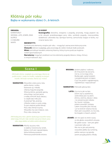 przedstawienie Kłótnia pór roku Bajka w wykonaniu dzieci 5-, 6-letnich OBSADA: NARRATORZY WIOSNA, LATO, JESIEŃ, ZIMA SŁOŃCE 3 CHMURKI WIATR REKWIZYTY: III SCENY Scenografia: dowolna, związana z pogodą, przyrodą, mogą pojawić się w tle obrazki przedstawiające pory roku, symbole pogody, niszczycielską działalność człowieka (np. dymiące kominy, samochody stojące w korku, wycinanie lasów itd.). Symboliczne elementy strojów pór roku – mogą być zaznaczone kolorystycznie. Chmurki dobrze wyglądają, gdy przytulają do siebie nieduże białe poduszki. Wiatr potrzebuje kawałek zwiewnej tkaniny, którą trzyma podczas krążenia wokół zgromadzonych. Narratorzy mogą być przebrani za inne elementy pogody (deszcz, śnieg, chmury w innych kolorach, itp.). Scena I (Wchodzi słońce, rozgląda się, przeciąga, kłania się publiczności i siada na środku, najlepiej na dużym krześle. Wchodzi narrator, kłania się i mówi) NARRATOR:Wszystkie cztery pory roku pełne dumy i uroku, kolorowe są i młode, własną mają też pogodę. Wiosną słońce, gwiazdy gasną, zimą śnieg i już jest jasno, z małej chmurki duży deszcz, w ciepłe lato miło jest. A jesienią? Tak, jesienią chłodne wiatry w polu wieją. To jest właśnie polski klimat. Pory roku klimat trzyma. Wszystko ma swe miejsce, czas. Pory roku cieszą nas. (Wchodzą pory roku i głośno dyskutują wszystkie naraz, obok stoją chmurki. Gdy narrator zaczyna mówić, pory roku stają daleko od siebie wielce obrażone) NARRATOR: K łóciły się pory roku w piękny noworoczny ranek, która z nich jest najważniejsza, która królową zostanie. Pierwsza przemówiła wiosna: WIOSNA:Jestem piękna i radosna, Ze mną życie się zaczyna, nie to, co ta sroga zima. Budzę pąki, sypię kwiatem i przyjemniej jest niż latem Czyż nie jestem najpiękniejsza, najzieleńsza i najszczersza? NARRATOR:Pokiwało głową lato: LATO:A ja na to jak na lato. Zanim się tu zazielenisz, wiele błota jest na ziemi. Zimno, ciemno, deszcz i słota – to wiosenna jest robota. Są i burze i roztopy, potem powódź i potopy. Latem wszystko jest inaczej – ja na świecie więcej znaczę. Dam jeść wszystkim, to ma rola, bo bogato w lasach, polach. JESIEŃ:Jak nie upał, to znów susza, co do głodu wszystkich zmusza. Bo gdzie susza – tam jest głód i pomoże tylko cud. Nie ma to jak sad jesienią: wszystkie jabłka się rumienią, pełne warzyw są ogrody, zanim przyjdą późne chłody. przedstawienie ZIMA:Jakie to są twoje chłody – dużo błota, dużo wody. Brudno robi się, ponuro – brzydkie niebo z ciemną chmurą. No a zimą czysto, jasno, ziemia ma kołderkę własną. Śpią roślinki i zwierzęta, jest wesoło, idą święta. WIOSNA:Zima – pora doskonała? Lodem skuta ziemia cała. Twardo, zimno, zawierucha, nie wychodzić bez kożucha. Wiosną można zdjąć czapeczkę i zamienić na chusteczkę. 3 CHMURKA:A co człowiek ma do tego, że w pogodzie dużo złego? Jak człowiek postąpić może, żeby już nie było gorzej? NARRATOR:I tak długo kłótnia trwała. Każda pora rację miała. WIATR:Szszszszszsz! Co za czasy, wycinają ludzie lasy! Gdzie ja teraz się podzieję? Nie powieję – oszaleję. I w tornado się zawinę i popsuję coś lub zginę. (Słońce łapie wiatr za ramię) (Pory roku siadają tyłem do siebie) SŁOŃCE:Cicho, wietrze! Plany snuję, kto dziś ciebie potrzebuje?... Błyskawiczny pomysł taki: tam na polu są wiatraki, zatańcz z nimi, niech się kręcą, dużo prądu zaoszczędzą. WIATR:Lecę, pędzę tam na pole, zamiast jęczeć, pomóc wolę! Scena II NARRATOR:Tej kłótni się przyglądały dwie malutkie chmurki białe. Na niebie się zatrzymały, z kłótni nic nie zrozumiały. SŁOŃCE:Wszystkim ludziom dobrze znany straszny efekt cieplarniany. No a to się wzięło stąd, że nieoszczędzany prąd. Ludzie mogą porom pomóc, a nie prąd marnować w domu. (Chmurki mogą stać z boku, blisko przodu sceny) 1 CHMURKA:Taki dzisiaj piękny dzionek. O co kłócą się, szalone? Każda pora jest wspaniała, czemu nie chcą wspólnie działać? 2 CHMURKA:Każda pora roku płynie i ze swych zwiastunów słynie: wiosna ze snu ziemię budzi, lato w mig opala ludzi, a jesień liście maluje, zima śnieżką w nas celuje. (Słońce wstaje z krzesła) 10 SŁOŃCE:Macie rację, moje panie. Lepiej niech już tak zostanie. Choć bywają zagadkowe złe warunki pogodowe, to najbardziej ja się wściekam na działalność złą człowieka. (Odlatuje robiąc okrążenie wokół zgromadzonych) 1 CHMURKA:Takich ludzi nam potrzeba, bo na ziemi działać trzeba: uspokoić roku pory i złagodzić wszystkie spory. 2 CHMURKA:Żeby ludzie na rowerze, albo pieszo, mówiąc szczerze, mogą dla zdrowia żaglówką, a nie wciąż tylko taksówką. 3 CHMURKA:Błyskawicznie działać trzeba, by nie było dymu z nieba, a deszcze czyste padały, zdrową wodę dostarczały. (Wszyscy wzajemnie podają sobie ręce – jak do powitania. Potem siadają w jednym kole, razem z nimi pory roku) przedstawienie Scena III (epilog) (Jak poprzednio. Wchodzi narrator) NARRATOR:Wiecie, co się stało dalej? Wszyscy ciężko pracowali i uczyli ludzi co dzień, by z klimatem żyli w zgodzie. Piosenka „Słoneczko, uśmiechnij się” muz. K. Gaertner, sł. A. Bernat (W tym momencie aktorzy mogą widzom rozdawać obrazki, np. kolorowanki ekologiczne. Mogą też z tym zaczekać do końca inscenizacji, żeby nie odwrócić obrazkami uwagi dzieci od tego, co przedstawiają) NARRATOR:Wszystko do normy wróciło. I dobrze się zakończyło. Na jakiś czas, daję słowo, każda pora jest królową. SŁOŃCE:Ziemia naszym domem jest czy w pogodę, czy też w deszcz. Bądź dziś królem – dbaj o klimat. Klimat nas przy życiu trzyma. Pomagajmy póki czas, by był zdrowy każdy z nas. Słoneczko śpiewa na cały głos, Choćbyś miał bracie kłopotów sto, Słoneczko z góry uśmiecha się, Słoneczko woła przez cały dzień. Refren: Uś