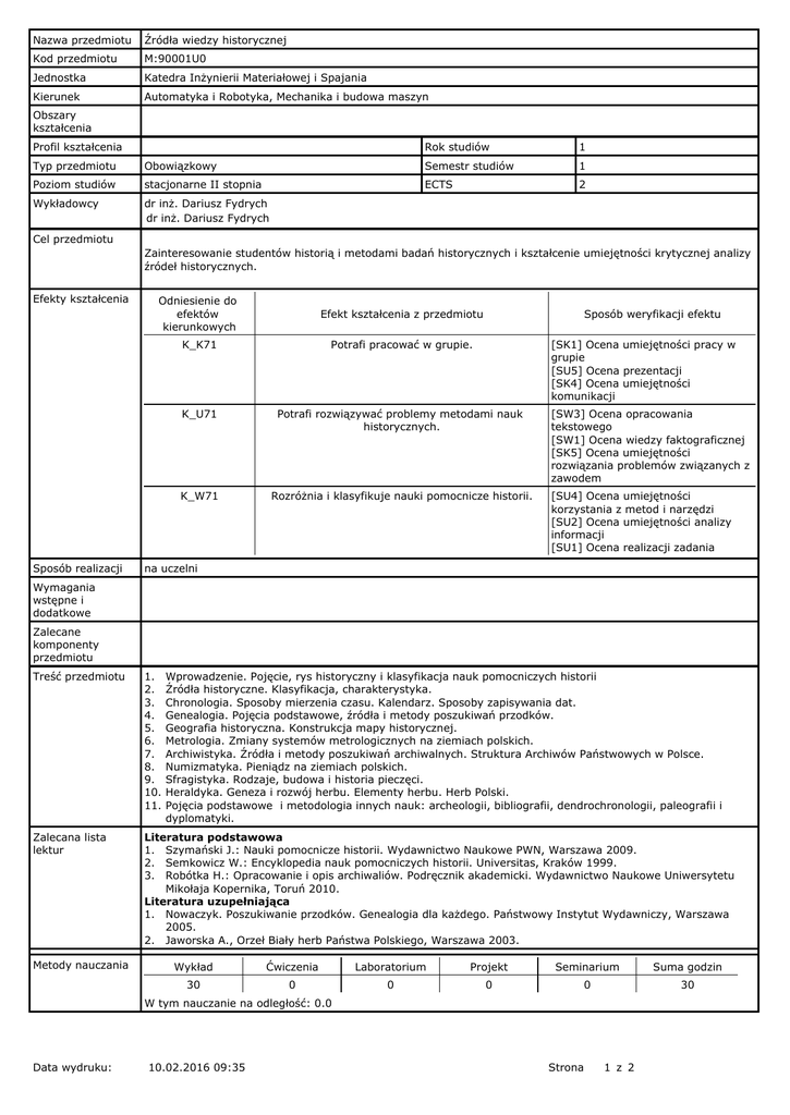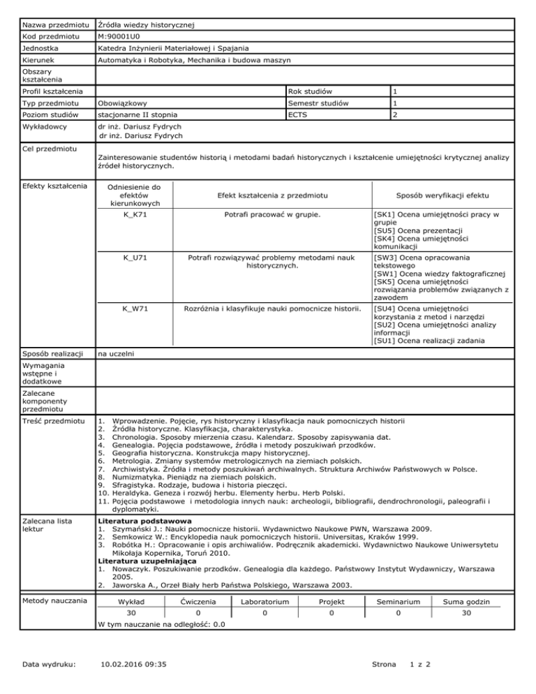 Nazwa przedmiotu Źródła wiedzy historycznej Kod przedmiotu M:90001U0 Jednostka Katedra Inżynierii Materiałowej i Spajania Kierunek Automatyka i Robotyka, Mechanika i budowa maszyn Obszary kształcenia Profil kształcenia Rok studiów 1 Typ przedmiotu Obowiązkowy Semestr studiów 1 Poziom studiów stacjonarne II stopnia ECTS 2 Wykładowcy dr inż. Dariusz Fydrych dr inż. Dariusz Fydrych Cel przedmiotu Zainteresowanie studentów historią i metodami badań historycznych i kształcenie umiejętności krytycznej analizy źródeł historycznych. Efekty kształcenia Sposób realizacji Odniesienie do efektów kierunkowych Efekt kształcenia z przedmiotu K_K71 Potrafi pracować w grupie. K_U71 Potrafi rozwiązywać problemy metodami nauk historycznych. K_W71 Rozróżnia i klasyfikuje nauki pomocnicze historii. Sposób weryfikacji efektu [SK1] Ocena umiejętności pracy w grupie [SU5] Ocena prezentacji [SK4] Ocena umiejętności komunikacji [SW3] Ocena opracowania tekstowego [SW1] Ocena wiedzy faktograficznej [SK5] Ocena umiejętności rozwiązania problemów związanych z zawodem [SU4] Ocena umiejętności korzystania z metod i narzędzi [SU2] Ocena umiejętności analizy informacji [SU1] Ocena realizacji zadania na uczelni Wymagania wstępne i dodatkowe Zalecane komponenty przedmiotu Treść przedmiotu 1. 2. 3. 4. 5. 6. 7. 8. 9. 10. 11. Zalecana lista lektur Literatura podstawowa 1. Szymański J.: Nauki pomocnicze historii. Wydawnictwo Naukowe PWN, Warszawa 2009. 2. Semkowicz W.: Encyklopedia nauk pomocniczych historii. Universitas, Kraków 1999. 3. Robótka H.: Opracowanie i opis archiwaliów. Podręcznik akademicki. Wydawnictwo Naukowe Uniwersytetu Mikołaja Kopernika, Toruń 2010. Literatura uzupełniająca 1. Nowaczyk. Poszukiwanie przodków. Genealogia dla każdego. Państwowy Instytut Wydawniczy, Warszawa 2005. 2. Jaworska A., Orzeł Biały herb Państwa Polskiego, Warszawa 2003. Metody nauczania Wprowadzenie. Pojęcie, rys historyczny i klasyfikacja nauk pomocniczych historii Źródła historyczne. Klasyfikacja, charakterystyka. Chronologia. Sposoby mierzenia czasu. Kalendarz. Sposoby zapisywania dat. Genealogia. Pojęcia podstawowe, źródła i metody poszukiwań przodków. Geografia historyczna. Konstrukcja mapy historycznej. Metrologia. Zmiany systemów metrologicznych na ziemiach polskich. Archiwistyka. Źródła i metody poszukiwań archiwalnych. Struktura Archiwów Państwowych w Polsce. Numizmatyka. Pieniądz na ziemiach polskich. Sfragistyka. Rodzaje, budowa i historia pieczęci. Heraldyka. Geneza i rozwój herbu. Elementy herbu. Herb Polski. Pojęcia podstawowe i metodologia innych nauk: archeologii, bibliografii, dendrochronologii, paleografii i dyplomatyki. Wykład Ćwiczenia Laboratorium Projekt Seminarium Suma godzin 30 0 0 0 0 30 W tym nauczanie na odległość: 0.0 Data wydruku: 10.02.2016 09:35 Strona 1 z 2 Metody i kryteria oceniania Kryteria oceniania: składowe kollokwium Próg zaliczeniowy Procent oceny końcowej 56.0 100.0 Przykładowe zagadnienia / przykładowe pytania / realizowane zadania Klasyfikacja i charakterystyka nauk pomocnicznych historii. Podstawowe pojęcia, źródła i metody poszukiwań przodków. Źródła i metody poszukiwań archiwalnych. Geneza i rozwój herbu. Język wykładowy polski Praktyki zawodowe Nie dotyczy Data wydruku: 10.02.2016 09:35 Strona 2 z 2