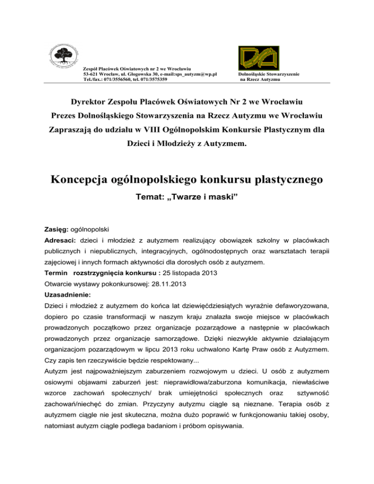 Zespół Placówek Oświatowych nr 2 we Wrocławiu 53-621 Wrocław, ul. Głogowska 30, e-mail:[email protected] Tel./fax.: 071/3556560, tel. 071/3575359 Dolnośląskie Stowarzyszenie na Rzecz Autyzmu Dyrektor Zespołu Placówek Oświatowych Nr 2 we Wrocławiu Prezes Dolnośląskiego Stowarzyszenia na Rzecz Autyzmu we Wrocławiu Zapraszają do udziału w VIII Ogólnopolskim Konkursie Plastycznym dla Dzieci i Młodzieży z Autyzmem. Koncepcja ogólnopolskiego konkursu plastycznego Temat: „Twarze i maski” Zasięg: ogólnopolski Adresaci: dzieci i młodzież z autyzmem realizujący obowiązek szkolny w placówkach publicznych i niepublicznych, integracyjnych, ogólnodostępnych oraz warsztatach terapii zajęciowej i innych formach aktywności dla dorosłych osób z autyzmem. Termin rozstrzygnięcia konkursu : 25 listopada 2013 Otwarcie wystawy pokonkursowej: 28.11.2013 Uzasadnienie: Dzieci i młodzież z autyzmem do końca lat dziewięćdziesiątych wyraźnie defaworyzowana, dopiero po czasie transformacji w naszym kraju znalazła swoje miejsce w placówkach prowadzonych początkowo przez organizacje pozarządowe a następnie w placówkach prowadzonych przez organizacje samorządowe. Dzięki niezwykle aktywnie działającym organizacjom pozarządowym w lipcu 2013 roku uchwalono Kartę Praw osób z Autyzmem. Czy zapis ten rzeczywiście będzie respektowany... Autyzm jest najpoważniejszym zaburzeniem rozwojowym u dzieci. U osób z autyzmem osiowymi objawami zaburzeń jest: nieprawidłowa/zaburzona komunikacja, niewłaściwe wzorce zachowań społecznych/ brak umiejętności społecznych oraz sztywność zachowań/niechęć do zmian. Przyczyny autyzmu ciągle są nieznane. Terapia osób z autyzmem ciągle nie jest skuteczna, można dużo poprawić w funkcjonowaniu takiej osoby, natomiast autyzm ciągle podlega badaniom i próbom opisywania. U osób z autyzmem obserwuje się zdolności parcjalne („wysepkowe”) w różnym zakresie: muzycznym , matematycznym a także plastycznym. Rozwijanie zdolności parcjalnych ma kapitalne znaczenie w terapii autyzmu. Przede wszystkim pozwala na rozwój poczucia własnej wartości. Terapia przez sztukę (arteterapia) jest źródłem osiągania przez osoby z autyzmem poczucia własnej tożsamości, autonomii, poczucia sprawstwa, radości z tworzenia. Organizowane do tej pory przez naszą placówkę wystawy prac plastycznych cieszyły się ogromnym zainteresowaniem społeczności lokalnych (wystawy co roku w Centrum Kultury Wrocław – Zachód, w Dolnośląskiej Bibliotece Pedagogicznej oraz Centrum Edukacji Kulturalnej Dzieci i Młodzieży we Wrocławiu). Tegoroczne prace zakwalifikowane do wystawy zostaną przede wszystkim pokazane w galerii Dolnośląskiego Kuratorium Oświaty przy pl. Powstańców Warszawy 1/3/5. Będą też okazją do nagłośnienia problemów dzieci z autyzmem oraz nauki tolerancji i rozumienia potrzeb środowiska z nimi związanego. Rada Pedagogiczna pozytywnie zaopiniowała pomysł organizacji ogólnopolskich konkursów plastycznych dla osób z autyzmem. Do udziału w konkursie zapraszamy autystycznych uczniów, wychowanków i podopiecznych wszystkich placówek ogólnodostępnych, kształcenia specjalnego oraz placówek integracyjnych, ogólnodostępnych oraz prowadzonych przez organizacje pozarządowe. W tym roku konkurs obejmuje temat: „Twarze i maski ”. „Nie ma bodaj bardziej oczywistych znaków, w sposób bezpośredni określających konkretną osobę i wyrażających jej odrębność, niż twarz. Nie bez przyczyny znane z historii, nigdy w stu procentach nie zadowalające, poszukiwania sobowtórów, skupiały się przede wszystkim na wyglądzie przedniej części głowy. Nie sposób znaleźć dwa identyczne pod tym względem osoby ludzkie. Ze smutkiem stwierdzić trzeba, że w tzw. cywilizowanym świecie coraz mniej uwagi przywiązujemy do otaczających nas twarzy i emanujących z nich treści. Tłumaczy się to zwykle – można wątpić czy aby rzeczywiście zgodnie z prawdą – brakiem czasu, coraz większym balastem otaczających nas spraw… Z zupełnie odmiennych, obiektywnych przyczyn wynikających z zaburzenia jest brak zainteresowania twarzą jako znakiem opisującym konkretną osobę. Brak umiejętności odczytywania „wypisanych” na niej komunikatów i treści emocjonalnych, cechuje również osoby autystyczne. Właśnie dlatego warto i należy kierować ich uwagę (ale także uwagę tzw. zdrowych ludzi) na twarz, jako nośnik indywidualnych cech i informacji. Pierwsze kroki w tym kierunku powinny być niewątpliwie proste i zachęcające do dalszych obserwacji. Nie bez przyczyny w nauczaniu teorii umysłu uśmiechnięte i smutne „buźki” są punktem wyjścia dla kształtowania umiejętności odczytywania i nazywania emocji. „Buźka” symbolizuje realną twarz, jak ujęty w siatkę stylizacji liść klonu na fladze kanadyjskiej - odpowiada milionom prawdziwych liści, z których każdy jest inny. Buźka wykorzystywana w rozwijaniu teorii umysłu jest więc w pełnym tego słowa znaczeniu maską. Wbrew potocznym opiniom zadaniem maski, wykorzystywanej od czasów pradawnych w celach rytualnych, nie jest skrywanie emocji (może z wyjątkiem tremy aktora grającego w sztuce teatralnej), ale ich uzewnętrznienie w połączeniu z ekspresją całego ciała. Działania twórcze podejmowane przez uczestników VIII Ogólnopolskiego Konkursu Plastycznego dla Dzieci i Młodzieży z Autyzmem mają zwrócić ich uwagę poprzez maskę na twarz, zaś poprzez twarz - na człowieka oraz stworzyć okazję do wyrażenia własnych emocji.” Sylwia A. Białek Kategorie prac plastycznych: 1. akwarela, pastele, olej itp. techniki malarskie 2. grafika i rysunek 3. ceramika 4. szkło 5. tkanina 6. rzeźba 7. techniki mieszane 8. materiały ekologiczne Patronat Honorowy: 1. Ministerstwo Kultury i Dziedzictwa Narodowego 2. Dolnośląski Kurator Oświaty 3. Dyrektor Wydziału Edukacji Urzędu Miejskiego Wrocławia Do jury zo