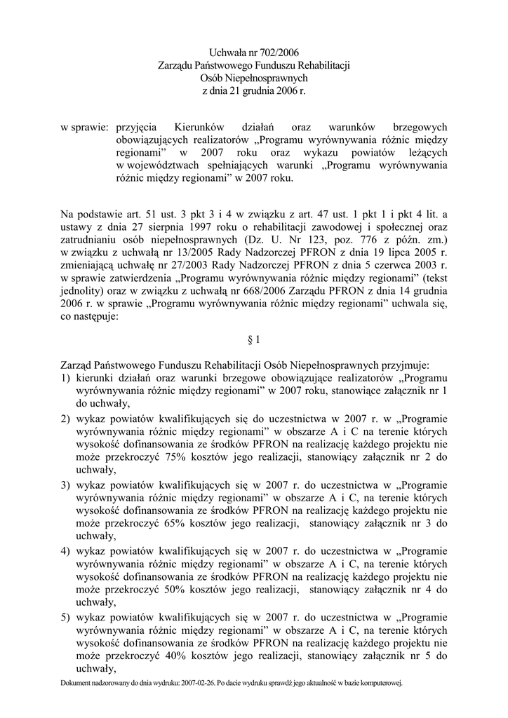 Uchwała nr 702/2006 Zarządu Państwowego Funduszu Rehabilitacji Osób Niepełnosprawnych z dnia 21 grudnia 2006 r. w sprawie: przyjęcia Kierunków działań oraz warunków brzegowych obowiązujących realizatorów „Programu wyrównywania róŜnic między regionami” w 2007 roku oraz wykazu powiatów leŜących w województwach spełniających warunki „Programu wyrównywania róŜnic między regionami” w 2007 roku. Na podstawie art. 51 ust. 3 pkt 3 i 4 w związku z art. 47 ust. 1 pkt 1 i pkt 4 lit. a ustawy z dnia 27 sierpnia 1997 roku o rehabilitacji zawodowej i społecznej oraz zatrudnianiu osób niepełnosprawnych (Dz. U. Nr 123, poz. 776 z późn. zm.) w związku z uchwałą nr 13/2005 Rady Nadzorczej PFRON z dnia 19 lipca 2005 r. zmieniającą uchwałę nr 27/2003 Rady Nadzorczej PFRON z dnia 5 czerwca 2003 r. w sprawie zatwierdzenia „Programu wyrównywania róŜnic między regionami” (tekst jednolity) oraz w związku z uchwałą nr 668/2006 Zarządu PFRON z dnia 14 grudnia 2006 r. w sprawie „Programu wyrównywania róŜnic między regionami” uchwala się, co następuje: §1 Zarząd Państwowego Funduszu Rehabilitacji Osób Niepełnosprawnych przyjmuje: 1) kierunki działań oraz warunki brzegowe obowiązujące realizatorów „Programu wyrównywania róŜnic między regionami” w 2007 roku, stanowiące załącznik nr 1 do uchwały, 2) wykaz powiatów kwalifikujących się do uczestnictwa w 2007 r. w „Programie wyrównywania róŜnic między regionami” w obszarze A i C na terenie których wysokość dofinansowania ze środków PFRON na realizację kaŜdego projektu nie moŜe przekroczyć 75% kosztów jego realizacji, stanowiący załącznik nr 2 do uchwały, 3) wykaz powiatów kwalifikujących się w 2007 r. do uczestnictwa w „Programie wyrównywania róŜnic między regionami” w obszarze A i C, na terenie których wysokość dofinansowania ze środków PFRON na realizację kaŜdego projektu nie moŜe przekroczyć 65% kosztów jego realizacji, stanowiący załącznik nr 3 do uchwały, 4) wykaz powiatów kwalifikujących się w 2007 r. do uczestnictwa w „Programie wyrównywania róŜnic między regionami” w obszarze A i C, na terenie których wysokość dofinansowania ze środków PFRON na realizację kaŜdego projektu nie moŜe przekroczyć 50% kosztów jego realizacji, stanowiący załącznik nr 4 do uchwały, 5) wykaz powiatów kwalifikujących się w 2007 r. do uczestnictwa w „Programie wyrównywania róŜnic między regionami” w obszarze A i C, na terenie których wysokość dofinansowania ze środków PFRON na realizację kaŜdego projektu nie moŜe przekroczyć 40% kosztów jego realizacji, stanowiący załącznik nr 5 do uchwały, Dokument nadzorowany do dnia wydruku: 2007-02-26. Po dacie wydruku sprawdź jego aktualność w bazie komputerowej. 2 6) wykaz powiatów kwalifikujących się w 2007 r. do uczestnictwa w „Programie wyrównywania róŜnic między regionami” w obszarze A i C, na terenie których wysokość dofinansowania ze środków PFRON na realizację kaŜdego projektu nie moŜe przekroczyć 30% kosztów jego realizacji, stanowiący załącznik nr 6 do uchwały. §2 Uchwała wchodzi w Ŝycie z dniem podjęcia z mocą obowiązującą od daty zatwierdzenia przez Radę Nadzorczą PFRON zmian do programu zaproponowanych w uchwale nr 668/2006 Zarządu Państwowego Funduszu Rehabilitacji Osób Niepełnosprawnych z dnia 14 grudnia 2006 r. w sprawie „Programu wyrównywania róŜnic między regionami”. Dokument nadzorowany do dnia wydruku: 2007-02-26. Po dacie wydruku sprawdź jego aktualność w bazie komputerowej.