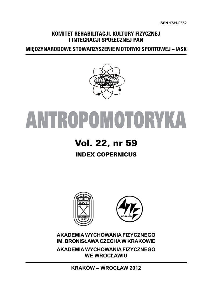ISSN 1731-0652 KOMITET REHABILITACJI, KULTURY FIZYCZNEJ I INTEGRACJI SPOŁECZNEJ PAN MIĘDZYNARODOWE STOWARZYSZENIE MOTORYKI SPORTOWEJ – IASK ANTROPOMOTORYKA Vol. 22, nr 59 INDEX COPERNICUS AKADEMIA WYCHOWANIA FIZYCZNEGO IM. BRONISŁAWA CZECHA W KRAKOWIE AKADEMIA WYCHOWANIA FIZYCZNEGO WE WROCŁAWIU KRAKÓW – WROCŁAW 2012 ISSN 1731-0652 COMMITTEE FOR REHABILITATION, PHYSICAL EDUCATION AND SOCIAL INTEGRATION OF POLISH ACADEMY OF SCIENCES INTERNATIONAL ASSOCIATION OF SPORT KINETICS – IASK ANTROPOMOTORYKA Vol. 22, nr 59 INDEX COPERNICUS UNIVERSITY SCHOOL OF PHYSICAL EDUCATION CRACOW, POLAND UNIVERSITY SCHOOL OF PHYSICAL EDUCATION IN WROCLAW, POLAND CRACOW – WROCLAW 2012 ANTROPOMOTORYK A ISSN 1731-0652 KOMITET REHABILITACJI, KULTURY FIZYCZNEJ I INTEGRACJI SPOŁECZNEJ PAN MIĘDZYNARODOWE STOWARZYSZENIE MOTORYKI SPORTOWEJ – IASK AKADEMIA WYCHOWANIA FIZYCZNEGO IM. BRONISŁAWA CZECHA W KRAKOWIE AKADEMIA WYCHOWANIA FIZYCZNEGO WE WROCŁAWIU VOL. 22, NR 59 KRAKÓW – WROCŁAW 2012 REDAKCJA Redaktor Naczelny Edward Mleczko Z-ca Redaktora Naczelnego Zofia Ignasiak Komitet Redakcyjny Jan Chmura, Jerzy Januszewski, Andrzej Klimek, Tadeusz Koszczyc, Lesław Kulmatycki, Wiesław Osiński, Joachim Raczek, Teresa Sławińska-Ochla, Włodzimierz Starosta RADA REDAKCYJNA Michal Belej (Słowacja), Peter Blaser (Niemcy), Tadeusz Bober, Janusz Czerwiński, Sławomir Drozdowski, Józef Drabik, Joanna Gradek, Peter Hirtz (Niemcy), Josif Moisiejewicz Fejgenberg (Izrael), Adam Haleczko, Andrzej Jopkiewicz, Han C.G. Kemper (Holandia), Krzysztof Klukowski, Vladimir Lyakh (Rosja), Robert M. Malina (USA), Wacław Petryński, Ryszard Przewęda, Igor Ryguła, Stanisław Sterkowicz, Stanisław Żak ADRES REDAKCJI al. Jana Pawła II 78, 31-571 Kraków Poland Czasopismo ANTROPOMOTORYKA jest umieszczone na liście rankingowej INDEX COPERNICUS Publikacja częściowo dotowana przez Ministerstwo Nauki i Szkolnictwa Wyższego Adiustacja i korekta: Barbara Przybyło © Copyright by University School of Physical Education in Cracow Opracowanie graficzne i łamanie: Dział Projektów Wydawniczych AWF Kraków Druk: ArtProm, 31-431 Kraków, ul. Dukatów 29 Nakład: 150 egz. ANTROPOMOTORYK A ISSN 1731-0652 COMMITTEE FOR REHABILITATION, PHYSICAL EDUCATION AND SOCIAL INTEGRATION OF POLISH ACADEMY OF SCIENCES INTERNATIONAL ASSOCIATION OF SPORT KINETICS – IASK UNIVERSITY SCHOOL OF PHYSICAL EDUCATION, CRACOW, POLAND UNIVERSITY SCHOOL OF PHYSICAL EDUCATION IN WROCLAW, POLAND VOL. 22, NR 59 CRACOW – WROCLAW 2012 EDITORIAL COMMITTEE CHAIRMAN Edward Mleczko VICE-CHAIRMAN Zofia Ignasiak MEMBERS Jan Chmura, Jerzy Januszewski, Andrzej Klimek, Tadeusz Koszczyc, Lesław Kulmatycki, Wiesław Osiński, Joachim Raczek, Teresa Sławińska-Ochla, Włodzimierz Starosta EDITORIAL BOARD Michal Belej (Slovakia), Peter Blaser (Germany), Tadeusz Bober, Janusz Czerwiński, Sławomir Drozdowski, Józef Drabik, Joanna Gradek, Peter Hirtz (Germany), Josif Moisiejewicz Fejgenberg (Israel), Adam Haleczko, Andrzej Jopkiewicz, Han C.G. Kemper (Holland), Krzysztof Klukowski, Vladimir Lyakh (Russia), Robert M. Malina (USA), Wacław Petryński, Ryszard Przewęda, Igor Ryguła, Stanisław Sterkowicz, Stanisław Żak EDITOR’S OFFICE al. Jana Pawła II 78, 31-571 Kraków Poland Indexed in INDEX COPERNICUS This publication is funded in part by the Ministry of Science and Higher Education Linguistic proofreading: Barbara Przybyło © Copyright by University School of Physical Education, Cracow, Poland Design and DTP: University School of Physical Education, Cracow, Poland Print: ArtProm, 31-431 Kraków, ul. Dukatów 29 Circulation: 150 NR 59 ANT ROP OM OT OR YK A 2012 SPIS TREŚCI Od Redakcji: „Antropomotoryka-Kinesiology” w drugiej połowie 2012 roku jeszcze po polsku 7 Informacje dla autorów 11 PRACE ORYGINALNE Monika Piątkowska Wiek jako czynnik różnicujący poziom aktywności fizycznej polskiej populacji 17 Joanna Gradek, Edward Mleczko, Józef Bergier, Wacław Mirek, Konrad Rembiasz, Agnieszka Płatek Trening biegowy kobiet i mężczyzn po 25. roku życia a wskaźniki sprawności fizycznej badanej w konwencji zdrowia (H-RF) 31 Kamil Sławecki Aktywność fizyczna mężczyzn oceniana za pomocą Międzynarodowego Kwestionariusza Aktywności Fizycznej IPAQ – Wersja Długa 57 Stanisław Gołąb, Agnieszka Woronkowicz, Jan Sobiecki Ocena przydatności metod określania otłuszczenia ciała u mężczyzn w świetle relacji ze sprawnością i wydolnością fizyczną 67 Ewa Ziółkowska-Łajp, Anna Demuth, Marek Drozdowski, Urszula Czerniak, Magdalena Krzykała Ocena dymorfizmu płciowego cech somatycznych i składu ciała młodzieży trenującej sporty wodne 79 Przemysław Bujas, Dariusz Tchórzewski, Janusz Jaworski Asymetryczność funkcji podporowej i stabilizującej kończyn dolnych u narciarzy zjazdowców 91 Władysław Machnacz , Jarosław Nosal, Andrzej Dudkowski, Paweł Chmura, Andrzej Rokita Związki pomiędzy skutecznością działań młodych piłkarzy podczas gier ,,jeden przeciwko jednemu” a poziomem wybranych koordynacyjnych zdolności motorycznych 99 Henryk Duda Wpływ intelektualnej instrukcji usprawniającej działanie z piłką na skuteczność ruchową gracza 109 PRACE PRZEGLĄDOWE Vladimir Lyakh, Przemysław Bujas, Leszek Gargula Efekty treningowe w przygotowaniu wysoko kwalifikowanych piłkarzy nożnych: przegląd 121 POLEMIKI I DYSKUSJE Emilia Mikołajewska, Dariusz Mikołajewski Nowoczesne rozwiązania techniczne w reedukacji chodu –5– 139 NR 59 ANT ROP OM OT OR YK A 2012 CONTENTS From Editors: “Antropomotoryka-Kinesiology” in the second half of 2012 still in Polish 7 Information for the Authors 13 ORIGINAL PAPERS Monika Piątkowska Age-related changes in physical activity patterns in Poland 17 Joanna Gradek, Edward Mleczko, Józef Bergier, Wacław Mirek, Konrad Rembiasz, Agnieszka Płatek Running training in women and men aged 25 or older and physical fitness factors in accordance with the health-related fitness conce