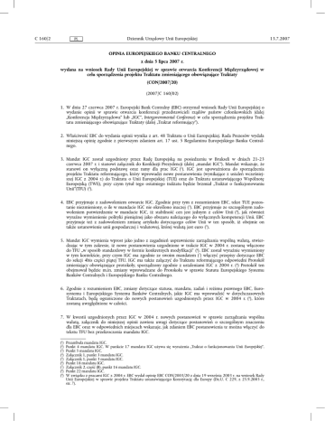 C 160/2 PL Dziennik Urzędowy Unii Europejskiej OPINIA EUROPEJSKIEGO BANKU CENTRALNEGO z dnia 5 lipca 2007 r. wydana na wniosek Rady Unii Europejskiej w sprawie otwarcia Konferencji Międzyrządowej w celu sporządzenia projektu Traktatu zmieniającego obowiązujące Traktaty (CON/2007/20) (2007/C 160/02) 1. W dniu 27 czerwca 2007 r. Europejski Bank Centralny (EBC) otrzymał wniosek Rady Unii Europejskiej o wydanie opinii w sprawie otwarcia konferencji przedstawicieli rządów państw członkowskich (dalej „Konferencja Międzyrządowa” lub „IGC”, Intergovernmental Conference) w celu sporządzenia projektu Traktatu zmieniającego obowiązujące Traktaty (dalej „Traktat reformujący”). 2. Właściwość EBC do wydania opinii wynika z art. 48 Traktatu o Unii Europejskiej. Rada Prezesów wydała niniejszą opinię zgodnie z pierwszym zdaniem art. 17 ust. 5 Regulaminu Europejskiego Banku Centralnego. 3. Mandat IGC został uzgodniony przez Radę Europejską na posiedzeniu w Brukseli w dniach 21-23 czerwca 2007 r. i stanowi załącznik do Konkluzji Prezydencji (dalej „mandat IGC”). Mandat wskazuje, że stanowi on wyłączną podstawę oraz ramy dla prac IGC (1). IGC jest upoważniona do sporządzenia projektu Traktatu reformującego, który wprowadzi nowe postanowienia (wynikające z ustaleń wcześniejszej IGC z 2004 r.) do Traktatu o Unii Europejskiej (TUE) oraz do Traktatu ustanawiającego Wspólnotę Europejską (TWE), przy czym tytuł tego ostatniego traktatu będzie brzmiał „Traktat o funkcjonowaniu Unii”(TFU) (2). 4. EBC przyjmuje z zadowoleniem otwarcie IGC. Zgodnie przy tym z rozumieniem EBC, tekst TUE pozostanie niezmieniony, o ile w mandacie IGC nie określono inaczej ( 3). EBC przyjmuje ze szczególnym zadowoleniem potwierdzenie w mandacie IGC, iż stabilność cen jest jednym z celów Unii (4), jak również wyraźne wymienienie polityki pieniężnej jako obszaru należącego do wyłącznych kompetencji Unii. EBC przyjmuje też z zadowoleniem zmianę artykułu dotyczącego celów Unii w ten sposób, iż obejmie on także ustanowienie unii gospodarczej i walutowej, której walutą jest euro (5). 5. Mandat IGC wymienia wprost jako jedno z zagadnień usprawnienie zarządzania wspólną walutą, stwierdzając w tym zakresie, iż nowe postanowienia uzgodnione w trakcie IGC w 2004 r. zostaną włączone do TFU „w sposób standardowy w formie konkretnych modyfikacji” (6). EBC został wyraźnie wymieniony w tym kontekście, przy czym IGC ma zgodnie ze swoim mandatem ( 7) włączyć przepisy dotyczące EBC do sekcji 4bis części piątej TFU. IGC ma także załączyć do Traktatu reformującego odpowiedni Protokół zmieniający obowiązujące protokoły, sporządzony zgodnie z ustaleniami IGC z 2004 r. ( 8) Protokół ten obejmował będzie m.in. zmiany wprowadzane do Protokołu w sprawie Statutu Europejskiego Systemu Banków Centralnych i Europejskiego Banku Centralnego. 6. Zgodnie z rozumieniem EBC, zmiany dotyczące statusu, mandatu, zadań i reżimu prawnego EBC, Eurosystemu i Europejskiego Systemu Banków Centralnych, jakie IGC ma wprowadzić w dotychczasowych Traktatach, będą ograniczone do nowych postanowień uzgodnionych przez IGC w 2004 r. (9), które zostaną uwzględnione w całości. 7. W kwestii uzgodnionych przez IGC w 2004 r. nowych postanowień w sprawie zarządzania wspólna walutą, załącznik do niniejszej opinii zawiera uwagi dotyczące postanowień o szczególnym znaczeniu dla EBC oraz w odpowiednich miejscach wskazuje, jak zdaniem EBC postanowienia te można włączyć do tekstu TFU bez przekroczenia mandatu IGC. (1) (2) (3) (4) (5) (6) (7) (8) (9) Preambuła mandatu IGC. Punkt 4 mandatu IGC. W punkcie 17 mandatu IGC używa się wyrażenia „Traktat o funkcjonowaniu Unii Europejskiej”. Punkt 5 mandatu IGC. Załącznik 1, punkt 3 mandatu IGC. Załącznik 1, punkt 3 mandatu IGC. Punkt 18 mandatu IGC. Załącznik 2, część (B), punkt 16 mandatu IGC. Punkt 22 mandatu IGC. W związku z pracami IGC z 2004 r. EBC wydał opinię EBC CON/2003/20 z dnia 19 września 2003 r. na wniosek Rady Unii Europejskiej w sprawie projektu Traktatu ustanawiającego Konstytucję dla Europy (Dz.U. C 229, z 25.9.2003 r., str. 7). 13.7.2007 13.7.2007 PL Dziennik Urzędowy Unii Europejskiej C 160/3 8. EBC jest w każdej chwili gotowy przedłożyć swój wkład w prace IGC, a także — po opracowaniu odpowiedniego projektu — przedstawić opinię o sprawach wchodzących w zakres kompetencji EBC. Sporządzono we Frankfurcie nad Menem, w dniu 5 lipca 2007 r. Prezes EBC Jean-Claude TRICHET C 160/4 PL Dziennik Urzędowy Unii Europejskiej ZAŁĄCZNIK A. Postanowienia dotyczące EBC 1. IGC uzyskała mandat (1) do włączenia nowych postanowień dotyczących EBC uzgodnionych podczas IGC w 2004 r. do tekstu TFU — takie nowe postanowienia podlegałyby włączeniu razem z przepisami dotyczącymi Trybunału Obrachunkowego oraz organów doradczych Unii. Tekst przepisów dotyczących EBC w TFU będzie taki sam jak uzgodniony przez IGC w 2004 r., z wyjątkiem koniecznych modyfikacji odnośników. Oznacza to m.in., że w Traktatach znajdą się: nowe postanowienie wprowadzone przez IGC w 2004 r. definiujące EBC jako (inną) instytucję, termin „Eurosystem” oraz wyraźne potwierdzenie niezależności finansowej EBC. 2. Artykuł dotyczący EBC zostanie włączony do TFU (2), przy czym zgodnie z mandatem IGC TUE oraz TFU będą miały taką samą wartość prawną (3). Oznacza to, iż nowy art. 1 TFU, który ma określić relację pomiędzy TFU i TUE (4), nie wprowadzi hierarchii traktatów ani nie zróżnicuje procedur zmiany kluczowych przepisów dotyczących EBC/ESBC oraz przepisów dotyczących instytucji UE. Na tej podstawie EBC przyjmuje, iż nawet jeżeli artykuł dotyczący EBC zostanie włączony do TFU, EBC przysługiwać będzie taki sam status prawny jak instytucjom UE, o których mowa w TUE. B. Aktualizacja terminologii stosowanej w Traktatach w odniesieniu do 