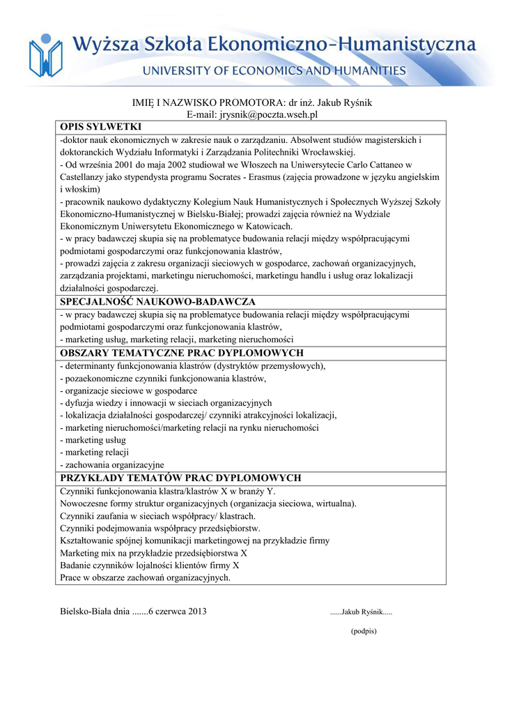IMIĘ I NAZWISKO PROMOTORA: dr inż. Jakub Ryśnik E-mail: [email protected] OPIS SYLWETKI -doktor nauk ekonomicznych w zakresie nauk o zarządzaniu. Absolwent studiów magisterskich i doktoranckich Wydziału Informatyki i Zarządzania Politechniki Wrocławskiej. - Od września 2001 do maja 2002 studiował we Włoszech na Uniwersytecie Carlo Cattaneo w Castellanzy jako stypendysta programu Socrates - Erasmus (zajęcia prowadzone w języku angielskim i włoskim) - pracownik naukowo dydaktyczny Kolegium Nauk Humanistycznych i Społecznych Wyższej Szkoły Ekonomiczno-Humanistycznej w Bielsku-Białej; prowadzi zajęcia również na Wydziale Ekonomicznym Uniwersytetu Ekonomicznego w Katowicach. - w pracy badawczej skupia się na problematyce budowania relacji między współpracującymi podmiotami gospodarczymi oraz funkcjonowania klastrów, - prowadzi zajęcia z zakresu organizacji sieciowych w gospodarce, zachowań organizacyjnych, zarządzania projektami, marketingu nieruchomości, marketingu handlu i usług oraz lokalizacji działalności gospodarczej. SPECJALNOŚĆ NAUKOWO-BADAWCZA - w pracy badawczej skupia się na problematyce budowania relacji między współpracującymi podmiotami gospodarczymi oraz funkcjonowania klastrów, - marketing usług, marketing relacji, marketing nieruchomości OBSZARY TEMATYCZNE PRAC DYPLOMOWYCH - determinanty funkcjonowania klastrów (dystryktów przemysłowych), - pozaekonomiczne czynniki funkcjonowania klastrów, - organizacje sieciowe w gospodarce - dyfuzja wiedzy i innowacji w sieciach organizacyjnych - lokalizacja działalności gospodarczej/ czynniki atrakcyjności lokalizacji, - marketing nieruchomości/marketing relacji na rynku nieruchomości - marketing usług - marketing relacji - zachowania organizacyjne PRZYKŁADY TEMATÓW PRAC DYPLOMOWYCH Czynniki funkcjonowania klastra/klastrów X w branży Y. Nowoczesne formy struktur organizacyjnych (organizacja sieciowa, wirtualna). Czynniki zaufania w sieciach współpracy/ klastrach. Czynniki podejmowania współpracy przedsiębiorstw. Kształtowanie spójnej komunikacji marketingowej na przykładzie firmy Marketing mix na przykładzie przedsiębiorstwa X Badanie czynników lojalności klientów firmy X Prace w obszarze zachowań organizacyjnych. Bielsko-Biała dnia .......6 czerwca 2013 ......Jakub Ryśnik..... (podpis)