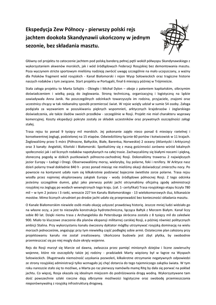 Ekspedycja Zew Północy - pierwszy polski rejs jachtem dookoła Skandynawii ukończony w jednym sezonie, bez składania masztu. Główny cel projektu to zatoczenie jachtem pod polską banderą pełnej pętli wokół półwyspu Skandynawskiego z wykorzystaniem akwenów morskich, jak i wód śródlądowych Federacji Rosyjskiej bez demontowania masztu. Poza wyczynem stricte sportowym mieliśmy nadzieję zwrócić uwagę szczególnie na mało uczęszczany, a ważny dla Polaków fragment wód rosyjskich - Kanał Białomorski i rejon Wysp Sołowieckich oraz tragiczne historie naszych rodaków z tym związane. Start projektu w Portugalii, finał 6 miesięcy później w Trójmieście. Stała załoga projektu to Marta Sziłajtis - Obiegło i Michał Dylon – oboje z patentem kapitańskim, olbrzymim doświadczeniem i wielką pasją do żeglowania. Stroną techniczną, organizacyjną i logistyczną na lądzie zawiadywała Anna Janik. Na poszczególnych odcinkach towarzyszyła im rodzina, przyjaciele, znajomi oraz uczestnicy chcący w tak niebanalny sposób przemierzać świat. W rejsie wzięły udział w sumie 54 osoby. Załoga podążała za wyzwaniem w poszukiwaniu pięknych wspomnień, arktycznych krajobrazów i żeglarskiego doświadczenia, ale także śladów swoich przodków - szczególnie w Rosji. Projekt nie miał charakteru wyprawy komercyjnej. Koszty ekspedycji pokryte zostały ze składek uczestników oraz prywatnych oszczędności załogi stałej. Trasa rejsu to ponad 9 tysięcy mil morskich. Jej pokonanie zajęło nieco ponad 6 miesięcy rzetelnej i konsekwentnej żeglugi, podzielonej na 15 etapów. Odwiedziliśmy łącznie 60 portów i kotwicowisk w 11 krajach. Żeglowaliśmy przez 5 mórz (Północne, Bałtyckie, Białe, Barentsa, Norweskie) 2 oceany (Atlantycki i Arktyczny) oraz 3 kanały: Angielski, Kiloński i Białomorski. Spotkaliśmy się z masą gościnności zarówno wśród lokalnych społeczności jak i od licznych rodaków napotykanych na całej trasie. Zachwycaliśmy się białymi nocami i piękną, słoneczną pogodą w dzikich pustkowiach północno-zachodniej Rosji. Dokonaliśmy trawersu 2 największych jezior Europy – Ładogi i Onegi. Obserwowaliśmy morsy, wieloryby, lisy polarne, foki i renifery. W Arktyce nasz dzień polarny trwał dokładnie 840 h - przez ponad miesiąc nie mieliśmy okazji doświadczyć zmierzchu nocy. Po powrocie na kontynent udało nam się kilkakrotnie podziwiać bajecznie świetliste zorze polarne. Trasa rejsu wiodła przez najmniej eksplorowany zakątek Europy - wody śródlądowe północnej Rosji. Z tego odcinka jesteśmy szczególnie dumni, gdyż jako pierwszy polski jacht otrzymaliśmy oficjalną zgodę administracji rosyjskiej na żeglugę po wodach wewnętrznych tego kraju. (zał. 1- certyfikat) Trasa rosyjskiego etapu liczyła 780 mil – w tym 2 jeziora i 3 rzeki, wreszcie 227 km Kanału Białomorskiego - 13 wielokomorowych śluz, kilkanaście mostów. Mimo licznych utrudnień po drodze jacht udało się przeprowadzić bez konieczności składania masztu. O Kanale Białomorskim niewiele osób miało okazję usłyszeć prawdziwą historię. Jeszcze mniej ludzi widziało go na własne oczy, a jest to niezwykła konstrukcja hydrotechniczna, łącząca Bałtyk z Morzem Białym. Kanał liczy sobie 80 lat. Dzięki niemu trasa z Archangielska do Petersburga skrócona została z 8 tysięcy mil do zaledwie 900. Miało to kluczowe znaczenie dla planów ekspansji militarnej carskiej Rosji, a później również politycznych ambicji Stalina. Przy wykorzystaniu kanału ówczesny dyktator mógłby utrzymywać rosyjską dominację na wielu morzach jednocześnie, angażując przy tym niewielką część podległej sobie armii. Ostatecznie plan założony przy projektowaniu kanału nie został zrealizowany. Ukończona budowla jest zbyt płytka, by swobodnie przemieszczać się po niej mogły duże okręty wojenne. Rejs do Rosji marzył się Marcie od dawna, zwłaszcza przez pamięć minionych dziejów i liczne zawieruchy wojenne, które nie oszczędziły także jej rodziny - pradziadek Marty więziony był w łagrze na Wyspach Sołowieckich. Długotrwała niemożność uzyskania pozwoleń, kilkakrotne otrzymanie negatywnych odpowiedzi ze strony rosyjskiej administracji tylko wzmagało jej chęć dotarcia do tego tajemniczego zakątka świata. W tym roku nareszcie stało się to możliwe, a Marta po raz pierwszy namówiła mamę Ritę by dała się porwać na pokład jachtu. Co więcej, Rosja okazała się idealnym miejscem do podróżowania drogą wodną. Wykorzystywane tam dość powszechnie szlaki rzeczne dają olbrzymie możliwości logistyczne oraz swobodę przemieszczania nieporównywalną z rosyjską infrastrukturą drogową. Jest to szczególnie cenne dla wszystkich, którzy cenią sobie ciszę, spokój i nieskrępowaną przestrzeń bezludnych terenów. Ten olbrzymi kraj dostarcza także niezliczonych okazji do wzruszeń, zachwytów, ale i odruchów nostalgii czy przerażenia. Rejs z historią w tle nie raz nas zadziwił, długo też nie pozwolił wyjść z głębszej zadumy nad niezwykłymi kolejami naszej wspólnej, polsko-rosyjskiej przeszłości. Sama budowa kanału godna jest szczególnej uwagi. Prace konstrukcyjne trwały zaledwie 20 miesięcy, zaś stworzony trakt wodny liczy sobie 227 kilometrów. Dla porównania kanał Sueski oraz Panamski są dużo krótsze, a budowane były przez pełne 10 lat. Przy budowie pracowało około 300 tysięcy więźniów politycznych, w tym kilkanaście procent Polaków. Mówi się, że za każdy metr kanału jeden więzień oddał życie. Praca w tym rejonie była potwornie ciężka- bez narzędzi, urządzeń, jakichkolwiek mechanicznych usprawnień. Więźniowie własnymi rękoma lub samymi tylko drewnianymi przyrządami drążyli kanał w skale oraz bagnistych glinach. Trakt został wytyczony przez podmokłe tereny, a robotników atakowały liczne plagi komarów, gzów i meszków, co dodatkowo utr