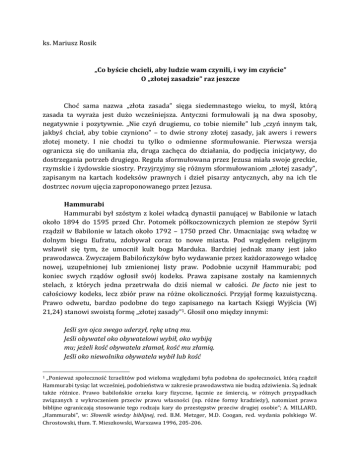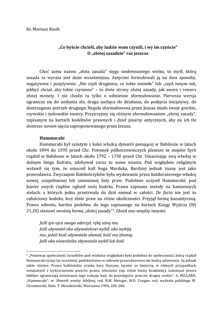 ks. Mariusz Rosik „Co byście chcieli, aby ludzie wam czynili, i wy im czyńcie” O „złotej zasadzie” raz jeszcze Choć sama nazwa „złota zasada” sięga siedemnastego wieku, to myśl, którą zasada ta wyraża jest dużo wcześniejsza. Antyczni formułowali ją na dwa sposoby, negatywnie i pozytywnie. „Nie czyń drugiemu, co tobie niemiłe” lub „czyń innym tak, jakbyś chciał, aby tobie czyniono” – to dwie strony złotej zasady, jak awers i rewers złotej monety. I nie chodzi tu tylko o odmienne sformułowanie. Pierwsza wersja ogranicza się do unikania zła, druga zachęca do działania, do podjęcia inicjatywy, do dostrzegania potrzeb drugiego. Reguła sformułowana przez Jezusa miała swoje greckie, rzymskie i żydowskie siostry. Przyjrzyjmy się różnym sformułowaniom „złotej zasady”, zapisanym na kartach kodeksów prawnych i dzieł pisarzy antycznych, aby na ich tle dostrzec novum ujęcia zaproponowanego przez Jezusa. Hammurabi Hammurabi był szóstym z kolei władcą dynastii panującej w Babilonie w latach około 1894 do 1595 przed Chr. Potomek półkoczowniczych plemion ze stepów Syrii rządził w Babilonie w latach około 1792 – 1750 przed Chr. Umacniając swą władzę w dolnym biegu Eufratu, zdobywał coraz to nowe miasta. Pod względem religijnym wsławił się tym, że umocnił kult boga Marduka. Bardziej jednak znany jest jako prawodawca. Zwyczajem Babilończyków było wydawanie przez każdorazowego władcę nowej, uzupełnionej lub zmienionej listy praw. Podobnie uczynił Hammurabi; pod koniec swych rządów ogłosił swój kodeks. Prawa zapisane zostały na kamiennych stelach, z których jedna przetrwała do dziś niemal w całości. De facto nie jest to całościowy kodeks, lecz zbiór praw na różne okoliczności. Przyjął formę kazuistyczną. Prawo odwetu, bardzo podobne do tego zapisanego na kartach Księgi Wyjścia (Wj 21,24) stanowi swoistą formę „złotej zasady”1. Głosił ono między innymi: Jeśli syn ojca swego uderzył, rękę utną mu. Jeśli obywatel oko obywatelowi wybił, oko wybiją mu; jeżeli kość obywatela złamał, kość mu złamią. Jeśli oko niewolnika obywatela wybił lub kość 1 „Ponieważ społeczność Izraelitów pod wieloma względami była podobna do społeczności, którą rządził Hammurabi tysiąc lat wcześniej, podobieństwa w zakresie prawodawstwa nie budzą zdziwienia. Są jednak także różnice. Prawo babilońskie orzeka kary fizyczne, łącznie ze śmiercią, w różnych przypadkach związanych z wykroczeniem przeciw prawu własności (np. różne formy kradzieży), natomiast prawa biblijne ograniczają stosowanie tego rodzaju kary do przestępstw przeciw drugiej osobie”; A. MILLARD, „Hammurabi”, w: Słownik wiedzy biblijnej, red. B.M. Metzger, M.D. Coogan, red. wydania polskiego W. Chrostowski, tłum. T. Mieszkowski, Warszawa 1996, 205-‐206. niewolnika obywatela złamał, połowę ceny jego zapłaci. Jeśli obywatel ząb obywatelowi równemu sobie wybił, ząb wybiją mu2. Sam Hammurabi miał świadomość niezwykłej wartości ustalonego przez siebie prawa; mówił o sobie: „Hammurabi, król sprawiedliwości, któremu Szamasz prawdę (o prawach) objawił, jam oto jest! Słowa moje są wyjątkowe, czyny moje równych nie mają. Tylko dla głupca są bez znaczenia, mądrego zaś wiodą ku chwale”3. Babiloński kodeks etyczno-‐prawny przystosowany do potrzeb Izraela, choć jeszcze nie zaczął na dobre funkcjonować, już okazał się otwarty na potrzebę zmian dokonywanych w imię Jahwe, którego nauczanie zaczynało sobie powoli torować drogę w sercach przynależących do Jego ludu. Herodot Piszący w dialekcie jońskim grecki historyk Herodot (485-‐ok. 425 przed Chr.) długie lata swego życia spędził w Atenach, następnie odbył wiele podróży, a ostatecznie osiadł w południowej Italii, w mieście Thurioj, gdzie Grecy założyli swą kolonię. Okres podróży okazał się niezwykle istotny w zbieraniu doświadczeń, które później znalazły swój wyraz na stronach Dziejów. Herodot zwiedził całą niemal Grecję i Azję Mniejszą, wybrzeża Morza Czarnego, kraj Scytów (dzisiejsza Ukraina), dotarł do Babilonu, a przypuszczalnie także do Suz. Zapuścił się w głąb Egiptu, odwiedził Cyrenę w Afryce i poznał fenickie miasta na wybrzeżu fenickim. Okres podróży zdecydowanie poszerzył jego horyzonty i pozwolił poznać prawa różnych ludów. Główne dzieło Herodota (grec. Historiai, łac. Historiae) podzielone zostało na dziewięć ksiąg, które wzięły nazwy od imion Muz. Podział ten jednak nie pochodzi od samego autora; jest późniejszy i jako czysto mechaniczny, rozrywa często części należące do siebie przez ciąg narracji. Przewodnia myśl dzieła dotyczy wojen grecko-‐perskich, które są wynikiem konfliktu między Wschodem a Zachodem. Herodot opisuje w Dziejach wydarzenia na wyspie Samos za rządów perskiego króla Dariusza I (522-‐485). Po ukrzyżowaniu Polikratesa władzę przejął niejaki Majandrios. Nowy władca dokonywał samoreklamy przed swoim ludem, takie wyrzekając słowa: „Mnie, jak wiecie, zostało poruczone berło i cała potęga Polikratesa, i teraz mam sposobność objąć władzę nad wami. Co jednak w drugim ganię, tego o ile możności i sam czynić nie będę”4. W praktyce „możności” tej nie starczyło na długo. Majandrios okazał się niezłym propagandystą, ale kiepskim władcą i dlatego szybko musiał opuścić ojczyznę. Obserwując historię współczesną, okazuje się, że grecki władca Samos nie był odosobniony w swej postawie. 2 Kodeks Hammurabiego n196-‐197. 3 Kodeks Hammurabiego 95-‐99. 4 Dzieje III, 142. Isokrates Mniej więcej sto lat później grecki retor Isokrates (436-‐388) przedstawił kolejną wersję „złotej zasady” 5. Był uczniem sofistów, Sokratesa i Teramenesa. Początkowo pisał jedynie mowy sądowe na zamówienie, z czasem jednak otworzył własną sz