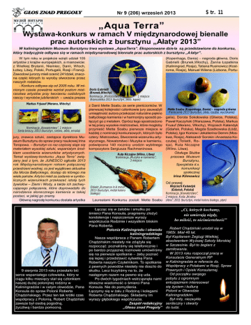 Nr 9 (206) wrzesień 2013 Str. 11 „Aqua Terra” Wystawa-konkurs w ramach V międzynarodowej bienalle prac autorskich z bursztynu „Ałatyr 2013” W kaliningradzkim Muzeum Bursztynu trwa wystawa „AquaTerra”. Eksponowane dzie ła są przedstawione do konkursu, który tradycyjnie odbywa się w ramach międzynarodowej biennale prac autorskich z bursztynu „A łatyr”. W tym roku w projekcie wzięli udział 105 artystów z krajów europejskich, a mianowicie: z Wielkiej Brytanii, Niemiec, Danii, Włoch, Łotwy, Litwy, Polski, Portugalii, Rosji i Francji. Zawodowi jurorzy mieli ocenić 241dzieł, znaczna część których to wyroby stworzone przez naszych rodaków. - Konkurs odbywa się od 2005 roku. W minionym czasie poważnie wzrósł poziom mistrzostwa artystów przy tworzeniu ozdobnych rzeczy i wyrobów jubilerskich – uważa prezes Markus Frjuauf (Merano, Włochy) Nominacja „Nowatorstwo”, 1 miejsce Seria broszy, 2013 (bursztyn, srebro, złoto, emalia) jury, znawca sztuki, zastępca dyrektora Muzeum Bursztynu do spraw pracy naukowej Irina Toropowa. – Bursztyn co raz częściej staje się materiałem wysokiej sztuki, wspaniałym środkiem uosobienia wizerunków artystycznych. Temat wystawy-konkursu „Aqua Terra” związany jest z tym, że JUNESCO ogłosiła 2013 rok Międzynarodowym rokiem połączonej przestrzeni wodnej, co jest wyjątkowo aktualne dla Morza Bałtyckiego, dostęp do którego ma wiele państw. Artyści mieli za zadanie w symbolicznych wizerunkach przekazać istotę tych żywiołów – Ziemi i Wody, a także ich zachwycającego połączenia, które doprowadziło do narodzenia słonecznego kamienia w takiej postaci, w jakiej go znamy. Główną nagrodę konkursu dostała artystka 9 sierpnia 2013 roku przesta ło bić serce wspaniałego człowieka, który w ciągu kilku miesięcy stał się członkiem naszej dużej polonijnej rodziny w Kaliningradzie i w całym obwodzie, Pana Konsula do spraw Polonii Roberta Chądzińskiego. Przez ten tak krótki czas współpracy z Polonią, Robert Chądziński zawsze był osobą pogodną, życzliwą i bardzo pomocną. (Kopenhaga, Dania) – nagroda główna, Doris Gabrielli (Brunek,Włochy), Żanna Łopatkina (Kaliningrad, Rosja), Tatiana Rusinowicz (Kostroma, Rosja), Manuel Wilena (Lizbona, Portu- Doris Gabrielli (Brunek,Włochy) Nominacja „Mistrzostwo”, 1 miejsce Bransoletka 2013 (bursztyn, złoto, łupek) z Danii Mette Soabu za serie pierścionków. W pierwszej kolejności członkowie jury zauważyli umiejętność autora przekazać naturalne piękno bałtyckiego kamienia i w harmonijny sposób połączyć go z metalem. Oprócz tego spostrzeżono w tej pracy wysokie mistrzostwo, które mogłoby przynieść Mette Soabu pierwsze miejsce w każdej z nominacji konkursowych, których było cztery: Mistrzostwo, Stworzenie wizerunku artystycznego, Nowatorstwo i Muzyka w kamieniu, poświęcona 140 rocznicy urodzin wybitnego kompozytora Sergiusza Rachmaninowa. Ruta Niczajne (Wilno, Litwa) Nominacja „Muzyka w kamieniu”, 3 miejsce Mette Soabu (Kopenhaga, Dania) – nagroda g łówna Pierścienie 2013 (bursztyn, złoto; rzeźba, wyciskanie) galia), Dorota Sokołowska (Gliwice, Polska), Paweł Kaczyński (Warszawa, Polska), Markus Fruauf (Merano, Włochy), Wojciech Kałandyk (Gdańsk, Polska), Magda Szadkowska (Łódź, Polska), Igor Komow i Jekatierina Gemm (Moskwa, Rosja), Aleksandr Sorokin i Anastazia Koczubej (Toliatti, Rosja), Ruta Niczajne (Wilno, Litwa). Obsługa Służba prasowa Muzeum Bursztynu, Specjalista d.s. komunikacji społecznej Irina Klimowicz Od prawej: Obiekt „Romance in A minor”, 2013 (bursztyn, metal koloru białego) Laureatami Konkursu zostali: Mette Soabu Łącząc się w żałobie i smutku po śmierci Pana Konsula, pragniemy złożyć kondolencje i najszczersze wyrazy współczucia Rodzinie i wszystkim bliskim Pana Roberta. Polonia Kaliningradu i obwodu kaliningradzkiego Nasza współpraca z Panem Robertem Chądzińskim niestety nie zdążyła się rozpocząć: poznaliśmy się telefonicznie i po bardzo przyjaznej rozmowie umówili śmy się na pierwsze spotkanie – żeby poznać się lepiej i przedstawić sylwetkę Pana Roberta naszym Czytelnikom. To spotkanie z pewnych powodów niestety nie dosz ło do skutku. Lecz liczyliśmy na to, że następnym razem na pewno się uda. Po dwóch tygodniach wstrząsnęła nami straszna wiadomość o śmierci Pana Konsula. Nie do pomyślenia. Łączymy się w żalu z Rodziną i kolegami Roberta Chądzińskiego. Składamy Im wyrazy głębokiego współczucia. Zespół redakcyjny „Głosu znad Pregoły” Wojciech Kałandyk (Gdańsk, Polska) Nominacja „Nowatorstwo”, 2 miejsce, Kolia „Wodna sfera”, 2011 (bursztyn, metal koloru białego, płyn) „Ci, których kochamy, nie umierają nigdy, bo miłość, to nieśmiertelność” Robert Chądziński urodził się w 1965r. Miał 48 lat. Był Kapitanem Żeglugi Wielkiej, absolwentem Wyższej Szkoły Morskiej w Szczecinie. Był to żeglarz z zamiłowania. W 2013 roku rozpoczął pracę w Konsulacie Generalnym RP w Kaliningradzie w referacie ds. Współpracy z Polakami w Rosji, Spraw Prawnych i Opieki Konsularnej. Od początku swojego pobytu z ogromnym entuzjazmem interesował się życiem i kulturą Polonii w Obwodzie Kaliningradzkim. Był miły, niezwykle serdeczny i otwarty do ludzi.