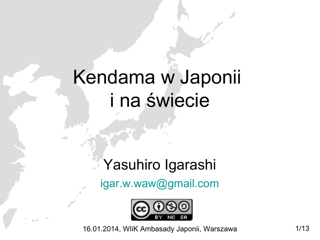 Kendama w Japonii i na świecie Yasuhiro Igarashi [email protected] 16.01.2014, WIiK Ambasady Japonii, Warszawa 1/13 Spis treści 1. 2. 3. 4. 5. Wprowadzenie Historia Nowa era Kendamy Gdzie i jak kupić w Polsce? Praktyka! 16.01.2014, WIiK Ambasady Japonii, Warszawa 2/13 Co to jest Kendama? Ken (剣 : miecz) Tama (玉 : kulka) (www.gloken.net) 16.01.2014, WIiK Ambasady Japonii, Warszawa 3/13 Czy kendama jest tradycyjną japońską zabawką? 16.01.2014, WIiK Ambasady Japonii, Warszawa 4/13 Czy kendama jest tradycyjną japońską zabawką? Odpowiedź: TAK i NIE to zależy od określenia „tradycji”. 16.01.2014, WIiK Ambasady Japonii, Warszawa 5/13 Historia (Według Japońskiego Stowarzyszenia Kendama) Sztych miedziany, Francja, 16 w. L'Enfant au Bilboquet Jeanne Bôle, 1880 r. Bilboquet we Francji od 16 wieku (wikipedia.org) 16.01.2014, WIiK Ambasady Japonii, Warszawa 6/13 Historia (Według Japońskiego Stowarzyszenia Kendama) 1777 r. Kednama dotarła do Japonii przez port Nagasaki 1. 拳会角力図会 (1809) „Sukui tama ken” (匕玉拳) 2. 嬉遊笑覧 (1830) „Kendama” (拳玉) ≠ (剣玉) 拳会角力図会, 1809 1919 r. Patent „Niczgec ball” Hatsuka-ichi, Hiroshima. ~ obecny kształt 1975 r. Japońskie Stowarzyszenie Kendama 1. Ujednolicenie kształtu kendamy 2. Reguły zawodów 3. Certyfikacja 1977-79 r. Yattāman 1980 r.~ Era gry telewizyjnej... Niczgec ball (日月ボール), 1919 (yatterman.jp) 16.01.2014, WIiK Ambasady Japonii, Warszawa 7/13 Boom światowy na YouTubie Przykładowe filmiki Pokaz standardowych 10 sztuczek http://www.youtube.com/watch?v=egSYy1VDORQ p. Katsuaki Shimadera, Mistrz kendamy z 6 dan けん玉の超高度な技 - Extreme Kendama α (29.06.2009) http://www.youtube.com/watch?v=o2swtpVXmi8 p. Colin Sander (2007~), profesjonalny narciarz i reżyser filmowy Kendama Edit #8 - The Kendama USA Pro Models - けん玉 http://www.youtube.com/watch?v=G3RnWpZSft0 Kendama USA Welcomes Haley Bishoff to the Tribute Team http://www.youtube.com/watch?v=MHWJUUnM5KU 1minute EFK #8, (Kendama z tańcem) http://www.youtube.com/watch?v=81gVEyZmrYU Kendama Polska Team on Matsuri (08.06.2013) http://www.youtube.com/watch?v=46IItCcqN20 16.01.2014, WIiK Ambasady Japonii, Warszawa 8/13 European Kendama Open Championship w Europejskiej Konwencji Żonglerki (EJC) Od 2008 r. jest organizowany przez Anglika p. Void. http://ejc2014.org/ W 2012 r. odbyły się w Lublinie. 16.01.2014, WIiK Ambasady Japonii, Warszawa 9/13 Gdzie i jak można kupić? Allegro http://allegro.pl/listing/listing.php?limit=120&string=kendama 1. „Ozora” z Japonii http://www.kendama.co.jp/english/index.html 2. „PLAY Kendama” z Niemcy http://kendama.de/play_kendama/ 3. „Sun Rise” z Holandii http://www.thekendamacompany.com/ Bezpośrednio z Japonii. „Fuji” najtańsze http://global.rakuten.com/en/search?st=&tl=0&k=kendama Grupowy zakup od Stowarzyszenia 16.01.2014, WIiK Ambasady Japonii, Warszawa 10/13 Podsumowanie 1. 2. 3. 4. 5. Za 5 lat kendama ma 100 lat! Rozpowszechnienie dzięki YouTubie Gorący powrót do Japonii Polacy też zaczęli grać Globalna ewolucja międzynarodowej społeczności graczy 16.01.2014, WIiK Ambasady Japonii, Warszawa 11/13 Literatura i polecane linki Japońskie Stowarzyszenie Kendama http://kendama.or.jp/ Global Kendama Network (Gloken) http://www.gloken.net/ Mistrz kendamy p. Katsuaki Shimadera (6-dan) http://www.youtube.com/user/shakemid/ KendamaEFK http://www.youtube.com/user/KendamaEFK/ Colin Sander http://www.youtube.com/user/ColinSander/ KendamaUSA http://www.youtube.com/user/KendamaUSA/ Kendama Polska http://www.youtube.com/user/kendamapolska/ 16.01.2014, WIiK Ambasady Japonii, Warszawa 12/13 Dziękuję bardzo za uwagę, i ZAGRAJMY kendamę! Podziękowanie dla R.W. za pomoc. Materyał prezentacji jest umieszczony w http://www.slideshare.net/IgarJpn Kontakt: [email protected] 16.01.2014, WIiK Ambasady Japonii, Warszawa 13/13