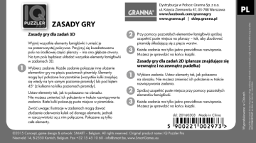 ZASADY GRY Wyjmij wszystkie elementy łamigłówki i umieść je na przezroczystej pokrywce. Przyjrzyj się kwadratowemu polu na środkowej części planszy – ma ono głębsze otwory. Na tym polu będziesz układać wszystkie elementy łamigłówki w zadaniach 3D. 1 Wybierz zadanie. Każde zadanie pokazuje inne ułożenie elementów gry na pięciu poziomach piramidy. Elementy mogą być położone horyzontalnie (wszystkie kulki znajdują się wtedy na tym samym poziomie piramidy) lub pod kątem 45o (z kulkami na kilku poziomach piramidy). Ustaw elementy tak, jak to pokazano na obrazku. Nie możesz zmieniać ich położenia w trakcie rozwiązywania zadania. Białe kulki pokazują puste miejsca w piramidzie. Zwróć uwagę: Ilustracje w zadaniach mogą dawać złudzenie oderwania kulek od danego elementu, jednak w rzeczywistości są z nim połączone. Pokazane są tylko całe elementy. 2 Przy pomocy pozostałych elementów łamigłówki spróbuj uzupełnić puste miejsca na planszy – tak, aby zbudować piramidę składającą się z pięciu warstw. 3 Każde zadanie ma tylko jedno prawidłowe rozwiązanie. Możesz je sprawdzić na końcu książki. Zasady gry dla zadań 2D (plansze znajdujące się wewnątrz i na zewnątrz pudełka) 1 Wybierz zadanie. Ustaw elementy tak, jak pokazano na obrazku. Nie możesz zmieniać ich położenia w trakcie rozwiązywania zadania. 2 Spróbuj uzupełnić puste miejsca przy pomocy pozostałych elementów łamigłówki. 3 Każde zadanie ma tylko jedno prawidłowe rozwiązanie. Możesz je sprawdzić na końcu książki. dd: 20160303 Made in China ©2015 Concept, game design & artwork: SMART – Belgium. All rights reserved. Original product name: IQ Puzzler Pro Neerveld 14, B-2550 Kontich, Belgium. Fax +32 15 45 10 60 - [email protected], www.SmartGames.eu Wyprodukowano w Chinach. Zasady gry dla zadań 3D PL Drogi Kliencie! Jeżeli chcesz otrzymywać drogą mailową wiadomości o nowościach, wyślij e-mail z taką informacją na adres: [email protected] i podpisz go imieniem i nazwiskiem. Dystrybucja w Polsce: Granna Sp. z o.o. ul. Księcia Ziemowita 47, 03-788 Warszawa www.facebook.com/grannagry www.granna.pl | sklep.granna.pl PL Wyjmij wszystkie elementy łamigłówki i umieść je na przezroczystej pokrywce. Przyjrzyj się kwadratowemu polu na środkowej części planszy – ma ono głębsze otwory. Na tym polu będziesz układać wszystkie elementy łamigłówki w zadaniach 3D. 1 2 Przy pomocy pozostałych elementów łamigłówki spróbuj uzupełnić puste miejsca na planszy – tak, aby zbudować piramidę składającą się z pięciu warstw. 3 Każde zadanie ma tylko jedno prawidłowe rozwiązanie. Możesz je sprawdzić na końcu książki. Wybierz zadanie. Każde zadanie pokazuje inne ułożenie elementów gry na pięciu poziomach piramidy. Elementy mogą być położone horyzontalnie (wszystkie kulki znajdują się wtedy na tym samym poziomie piramidy) lub pod kątem 45o (z kulkami na kilku poziomach piramidy). 1 Ustaw elementy tak, jak to pokazano na obrazku. Nie możesz zmieniać ich położenia w trakcie rozwiązywania zadania. Białe kulki pokazują puste miejsca w piramidzie. Wybierz zadanie. Ustaw elementy tak, jak pokazano na obrazku. Nie możesz zmieniać ich położenia w trakcie rozwiązywania zadania. 2 Spróbuj uzupełnić puste miejsca przy pomocy pozostałych elementów łamigłówki. 3 Każde zadanie ma tylko jedno prawidłowe rozwiązanie. Możesz je sprawdzić na końcu książki. Zwróć uwagę: Ilustracje w zadaniach mogą dawać złudzenie oderwania kulek od danego elementu, jednak w rzeczywistości są z nim połączone. Pokazane są tylko całe elementy. Zasady gry dla zadań 2D (plansze znajdujące się wewnątrz i na zewnątrz pudełka) © 2015 Concept, game design & artwork: Neerveld 14, B-2550 Kontich, Belgium SMART – Belgium. All rights reserved. Fax +32 15 45 10 60 - [email protected] Original product name: IQ Puzzler Pro www.SmartGames.eu dd: 20160303 Made in China Zasady gry dla zadań 3D Dystrybucja w Polsce: Granna Sp. z o.o. ul. Księcia Ziemowita 47, 03-788 Warszawa www.facebook.com/grannagry www.granna.pl | sklep.granna.pl