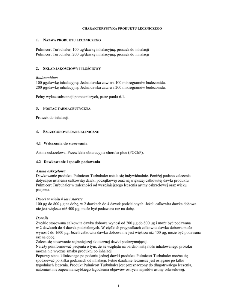 CHARAKTERYSTYKA PRODUKTU LECZNICZEGO 1. NAZWA PRODUKTU LECZNICZEGO Pulmicort Turbuhaler, 100 g/dawkę inhalacyjną, proszek do inhalacji Pulmicort Turbuhaler, 200 g/dawkę inhalacyjną, proszek do inhalacji 2. SKŁAD JAKOŚCIOWY I ILOŚCIOWY Budesonidum 100 g/dawkę inhalacyjną: Jedna dawka zawiera 100 mikrogramów budezonidu. 200 g/dawkę inhalacyjną: Jedna dawka zawiera 200 mikrogramów budezonidu. Pełny wykaz substancji pomocniczych, patrz punkt 6.1. 3. POSTAĆ FARMACEUTYCZNA Proszek do inhalacji. 4. SZCZEGÓŁOWE DANE KLINICZNE 4.1 Wskazania do stosowania Astma oskrzelowa. Przewlekła obturacyjna choroba płuc (POChP). 4.2 Dawkowanie i sposób podawania Astma oskrzelowa Dawkowanie produktu Pulmicort Turbuhaler ustala się indywidualnie. Poniżej podano zalecenia dotyczące ustalenia całkowitej dawki początkowej oraz największej całkowitej dawki produktu Pulmicort Turbuhaler w zależności od wcześniejszego leczenia astmy oskrzelowej oraz wieku pacjenta. Dzieci w wieku 6 lat i starsze 100 g do 800 g na dobę, w 2 dawkach do 4 dawek podzielonych. Jeżeli całkowita dawka dobowa nie jest większa niż 400 g, może być podawana raz na dobę. Dorośli Zwykle stosowana całkowita dawka dobowa wynosi od 200 g do 800 g i może być podawana w 2 dawkach do 4 dawek podzielonych. W ciężkich przypadkach całkowita dawka dobowa może wynosić do 1600 g. Jeżeli całkowita dawka dobowa nie jest większa niż 400 g, może być podawana raz na dobę. Zaleca się stosowanie najmniejszej skutecznej dawki podtrzymującej. Należy poinformować pacjenta o tym, że ze względu na bardzo małą ilość inhalowanego proszku można nie wyczuć smaku produktu po inhalacji. Poprawy stanu klinicznego po podaniu jednej dawki produktu Pulmicort Turbuhaler można się spodziewać po kilku godzinach od inhalacji. Pełne działanie lecznicze jest osiągane po kilku tygodniach leczenia. Produkt Pulmicort Turbuhaler jest przeznaczony do długotrwałego leczenia, natomiast nie zapewnia szybkiego łagodzenia objawów ostrych napadów astmy oskrzelowej. 1 Badania kliniczne wykazały, że depozycja budezonidu w płucach po zastosowaniu produktu Pulmicort Turbuhaler jest większa niż po zastosowaniu aerozolu ciśnieniowego (pMDI). W przypadku zmiany leczenia produktem zawierającym budezonid w postaci aerozolu ciśnieniowego na produkt Pulmicort Turbuhaler w stanie stabilnym astmy oskrzelowej należy rozważyć zmniejszenie dawki produktu. U pacjentów, którym trzeba zwiększyć dawkę glikokortykosteroidów w celu poprawy skuteczności leczenia, zwykle zaleca się raczej zwiększenie dawki produktu Pulmicort Turbuhaler niż włączenie glikokortykosteroidów doustnych z powodu mniejszego ryzyka ogólnoustrojowych działań niepożądanych. Pacjenci leczeni doustnymi glikokortykosteroidami Po uzyskaniu właściwej kontroli astmy, stosowanie produktu Pulmicort Turbuhaler pozwala na zastąpienie lub znaczące zmniejszenie dawki doustnych glikokortykosteroidów. Podczas zmiany leczenia z doustnych glikokortykosteroidów na leczenie produktem Pulmicort Turbuhaler pacjent powinien być we względnie stabilnym stanie. Zaleca się wówczas stosowanie przez 10 dni dużych dawek produktu Pulmicort Turbuhaler w skojarzeniu z wcześniej stosowanym glikokortykosteroidem doustnym w niezmienionej dawce. Następnie dawkę doustnego glikokortykosteroidu należy stopniowo zmniejszać (np. mniej więcej o 2,5 mg prednizolonu lub równoważną dawkę innego glikokortykosteroidu na miesiąc) do najmniejszej dawki zapewniającej kontrolę objawów choroby. Często stosowanie doustnych glikokortykosteroidów można zastąpić całkowicie produktem Pulmicort Turbuhaler. Dalsze informacje dotyczące odstawiania glikokortykosteroidów, patrz punkt 4.4. Pacjenci z niewydolnością nerek lub wątroby Nie ma danych dotyczących stosowania produktu Pulmicort Turbuhaler u pacjentów z zaburzeniami czynności nerek lub wątroby. Budezonid jest metabolizowany głównie w wątrobie, dlatego u pacjentów z ciężką marskością wątroby może dojść do zwiększenia jego stężenia w surowicy. Instrukcja dotycząca prawidłowego stosowania produktu Pulmicort Turbuhaler Bardzo ważne jest prawidłowe używanie inhalatora Turbuhaler. Szczegółowa instrukcja stosowania jest dołączona do każdego opakowania leku. W celu zminimalizowania ryzyka wystąpienia zakażeń grzybiczych w obrębie jamy ustnej i gardła, pacjent powinien wypłukać jamę ustną wodą po każdej inhalacji. Przewlekła obturacyjna choroba płuc (POChP) Zalecaną dawką produktu Pulmicort Turbuhaler jest 400 g podawane dwa razy na dobę. Jeśli pacjentom z POChP stosującym doustne glikokortykosteroidy przepisuje się produkt Pulmicort Turbuhaler, należy podczas zmniejszania dawki glikokortykosteroidów doustnych stosować u nich te same zalecenia, które podano w części „Pacjenci leczeni doustnymi glikokortykosteroidami”. 4.3 Przeciwwskazania Nadwrażliwość na budezonid. 4.4 Specjalne ostrzeżenia i środki ostrożności dotyczące stosowania Budezonid nie jest przeznaczony do szybkiego łagodzenia objawów w zaostrzeniach astmy, kiedy to wymagane jest zastosowanie wziewnie krótko działającego leku rozszerzającego oskrzela. Pacjenci, u których było konieczne doraźne leczenie dużymi dawkami glikokortykosteroidów lub długotrwałe leczenie największymi zalecanymi dawkami wziewnych glikokortykosteroidów należą do grupy zwiększonego ryzyka wystąpienia niewydolności kory nadnerczy. Mogą u nich wystąpić 2 objawy niewydolności kory nadnerczy w sytuacjach nasilonego stresu. Należy rozważyć zwiększenie dawki glikokortykosteroidów doustnych przed przewidywanym narażeniem na ciężki stres oraz przed planowanymi zabiegami chirurgicznymi. Objawy ogólnoustrojowe mogą wystąpić podczas stosowania wziewnych glikokortykosteroidów, szczególnie, gdy są one stosowane długotrwale w dużych dawkach. Prawdopodobieństwo wystąpienia tych objawów po z