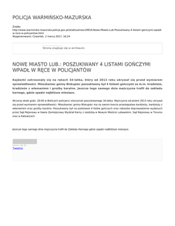 POLICJA WARMIŃSKO-MAZURSKA Źródło: http://www.warminsko-mazurska.policja.gov.pl/ol/aktualnosci/9919,Nowe-Miasto-Lub-Poszukiwany-4-listami-gonczymi-wpadlw-rece-w-policjantow.html Wygenerowano: Czwartek, 2 marca 2017, 16:24 Strona znajduje się w archiwum. NOWE MIASTO LUB.: POSZUKIWANY 4 LISTAMI GOŃCZYMI WPADŁ W RĘCE W POLICJANTÓW Kajdanki zatrzasnęły się na rękach 34-latka, który od 2013 roku ukrywał się przed wymiarem sprawiedliwości. Mieszkaniec gminy Biskupiec poszukiwany był 4 listami gończymi za m.in. kradzieże, kradzieże z włamaniem i groźby karalne. Jeszcze tego samego dnia mężczyzna trafił do zakładu karnego, gdzie spędzi najbliższe miesiące. Wczoraj około godz. 20:00 w Bielicach policjanci ztarzymali poszukiwanego 34-latka. Mężczyzna od jesieni 2013 roku ukrywał się przed wymiarem sprawiedliwości. Mieszkaniec gminy Biskupiec ma na swoim koncie przestępstwa kardzieży, kardzieży z włamaniem oraz groźby karalne. Poszukiwany był na podstawie 4 listów gończych oraz nakazów doprowadzenia wydanych przez Sąd Rejonowy w Iławie Zamiejscowy Wydział Karny z siedzibą w Nowym Mieście Lubawskim, Sąd Rejonowy w Toruniu oraz w Katowicach. Jeszcze tego samego dnia męzczyzna trafił do Zakładu Karnego gdzie spędzi najlbliższe miesiące. Ocena: 0/5 (0) Tweetnij