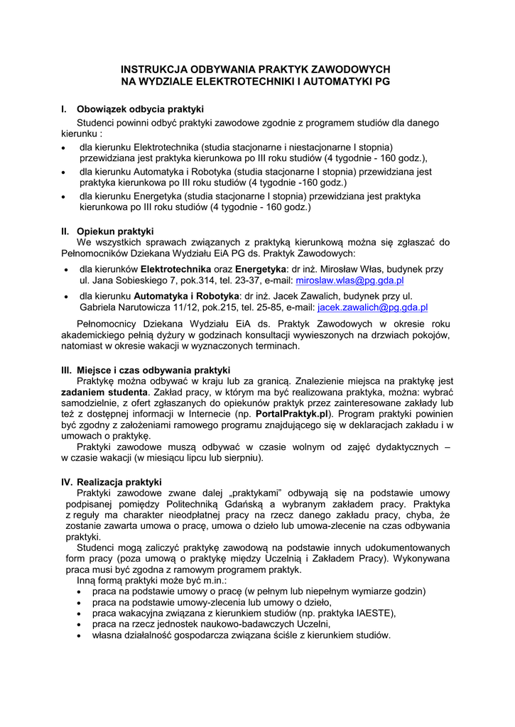 INSTRUKCJA ODBYWANIA PRAKTYK ZAWODOWYCH NA WYDZIALE ELEKTROTECHNIKI I AUTOMATYKI PG Obowiązek odbycia praktyki Studenci powinni odbyć praktyki zawodowe zgodnie z programem studiów dla danego kierunku : dla kierunku Elektrotechnika (studia stacjonarne i niestacjonarne I stopnia) przewidziana jest praktyka kierunkowa po III roku studiów (4 tygodnie - 160 godz.), dla kierunku Automatyka i Robotyka (studia stacjonarne I stopnia) przewidziana jest praktyka kierunkowa po III roku studiów (4 tygodnie -160 godz.) dla kierunku Energetyka (studia stacjonarne I stopnia) przewidziana jest praktyka kierunkowa po III roku studiów (4 tygodnie - 160 godz.) I. II. Opiekun praktyki We wszystkich sprawach związanych z praktyką kierunkową można się zgłaszać do Pełnomocników Dziekana Wydziału EiA PG ds. Praktyk Zawodowych: dla kierunków Elektrotechnika oraz Energetyka: dr inż. Mirosław Włas, budynek przy ul. Jana Sobieskiego 7, pok.314, tel. 23-37, e-mail: [email protected] dla kierunku Automatyka i Robotyka: dr inż. Jacek Zawalich, budynek przy ul. Gabriela Narutowicza 11/12, pok.215, tel. 25-85, e-mail: [email protected] Pełnomocnicy Dziekana Wydziału EiA ds. Praktyk Zawodowych w okresie roku akademickiego pełnią dyżury w godzinach konsultacji wywieszonych na drzwiach pokojów, natomiast w okresie wakacji w wyznaczonych terminach. III. Miejsce i czas odbywania praktyki Praktykę można odbywać w kraju lub za granicą. Znalezienie miejsca na praktykę jest zadaniem studenta. Zakład pracy, w którym ma być realizowana praktyka, można: wybrać samodzielnie, z ofert zgłaszanych do opiekunów praktyk przez zainteresowane zakłady lub też z dostępnej informacji w Internecie (np. PortalPraktyk.pl). Program praktyki powinien być zgodny z założeniami ramowego programu znajdującego się w deklaracjach zakładu i w umowach o praktykę. Praktyki zawodowe muszą odbywać w czasie wolnym od zajęć dydaktycznych – w czasie wakacji (w miesiącu lipcu lub sierpniu). IV. Realizacja praktyki Praktyki zawodowe zwane dalej „praktykami” odbywają się na podstawie umowy podpisanej pomiędzy Politechniką Gdańską a wybranym zakładem pracy. Praktyka z reguły ma charakter nieodpłatnej pracy na rzecz danego zakładu pracy, chyba, że zostanie zawarta umowa o pracę, umowa o dzieło lub umowa-zlecenie na czas odbywania praktyki. Studenci mogą zaliczyć praktykę zawodową na podstawie innych udokumentowanych form pracy (poza umową o praktykę między Uczelnią i Zakładem Pracy). Wykonywana praca musi być zgodna z ramowym programem praktyk. Inną formą praktyki może być m.in.: praca na podstawie umowy o pracę (w pełnym lub niepełnym wymiarze godzin) praca na podstawie umowy-zlecenia lub umowy o dzieło, praca wakacyjna związana z kierunkiem studiów (np. praktyka IAESTE), praca na rzecz jednostek naukowo-badawczych Uczelni, własna działalność gospodarcza związana ściśle z kierunkiem studiów. Przed odbyciem praktyki student powinien mieć przygotowane następujące dokumenty: podpisaną przez Uczelnię i Zakład Pracy umowę o organizację praktyk zawodowych, ubezpieczenie od następstw nieszczęśliwych wypadków NW (zgłoszenie do ubezpieczenia przyjmuje Dziekanat Wydziału EiA na podstawie umowy podpisanej przed rozpoczęciem praktyki), ważne badania lekarskie (skierowanie na badania wydaje Dziekanat Wydziału EiA). Umowa (w 2 egzemplarzach) dotycząca praktyki musi być zawarta przed rozpoczęciem praktyki. Nie będą uwzględniane umowy o realizację praktyk składane razem z poświadczeniem jej wykonania po jej zakończeniu. V. Zaliczenie praktyki W celu zaliczenia praktyki odbytej na podstawie umowy między Uczelnią i Zakładem Pracy należy zgłosić się do Pełnomocnika ds. Praktyk na rozmowę zaliczeniową, dostarczając następujące dokumenty: zaświadczenie ukończenia praktyki potwierdzone przez opiekuna i kierownika lub dyrektora Zakładu Pracy (wzór zaświadczenia na stronie internetowej), sprawozdanie z praktyki (co najmniej kilkustronicowe sprawozdanie zawierające opis wykonanych prac i czynności, które miały na celu podniesienie wiedzy praktycznej studenta). Wzór pierwszej strony znajduje się na stronie internetowej Wydziału. Pełnomocnik ds. Praktyk może wymagać od studentów przygotowania odpowiedzi na konkretne zagadnienia dotyczące przebiegu i merytorycznego zakresu praktyki. W celu zaliczenia praktyki na podstawie innych udokumentowanych form pracy (poza umową o praktykę między Uczelnią i Zakładem Pracy): - student studiów stacjonarnych powinien złożyć do Prodziekana ds. Kształcenia odpowiednie podanie (z akceptacją Pełnomocnika ds. Praktyk) wraz z dokumentami poświadczającymi okres pracy oraz zakres wykonywanych obowiązków i sprawozdaniem z prac będących ekwiwalentem praktyki, - student studiów niestacjonarnych powinien złożyć w Dziekanacie odpowiednie dokumenty potwierdzające okres zatrudnienia oraz zakres wykonywanych obowiązków. Termin zaliczenia praktyki jest ustalany przez Pełnomocnika ds. Praktyk, jednak nie później niż do ostatecznego terminu złożenia wniosków o rejestrację na kolejny semestr. VI. Informacje ogólne W sprawach nieuregulowanych tą instrukcją obowiązuje Regulamin stacjonarnych i niestacjonarnych studiów wyższych na Politechnice Gdańskiej oraz Regulamin odbywania praktyk zawodowych Politechniki Gdańskiej wprowadzony Zarządzeniem Rektora Politechniki Gdańskiej nr 2/2011 z 28 stycznia 2011 r. Niniejsza instrukcja obowiązuje od semestru letniego 2014/2015.