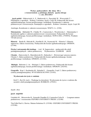Wykaz podręczników dla klasy III a z rozszerzeniem j. polskiego, historii, języka obcego - r. szk. 2012/2013 język polski - Makowiecki A. Z., Markowski A., Paszyński W., Wroczyński T. Pamiętajcie o ogrodach... Kultura. Literatura. Język. Część III. Podręcznik dla liceum ogólnokształcącego, liceum profilowanego i technikum. Kształcenie w zakresie podstawowym i rozszerzonym. Pamiętajcie o ogrodach... Kultura. Literatura. Język. Część III. Antologia. Kształcenie w zakresie rozszerzonym. WSiP S. A.. (5/04). Matematyka Babiański W., Chańko W., Czarnowska J., Wesołowska J. - Matematyka 3. Kształcenie ogólne w zakresie podstawowym i rozszerzonym. Podręcznik dla liceum ogólnokształcącego, liceum profilowanego i technikum. NOWA ERA. (79/09/S). Wydanie VII lub nowsze Historia Burda B., Halczak B., Józefiak R. M., Szymczak M. - Historia 3. Historia najnowsza. Zakres rozszerzony. Podręcznik dla liceum ogólnokształcącego. OPERON. (27/04). Fizyka i astronomia dla każdego ( red. B. Sagnowska) – podręcznik dla szkół ponadgimnazjalnych - zakres podstawowy Wydawnictwo ZAMKOR (46/02 Chemia . Hejwowska S., Marcinkowski R., Staluszka J. - Równowagi i procesy jonowe. Chemia 3. Zakres podstawowy. Podręcznik dla liceum ogólnokształcącego, liceum profilowanego i technikum. OPERON. (313/03). Biologia . Balerstet J. i in. - Biologia 2. Zakres podstawowy. Podręcznik dla liceum ogólnokształcącego, liceum profilowanego i technikum. OPERON. (242/03). Geografia . Kop J., Kucharska M., Szkurłat E. - Geografia. Część 2. Zakres podstawowy (szkoły ponadgimnazjalne). WYD.SZKOLNE PWN. (53/03). Wychowanie do życia w rodzinie Król T., Ryś M. (red.) - Wędrując ku dorosłości. Wychowanie do życia w rodzinie dla uczniów szkół ponadgimnazjalnych. RUBIKON. (270/01) Języki obce język angielski Umińska M. , Mrozowska H., Szmerdt-Chandler D. Czarnecka-Cicha B. - Longman matura podstawowa i rozszerzona OXFORD UNIVERSITY PRESS (132/08) Tim Falla Paul A. Davies. Matura Solutions II (155/06) OXFORD UNIVERSITY PRESS. (155/06). język niemiecki Łuniewska K., Wąsik Z. - alles klar , Podręcznik z ćwiczeniami. Kurs dla początkujących dla liceum ogólnokształcącego, liceum profilowanego i technikum - zakres podstawowy (klasa III). WSiP S. A.. (73/04). język rosyjski Granatowska H., Danecka I. - Kak dieła? 3. Podręcznik do języka rosyjskiego dla szkół ponadgimnazjalnych. WYD.SZKOLNE PWN. (186/04). Wykaz podręczników dla klasy III b z rozszerzeniem j. polskiego, historii, języka obcego - r. szk. 2012/2013 język polski - Makowiecki A. Z., Markowski A., Paszyński W., Wroczyński T. Pamiętajcie o ogrodach... Kultura. Literatura. Język. Część III. Podręcznik dla liceum ogólnokształcącego, liceum profilowanego i technikum. Kształcenie w zakresie podstawowym i rozszerzonym. Pamiętajcie o ogrodach... Kultura. Literatura. Język. Część III. Antologia. Kształcenie w zakresie rozszerzonym. WSiP S. A.. (5/04). Matematyka Babiański W., Chańko W., Czarnowska J., Wesołowska J. - Matematyka 3. Kształcenie ogólne w zakresie podstawowym i rozszerzonym. Podręcznik dla liceum ogólnokształcącego, liceum profilowanego i technikum. NOWA ERA. (79/09/S). Wydanie VII lub nowsze Historia Burda B., Halczak B., Józefiak R. M., Szymczak M. - Historia 3. Historia najnowsza. Zakres rozszerzony. Podręcznik dla liceum ogólnokształcącego. OPERON. (27/04). Fizyka i astronomia dla każdego ( red. B. Sagnowska) – podręcznik dla szkół ponadgimnazjalnych - zakres podstawowy Wydawnictwo ZAMKOR (46/02 Chemia . Hejwowska S., Marcinkowski R., Staluszka J. - Równowagi i procesy jonowe. Chemia 3. Zakres podstawowy. Podręcznik dla liceum ogólnokształcącego, liceum profilowanego i technikum. OPERON. (313/03). Biologia . Balerstet J. i in. - Biologia 2. Zakres podstawowy. Podręcznik dla liceum ogólnokształcącego, liceum profilowanego i technikum. OPERON. (242/03). Geografia . Kop J., Kucharska M., Szkurłat E. - Geografia. Część 2. Zakres podstawowy (szkoły ponadgimnazjalne). WYD.SZKOLNE PWN. (53/03). Wychowanie do życia w rodzinie Król T., Ryś M. (red.) - Wędrując ku dorosłości. Wychowanie do życia w rodzinie dla uczniów szkół ponadgimnazjalnych. RUBIKON. (270/01) Języki obce język angielski Umińska M. , Mrozowska H., Szmerdt-Chandler D. Czarnecka-Cicha B. - Longman matura podstawowa i rozszerzona OXFORD UNIVERSITY PRESS (132/08) Tim Falla Paul A. Davies. Matura Solutions II (155/06) OXFORD UNIVERSITY PRESS. (155/06). język niemiecki Brewińska E., Joras M., Obidniak D., Świerczyńska E. - Partnersprache 3. Kurs kontynuacyjny (kształcenie w zakresie podstawowym i rozszerzonym). WYD.SZKOLNE PWN. (228/04). język rosyjski Granatowska H., Danecka I. - Kak dieła? 3. Podręcznik do języka rosyjskiego dla szkół ponadgimnazjalnych. WYD.SZKOLNE PWN. (186/04). Wykaz podręczników dla klasy III rozszerzenie : matematyka, fizyka, informatyka r. szk. 2012/2013 język polski : Makowiecki A. Z., Markowski A., Paszyński W., Wroczyński T. Pamiętajcie o ogrodach... Kultura. Literatura. Język. Część III. Podręcznik dla liceum ogólnokształcącego, liceum profilowanego i technikum. Kształcenie w zakresie podstawowym i rozszerzonym. Pamiętajcie o ogrodach... Kultura. Literatura. Język. Część III (5/04). Matematyka Babiański W., Chańko W., Czarnowska J., Wesołowska J. - Matematyka 3. Kształcenie ogólne w zakresie podstawowym i rozszerzonym. Podręcznik dla liceum ogólnokształcącego, liceum profilowanego i technikum. NOWA ERA. (79/09/S) Wydanie VII lub nowsze Historia Burda B., Halczak B., Józefiak R. M., Szymczak M. - Historia 3. Historia najnowsza. Zakres podstawowy. Podręcznik dla liceum ogólnokształcącego, liceum profilowanego i technikum. OPERON. (427/03). Fizyka i astronomia dla szkół ponadgimnazjalnych - Kurs podstawowy z elementami kursu rozszerzonego koniecznymi do podjęcia studiów technicznych i przyrodniczych. (pod re