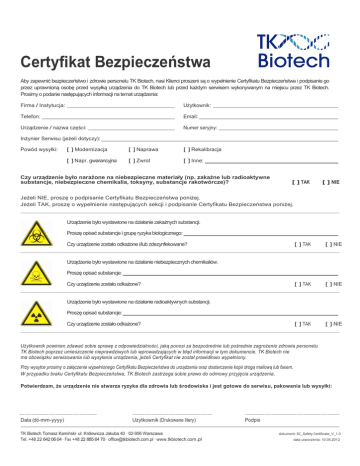 Certyfikat Bezpieczeństwa Aby zapewnić bezpieczeństwo i zdrowie personelu TK Biotech, nasi Klienci proszeni są o wypełnienie Certyfikatu Bezpieczeństwa i podpisanie go przez uprawnioną osobę przed wysyłką urządzenia do TK Biotech lub przed każdym serwisem wykonywanym na miejscu przez TK Biotech. Prosimy o podanie następujących informacji na temat urządzenia: Firma / Instytucja: Użytkownik: Telefon: Email: Urządzenie / nazwa części: Numer seryjny: Inżynier Serwisu (jeżeli dotyczy): Powód wysyłki: [ ] Modernizacja [ ] Naprawa [ ] Rekalibracja [ ] Napr. gwarancyjna [ ] Zwrot [ ] Inne: Czy urządzenie było narażone na niebezpieczne materiały (np. zakaźne lub radioaktywne substancje, niebezpieczne chemikalia, toksyny, substancje rakotwórcze)? [ ] TAK [ ] NIE Jeżeli NIE, proszę o podpisanie Certyfikatu Bezpieczeństwa poniżej. Jeżeli TAK, proszę o wypełnienie następujących sekcji i podpisanie Certyfikatu Bezpieczeństwa poniżej. Urządzenie było wystawione na działanie zakaźnych substancji. Proszę opisać substancje i grupę ryzyka biologicznego: Czy urządzenie zostało odkażone i/lub zdezynfekowane? [ ] TAK [ ] NIE [ ] TAK [ ] NIE [ ] TAK [ ] NIE Urządzenie było wystawione na działanie niebezpiecznych chemikaliów. Proszę opisać substancje: Czy urządzenie zostało odkażone? Urządzenie było wystawione na działanie radioaktywnych substancji. Proszę opisać substancje: Czy urządzenie zostało odkażone? Użytkownik powinien zdawać sobie sprawę z odpowiedzialności, jaką ponosi za bezpośrednie lub pośrednie zagrożenie zdrowia personelu TK Biotech poprzez umieszczenie nieprawdziwych lub wprowadzających w błąd informacji w tym dokumencie. TK Biotech nie ma obowiązku serwisowania lub wysyłania urządzenia, jeżeli Certyfikat nie został prawidłowo wypełniony. Przy wysyłce prosimy o załączenie wypełnionego Certyfikatu Bezpieczeństwa do urządzenia oraz dostarczenie kopii drogą mailową lub faxem. W przypadku braku Certyfikatu Bezpieczeństwa, TK Biotech zastrzega sobie prawo do odmowy przyjęcia urządzenia. Potwierdzam, że urządzenie nie stwarza ryzyka dla zdrowia lub środowiska i jest gotowe do serwisu, pakowania lub wysyłki: -------------------------------- --------------------------------- --------------------------------------- Data (dd-mm-yyyy) Użytkownik (Drukowane litery) Podpis TK Biotech Tomasz Kamiński· ul. Królewicza Jakuba 40 · 02-956 Warszawa Tel. +48 22 642 06 04 · Fax +48 22 885 64 70 · [email protected] · www.tkbiotech.com.pl dokument: SC_Safety Certificate_V_1.0 data utworzenia: 10.05.2012