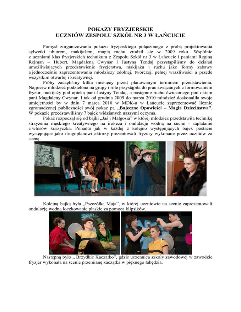 POKAZY FRYZJERSKIE UCZNIÓW ZESPOŁU SZKÓŁ NR 3 W ŁAŃCUCIE Pomysł zorganizowania pokazu fryzjerskiego połączonego z próbą projektowania sylwetki ubiorem, makijażem, magią ruchu zrodził się w 2009 roku. Wspólnie z uczniami klas fryzjerskich technikum z Zespołu Szkół nr 3 w Łańcucie i paniami Reginą Rejman – Hubert, Magdaleną Cwynar i Justyną Tendaj przystąpiliśmy do działań umożliwiających przedstawienie fryzjerstwa, makijażu i ruchu jako formy zabawy a jednocześnie zaprezentowania młodzieży zdolnej, twórczej, pełnej wrażliwości a przede wszystkim otwartej i kreatywnej. Próby zaczęliśmy kilka miesięcy przed planowanym terminem przedstawienia. Najpierw młodzież podzielona na grupy i role przystąpiła do prac związanych z formowaniem fryzur, makijaży pod opieką pani Justyny Tendaj, a następnie ruchu ćwiczonego pod okiem pani Magdaleny Cwynar. I tak od grudnia 2009 do marca 2010 młodzież doskonaliła swoje umiejętności by w dniu 7 marca 2010 w MDK-u w Łańcucie zaprezentować licznie zgromadzonej publiczności swój pokaz pt. „Bajeczne Opowieści – Magia Dzieciństwa”. W pokazie przedstawiliśmy 7 bajek widzianych naszymi oczyma. Pokaz rozpoczął się od bajki „Jaś i Małgosia” w której młodzież przedstawiła technikę strzyżenia męskiego kreatywnego na irokeza i ondulację wodną na sucho - zaplatanie z włosów koszyczka. Ponadto jak w każdej z kolejno występujących bajek postacie występujące jako drugoplanowi aktorzy prezentowali fryzury wykonane przez uczniów za sceną. Kolejną bajką była „Pszczółka Maja”, w której uczniowie na scenie zaprezentowali ondulację wodną loczkowanie płaskie za pomocą klipsików. Następną było „ Brzydkie Kaczątko”, gdzie uczennica szkoły zawodowej w zawodzie fryzjer wykonała na scenie przemianę kaczątka w pięknego łabędzia. Kolejną bajką było budzące zachwyt wśród dzieci „101 Dalmatyńczyków”, gdzie można było ujrzeć ciekawy spektakl w postaci fryzjerstwa i dużej dawki humoru. W drugiej części pokazu mogliśmy zobaczyć takie bajki jak „Kopciuszek”, w której Kopciuszek przeistaczał się na scenie w piękną królewnę, porwaną do tańca przez królewicza. „Calineczka” - czesana była w otoczeniu budzących się niczym ze snu elfów. Ostatnia bajka „Królowa Śniegu” w której panowie fryzjerzy rozbudzali śnieżynki Królowej Śniegu strzyżonej jednocześnie na scenie w budzącego zachwyt irokeza z doczepianymi ogonami z piór. Pokaz skupił wiele osób przy jednej myśli. Uczniowie niemal wszystkie czynności wykonali samodzielnie. Moim marzeniem było i wciąż jest wzmacnianie wiary młodzieży w swoje możliwości. Pokazanie rodzicom jakie zdolne jest ich dziecko, które nie boi się sceny choć nie jest aktorem, potrafi wykonać perfekcyjnie fryzurę i makijaż którego niejedna kosmetyczka mogłaby pozazdrościć, jest otwarte na osoby które wskazują mu drogę. Dziękujemy w tym miejscu wszystkim osobom zaangażowanym w prace nad pokazami a przede wszystkim młodzieży. Tematem tegorocznego pokazu będą emocje - „Oto ja w emocjach”. Prace nad scenariuszem rozpoczęłam właściwie tuż po poprzednim pokazie, gdzie zauważyłam niesamowite emocje młodych ludzi - złość, radość, wiara w siebie, zaufanie, zazdrość, miłość, egoizm, duma… We współpracy z Marią Mokrzycką przygotowałam scenariusz, muzykę, koncepcję strojów, fryzur, z panią Justyną Tendaj makijaż, z panią Magdaleną Cwynar ruch na scenie. W organizację tegorocznego pokazu włączyły się wszystkie nauczycielki przedmiotów fryzjerskich naszej szkoły. Panie Anna Rzeszutek i Elżbieta Kalwas przygotowują pierwszą część wyrażającą dumę, gniew, pychę, radość, swobodę. W części drugiej pani Regina Rejman-Hubert ze mną przygotowują młodzież do zaprezentowania fantazji, zazdrości, namiętności, ulotności, buntu i obłąkania. W pokazie weźmie około 80 osób młodzieży z technikum fryzjerskiego prezentującej na scenie swoje umiejętności takie jak ondulacja wodna, formowanie fryzur wieczorowych, awangardowych z elementem zdobiącym, strzyżenia damskiego i męskiego, farbowanie kreatywne. Dodatkowo przedstawimy samodzielnie wykonane makijaże. Jeśli chcą Państwo zobaczyć jak postrzegają emocje nasi uczniowie fryzurą, makijażem, muzyką i ruchem to serdecznie zapraszamy 6 marca 2011 r. o godzinie 15.00 do MDK-u w Łańcucie na pokaz fryzjerski, organizowany przez uczniów klas technikum fryzjerskiego Zespołu Szkół nr 3 w Łańcucie z okazji Święta Kobiet - „Oto ja w emocjach”. mgr Bernadeta Mokrzycka – Rosół nauczycielka przedmiotów zawodowych fryzjerskich Zespołu Szkół nr 3 w Łańcucie