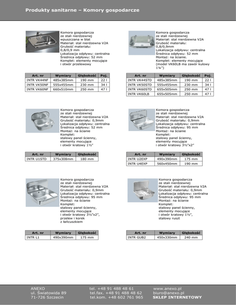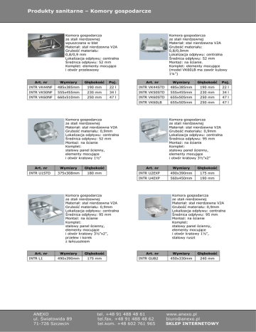 Produkty sanitarne – Komory gospodarcze Komora gospodarcza ze stali nierdzewnej wpuszczana w blat Materiał: stal nierdzewna V2A Grubość materiału: 0,8/0,9 mm Lokalizacja odpływu: centralna Średnica odpływu: 52 mm Komplet: elementy mocujące i otwór przelewowy Komora gospodarcza ze stali nierdzewnej Materiał: stal nierdzewna V2A Grubość materiału: 0,8/0,9mm Lokalizacja odpływu: centralna Średnica odpływu: 52 mm MontaŜ: na ścianie. Komplet: elementy mocujące (model VK60LB ma zawór kulowy 1¼”) Art. nr Wymiary Głębokość Poj. Art. nr Wymiary INTR VK44NF 485x385mm 190 mm 22 l INTR VK44STD 485x385mm 190 mm 22 l INTR VK50NF 555x455mm 230 mm 34 l INTR VK50STD 555x455mm 230 mm 34 l INTR VK60NF 660x510mm 250 mm 47 l INTR VK60STD 655x505mm 250 mm 47 l INTR VK60LB 655x505mm 250 mm 47 l Komora gospodarcza ze stali nierdzewnej Materiał: stal nierdzewna V2A Grubość materiału: 0,9mm Lokalizacja odpływu: centralna Średnica odpływu: 52 mm MontaŜ: na ścianie Komplet: stalowy panel ścienny, elementy mocujące i otwór kratowy 1½” Art. nr INTR U1STD Wymiary Głębokość 375x308mm 180 mm Art. nr Wymiary Głębokość 490x390mm 175 mm ANEXO ul. Światowida 89 71-726 Szczecin Poj. Komora gospodarcza ze stali nierdzewnej Materiał: stal nierdzewna V2A Grubość materiału: 0,9mm Lokalizacja odpływu: centralna Średnica odpływu: 95 mm MontaŜ: na ścianie Komplet: stalowy panel ścienny, elementy mocujące i otwór kratowy 3½”x2” Art. nr Wymiary Głębokość INTR U2EXP 490x390mm 175 mm INTR U4EXP 560x450mm 190 mm Komora gospodarcza ze stali nierdzewnej Materiał: stal nierdzewna V2A Grubość materiału: 0,9mm Lokalizacja odpływu: centralna Średnica odpływu: 95 mm MontaŜ: na ścianie Komplet: stalowy panel ścienny, elementy mocujące i otwór kratowy 3½”x2”, przelew i korek z łańcuszkiem INTR L1 Głębokość Komora gospodarcza ze stali nierdzewnej Materiał: stal nierdzewna V2A Grubość materiału: 0,9mm Lokalizacja odpływu: centralna Średnica odpływu: 95 mm MontaŜ: na ścianie Komplet: stalowy panel ścienny, elementy mocujące i otwór kratowy 1½”, stalowy ruszt Art. nr INTR GUB2 tel. +48 91 488 48 61 tel.fax. +48 91 488 48 62 tel.kom. +48 602 761 965 Wymiary Głębokość 450x330mm 240 mm www.anexo.pl [email protected] SKLEP INTERNETOWY