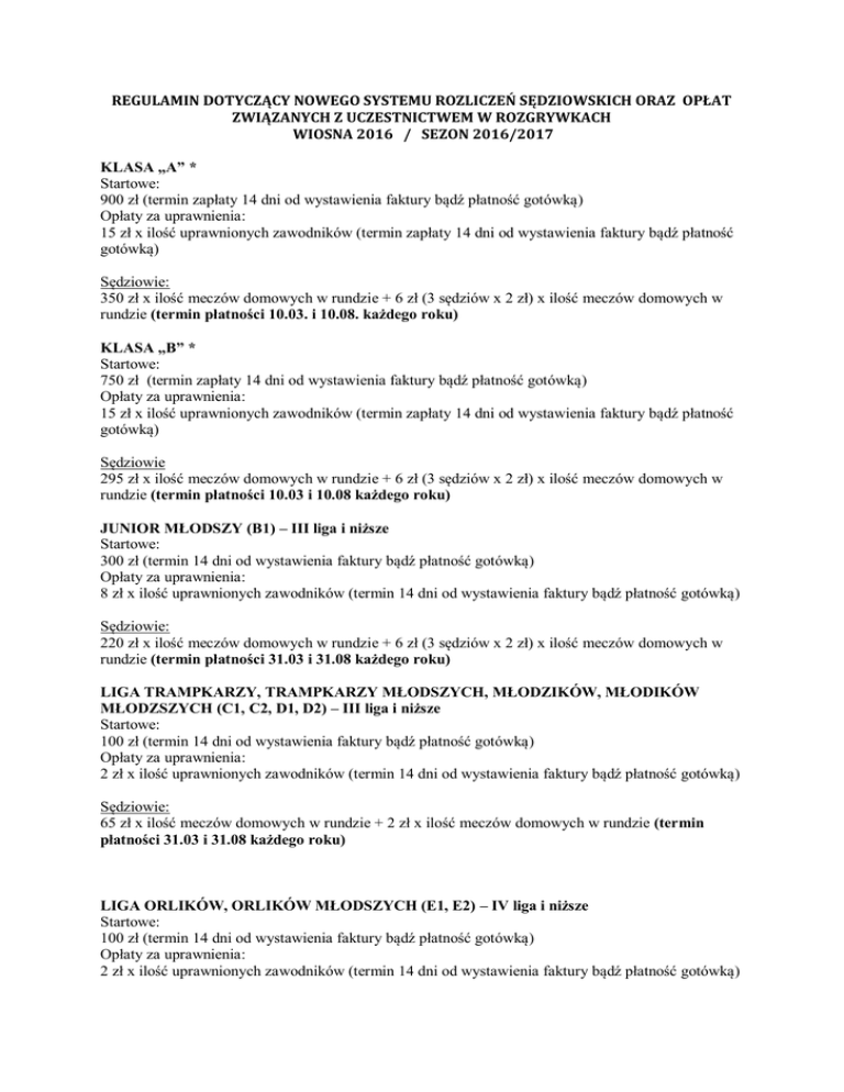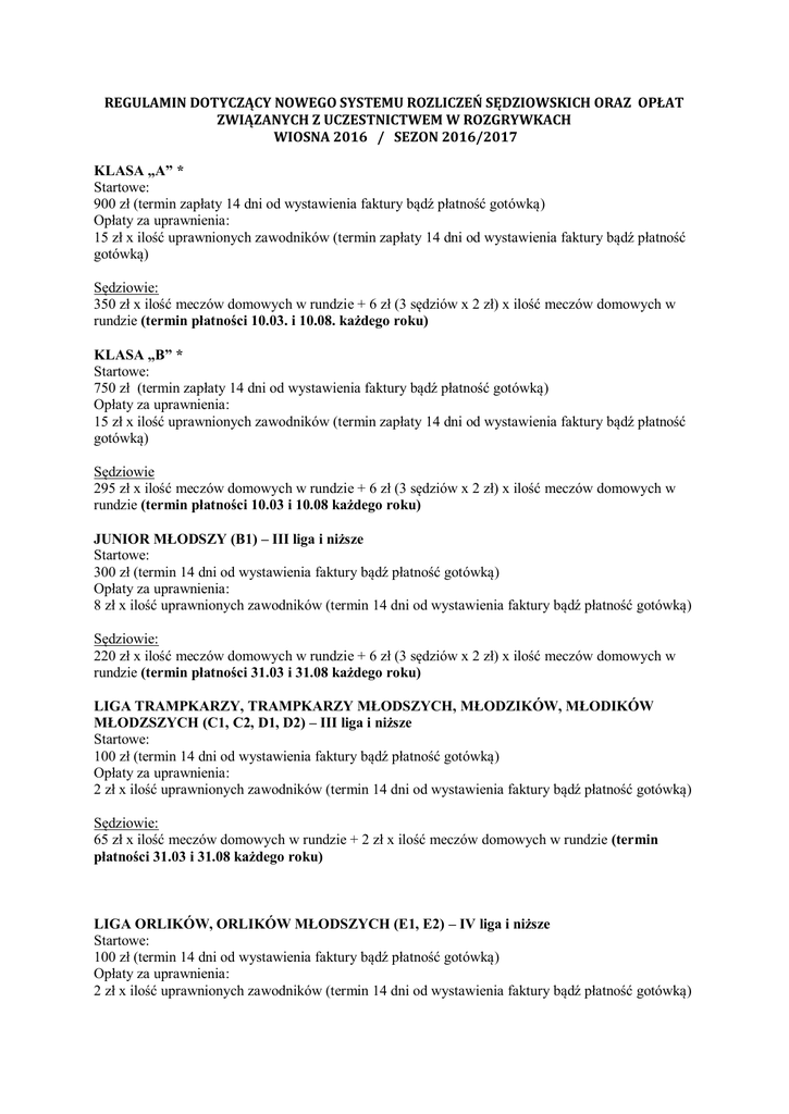 REGULAMIN DOTYCZĄCY NOWEGO SYSTEMU ROZLICZEŃ SĘDZIOWSKICH ORAZ OPŁAT ZWIĄZANYCH Z UCZESTNICTWEM W ROZGRYWKACH WIOSNA 2016 / SEZON 2016/2017 KLASA „A” * Startowe: 900 zł (termin zapłaty 14 dni od wystawienia faktury bądź płatność gotówką) Opłaty za uprawnienia: 15 zł x ilość uprawnionych zawodników (termin zapłaty 14 dni od wystawienia faktury bądź płatność gotówką) Sędziowie: 350 zł x ilość meczów domowych w rundzie + 6 zł (3 sędziów x 2 zł) x ilość meczów domowych w rundzie (termin płatności 10.03. i 10.08. każdego roku) KLASA „B” * Startowe: 750 zł (termin zapłaty 14 dni od wystawienia faktury bądź płatność gotówką) Opłaty za uprawnienia: 15 zł x ilość uprawnionych zawodników (termin zapłaty 14 dni od wystawienia faktury bądź płatność gotówką) Sędziowie 295 zł x ilość meczów domowych w rundzie + 6 zł (3 sędziów x 2 zł) x ilość meczów domowych w rundzie (termin płatności 10.03 i 10.08 każdego roku) JUNIOR MŁODSZY (B1) – III liga i niższe Startowe: 300 zł (termin 14 dni od wystawienia faktury bądź płatność gotówką) Opłaty za uprawnienia: 8 zł x ilość uprawnionych zawodników (termin 14 dni od wystawienia faktury bądź płatność gotówką) Sędziowie: 220 zł x ilość meczów domowych w rundzie + 6 zł (3 sędziów x 2 zł) x ilość meczów domowych w rundzie (termin płatności 31.03 i 31.08 każdego roku) LIGA TRAMPKARZY, TRAMPKARZY MŁODSZYCH, MŁODZIKÓW, MŁODIKÓW MŁODZSZYCH (C1, C2, D1, D2) – III liga i niższe Startowe: 100 zł (termin 14 dni od wystawienia faktury bądź płatność gotówką) Opłaty za uprawnienia: 2 zł x ilość uprawnionych zawodników (termin 14 dni od wystawienia faktury bądź płatność gotówką) Sędziowie: 65 zł x ilość meczów domowych w rundzie + 2 zł x ilość meczów domowych w rundzie (termin płatności 31.03 i 31.08 każdego roku) LIGA ORLIKÓW, ORLIKÓW MŁODSZYCH (E1, E2) – IV liga i niższe Startowe: 100 zł (termin 14 dni od wystawienia faktury bądź płatność gotówką) Opłaty za uprawnienia: 2 zł x ilość uprawnionych zawodników (termin 14 dni od wystawienia faktury bądź płatność gotówką) Sędziowie: 40 zł x ilość meczów domowych w rundzie + 2 zł x ilość meczów domowych w rundzie (termin płatności 31.03 i 31.08 każdego roku) LIGA ŻAKÓW, ŻAKÓW MŁODSZYCH (F1, F2) – IV liga i niższe Startowe: 200 zł (termin 14 dni od wystawienia faktury bądź płatność gotówką) Opłaty za uprawnienia: Brak opłat. Sędziowie: Brak opłat – sędziują trenerzy. ----------------------------------------------------------------------------------III LIGA 1560,00 zł + 8 zł (kwity) IV LIGA 600,00 zł + 6 zł Klasa Okręgowa 455,00 zł + 6 zł I Liga Wojewódzka Juniorów Starszych 395,00 zł + 6 zł I LW Juniorów Młodszych oraz II LW Juniorów Starszych 315,00 zł + 6 zł III i IV LW Junior A1, LW Junior B1 (wszyscy Juniorzy) 220,00 zł + 6 zł (cena z obserwatorem) UWAGI: Brak wpłat (uprawnienia, startowe itp.) za poprzednią rundę – odmowa obsługi klubu w trwającej i każdej następnej rundzie do momentu uregulowania zaległości. Brak wpłaty opłat sędziowskich we wskazanym na rachunku terminie płatności skutkuje usunięciem Klubu z systemu rozliczeń sędziowskich. Opłata startowa za zgłoszenie drużyny do sezonu rozgrywkowego po terminie zgłoszeń (lipiec) każdego sezonu i po 20 lutym każdej rundy wiosennej są wyższe o 100%. ** Opłata za uprawnienie Zawodnika widniejącego w Klubie danego sezonu dokonywane po rozpoczęciu sezonu rozgrywkowego są wyższe o 100%. Za rozpoczęcie sezonu uważa się terminarzowe rozpoczęcie rozgrywek w rundzie jesiennej i wiosennej w poszczególnych klasach rozgrywkowych. ** Wysokość ekwiwalentów sędziowskich wynika z Uchwały Zarządu Śl.ZPN. W przypadku zmiany stawek każdorazowo uwzględniane to będzie w algorytmie. W przypadku wycofania drużyny w trakcie rozgrywek opłata za usługi sędziowskie za dany Klub trafia do Kolegium Sędziów na cele szkoleniowe. Na koniec każdej z rund następuje rozliczenie Podokręgu z klubami i ewentualne różnice (np. nieodbyte mecze) zaliczane są na poczet następnej rundy lub zwracane na konto klubu. UZASADNIENIE CELOWOŚCI: W celu uproszczenia klubom funkcjonowania na szczeblu Podokręgu Katowice, Zarząd proponuje przejęcie przez biuro Podokręgu Katowice obowiązków wynikających z rozliczania rachunków sędziowskich. W tym celu od sezonu 2016/2017 we wszystkich rozgrywkach prowadzonych przez Podokręg Katowice Klub nie będzie opłacał sędziów po zawodach. Opłaty za usługi sędziowskie uiszczane będą do kasy lub na konto Podokręgu Katowice przed rozpoczęciem sezonu. Opłata sędziowska jest bezwzględnie konieczna w celu uczestniczenia w rozrywkach, kluby bez względu na sytuację finansową regulują rachunki sędziowskie po meczu. Zmiana sposobu finansowania w praktyce nie spowoduje wzrostu obciążeń klubu. Podokręg Katowice bierze na siebie obsługę rachunków sędziowskich, obowiązek odprowadzania podatków za rachunki sędziowskie, regulowania wynagrodzeń sędziom oraz obowiązek sporządzania i wysyłki rocznych zeznań podatkowych dla sędziów. Nie będzie istniał obowiązek opłacania sędziów po meczach, co spowoduje spadek zagrożenia korupcyjnego oraz usprawni pracę trenerów i kierowników drużyn. Opłata 2 zł za jeden rachunek sędziowski to koszt obsługi rachunków sędziowskich przez biuro Podokręgu Katowice, w tym wypłaty na konta sędziów, sporządzanie dokumentacji i rozliczanie roczne. PODSUMOWANIE: Korzyści dla klubów: Jasne zasady rozliczana rachunków za usługi sędziowskie Znaczące ograniczenie ilość dokumentów związanych z obsługą meczów Brak obowiązku regulowania rachunków sędziowskich bezpośrednio po meczach Likwidacja dla klubów kosztów obsługi rachunków sędziowskich polegających na wypłacie ekwiwalentów sędziowskich, roz