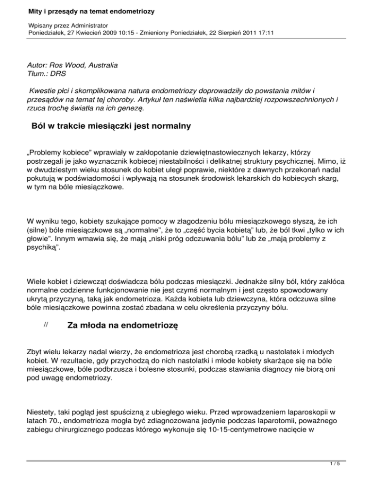 Mity i przesądy na temat endometriozy Wpisany przez Administrator Poniedziałek, 27 Kwiecień 2009 10:15 - Zmieniony Poniedziałek, 22 Sierpień 2011 17:11 Autor: Ros Wood, Australia Tłum.: DRS Kwestie płci i skomplikowana natura endometriozy doprowadziły do powstania mitów i przesądów na temat tej choroby. Artykuł ten naświetla kilka najbardziej rozpowszechnionych i rzuca trochę światła na ich genezę. Ból w trakcie miesiączki jest normalny „Problemy kobiece” wprawiały w zakłopotanie dziewiętnastowiecznych lekarzy, którzy postrzegali je jako wyznacznik kobiecej niestabilności i delikatnej struktury psychicznej. Mimo, iż w dwudziestym wieku stosunek do kobiet uległ poprawie, niektóre z dawnych przekonań nadal pokutują w podświadomości i wpływają na stosunek środowisk lekarskich do kobiecych skarg, w tym na bóle miesiączkowe. W wyniku tego, kobiety szukające pomocy w złagodzeniu bólu miesiączkowego słyszą, że ich (silne) bóle miesiączkowe są „normalne”, że to „część bycia kobietą” lub, że ból tkwi „tylko w ich głowie”. Innym wmawia się, że mają „niski próg odczuwania bólu” lub że „mają problemy z psychiką”. Wiele kobiet i dziewcząt doświadcza bólu podczas miesiączki. Jednakże silny ból, który zakłóca normalne codzienne funkcjonowanie nie jest czymś normalnym i jest często spowodowany ukrytą przyczyną, taką jak endometrioza. Każda kobieta lub dziewczyna, która odczuwa silne bóle miesiączkowe powinna zostać zbadana w celu określenia przyczyny bólu. // Za młoda na endometriozę Zbyt wielu lekarzy nadal wierzy, że endometrioza jest chorobą rzadką u nastolatek i młodych kobiet. W rezultacie, gdy przychodzą do nich nastolatki i młode kobiety skarżące się na bóle miesiączkowe, bóle podbrzusza i bolesne stosunki, podczas stawiania diagnozy nie biorą oni pod uwagę endometriozy. Niestety, taki pogląd jest spuścizną z ubiegłego wieku. Przed wprowadzeniem laparoskopii w latach 70., endometrioza mogła być zdiagnozowana jedynie podczas laparotomii, poważnego zabiegu chirurgicznego podczas którego wykonuje się 10-15-centymetrowe nacięcie w 1/5 Mity i przesądy na temat endometriozy Wpisany przez Administrator Poniedziałek, 27 Kwiecień 2009 10:15 - Zmieniony Poniedziałek, 22 Sierpień 2011 17:11 podbrzuszu. Wysokie ryzyko i koszty laparotomii sprawiły, że była ona traktowana jako ostateczność u kobiet z najpoważniejszymi objawami, które miały już rodzenie dzieci za sobą. Ponieważ operowano tylko kobiety w wieku od trzydziestu do czterdziestu-paru lat, chorobę odnajdywano tylko u kobiet właśnie w tym przedziale wiekowym. Niemniej jednak, utarło się „przekonanie”, że endometrioza jest chorobą kobiet po trzydziestce. Dopiero w latach 70. i 80. z wprowadzeniem laparoskopii w celu badania kobiet z problemami z płodnością, ginekolodzy zaczęli diagnozować tę chorobę u kobiet przed trzydziestką i tuż po trzydziestce. Jednak nadal uważano takie znaleziska za przypadek. Świadomość, że endometriozę można znaleźć u nastolatek i młodych kobiet pojawiła się w wyniku badań przeprowadzonych przez międzynarodowe grupy wsparcia dla chorych z endometriozą. Grupy ze Stanów Zjednoczonych, Wielkiej Brytanii i Australii przeprowadziły badania swoich członkiń w połowie lat 80. Podczas badania pytano kobiety kiedy pojawiły się u nich pierwsze objawy endometriozy i kiedy zostały zdiagnozowane. Badania przeprowadzone przez nasze Stowarzyszenie wykazały, że mimo, że prawie 60% kobiet zostało zdiagnozowanych w wieku 25-35 lat, 43% z nich doświadczyło swoich pierwszych symptomów jako nastolatki. Wyniki naszych badań były podobne do tych przeprowadzonych przez grupy z USA i Wielkiej Brytanii. Na szczęście w latach 90. te wyniki badań przyciągnęły uwagę paru wybitnych ginekologów. Doktor Marc Laufer ze Szpitala Dziecięcego w Bostonie (Children’s Hospital Boston) przeprowadził badania na nastolatkach z chronicznymi bólami podbrzusza. Jedno z badań wykazało, że nastolatki, których przewlekłe bóle podbrzusza nie zmniejszały się po stosowaniu doustnej antykoncepcji hormonalnej i niesterydowych leków przeciwzapalnych, takich jak Ponstan, miały wysoką częstotliwość występowania endometriozy – aż 70%. Podobne badania, obejmujące zdiagnozowane kobiety ze Stanów Zjednoczonych i Wielkiej Brytanni, przeprowadził zespół prowadzony przez doktora Davida Barlowa i doktora Stephena Kennedy’ego z Uniwersytetu Oksfordzkiego w Anglii. Badania wykazały, że średni wiek wystąpienia pierwszych objawów to 22 lata, a przedział wiekowy to 10-46 lat. Tak więc nastolatki i młode kobiety po dwudziestce NIE są za młode by cierpieć na endometriozę. Kuracje hormonalne prowadzą do wyleczenia choroby 2/5 Mity i przesądy na temat endometriozy Wpisany przez Administrator Poniedziałek, 27 Kwiecień 2009 10:15 - Zmieniony Poniedziałek, 22 Sierpień 2011 17:11 Przez wiele lat endometriozę „leczyło się” syntetycznymi lekami hormonalnymi, takimi jak pigułki antykoncepcyjne, Provera, Danazol i Zoladex. Jednakże ostatnio staje się coraz bardziej oczywiste, że leczenie hormonalne nie przynosi długoterminowych skutków jeśli chodzi o stan samej choroby. One jedynie tłumią (wyciszają) objawy, ale tylko podczas przyjmowania leków. Jednak gdy działanie leku mija, objawy powracają. Oznacza to, że leczenie hormonalne nie odgrywa roli w leczeniu (pozbywaniu się) endometriozy. Jeśli chcemy ostatecznie pozbyć się choroby, jedyną skuteczną metodą jest zabieg chirurgiczny przeprowadzony przez ginekologa z rozległą wiedzą i doświadczeniem w zakresie specjalistycznych technik stosowanych w przypadku endometriozy. To oznacza również, że leczenie hormonalne nie powinno być stosowane w celu zwiększenia szans kobiet na zajście w ciążę. Nie tylko nie jest ono skuteczne, ale dodatkowo skraca czas, który kobieta ma 